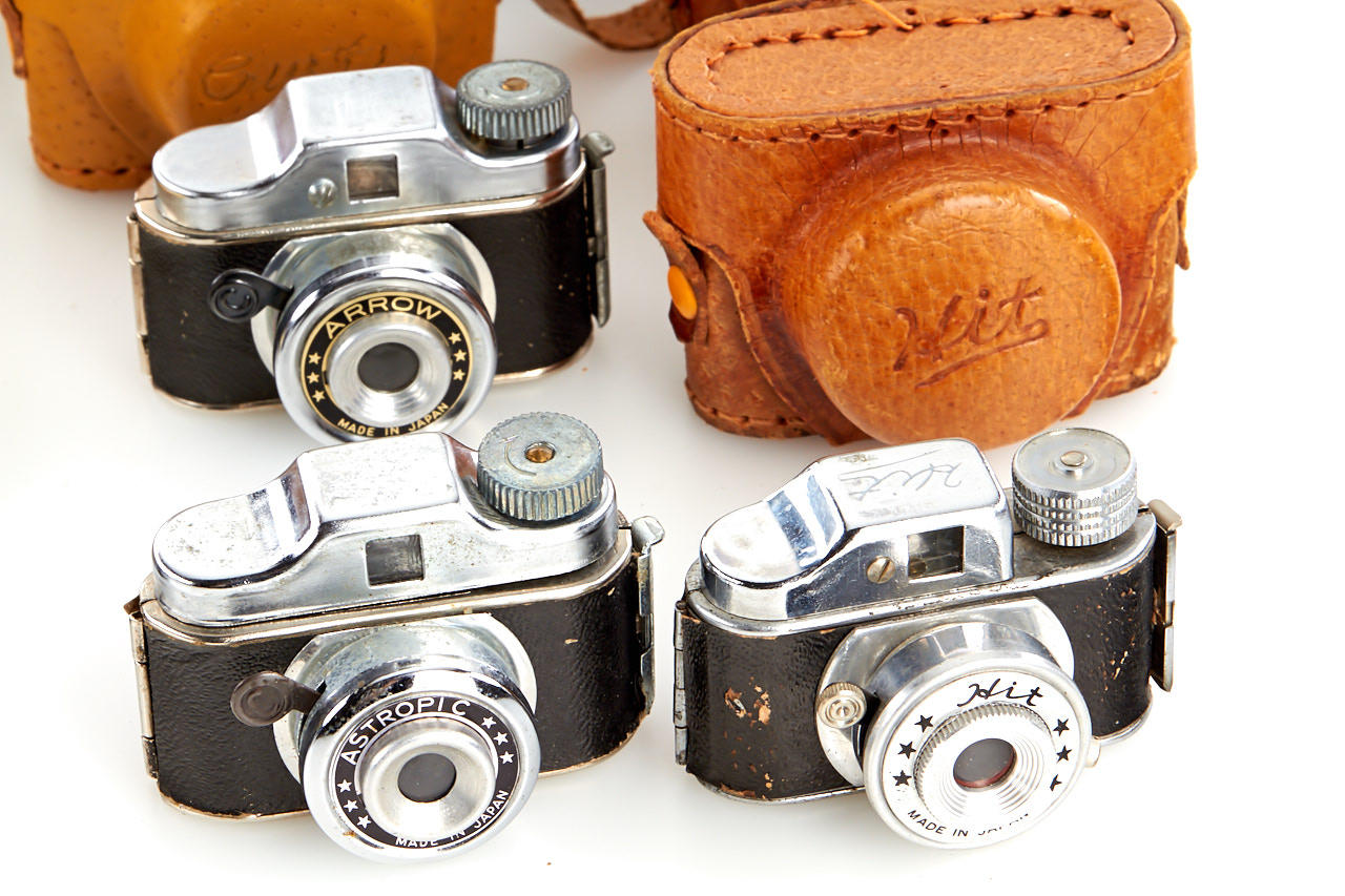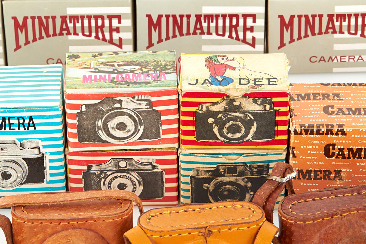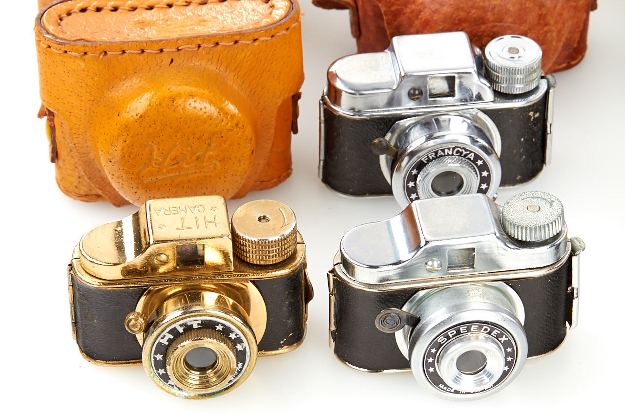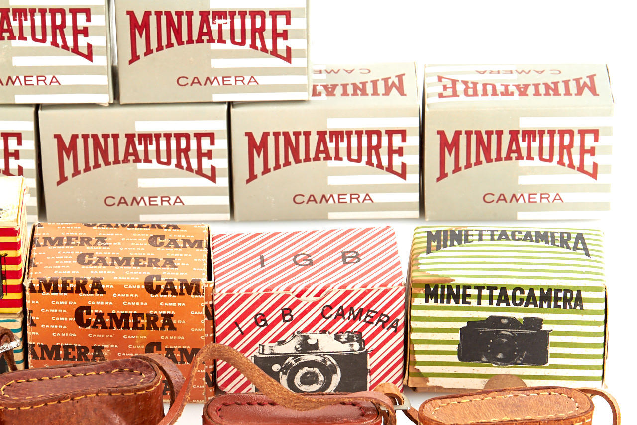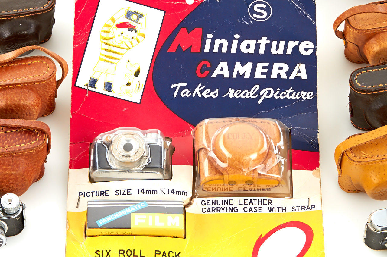 collection of 50 Hit-type subminiature cameras, various names like Arrow, Beica, Crown, Emson, Homer, Shalco etc. many with leather cases an some with boxes, 11 cameras simply named 'Hit', all in excellent to mint condition