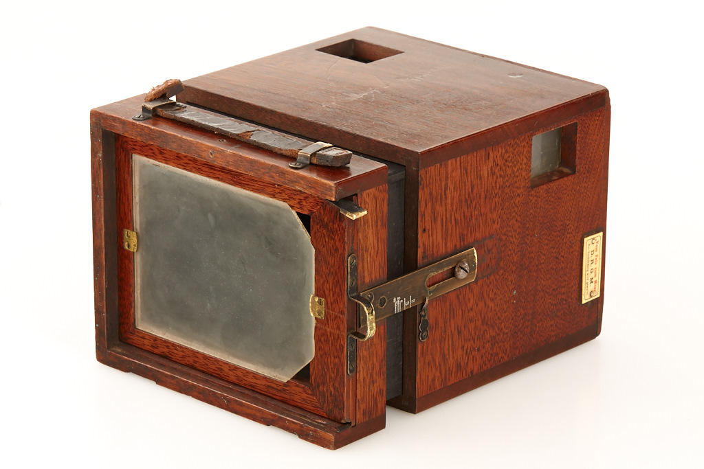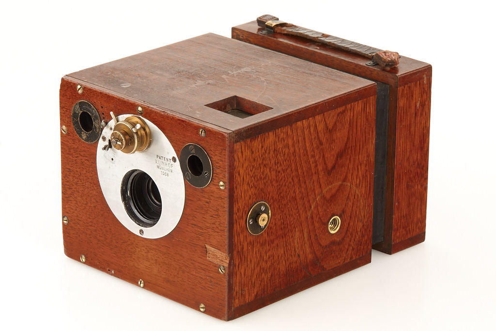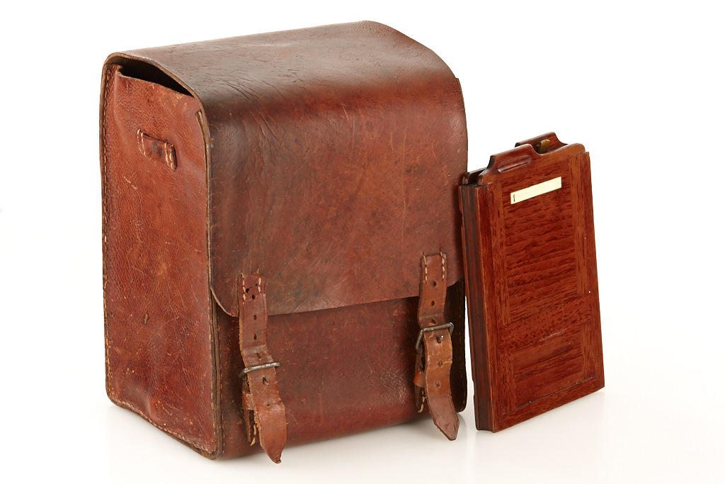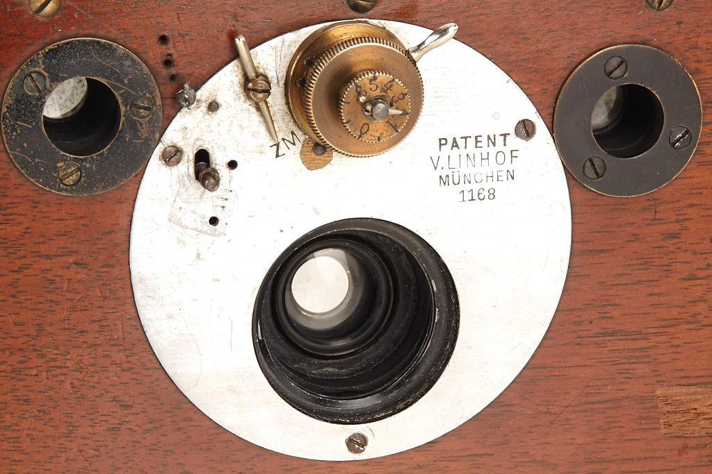 very rare German detective sliding box camera made by Hoerth, Daeschner & Co, Karlsruhe, for 9x12cm exposure on 6 double plate film holders, two reflex finders, original ground glass, Linhof Patent shutter engraved 'PATENT V.LINHOF MÜNCHEN 1168', in fine original condition, case