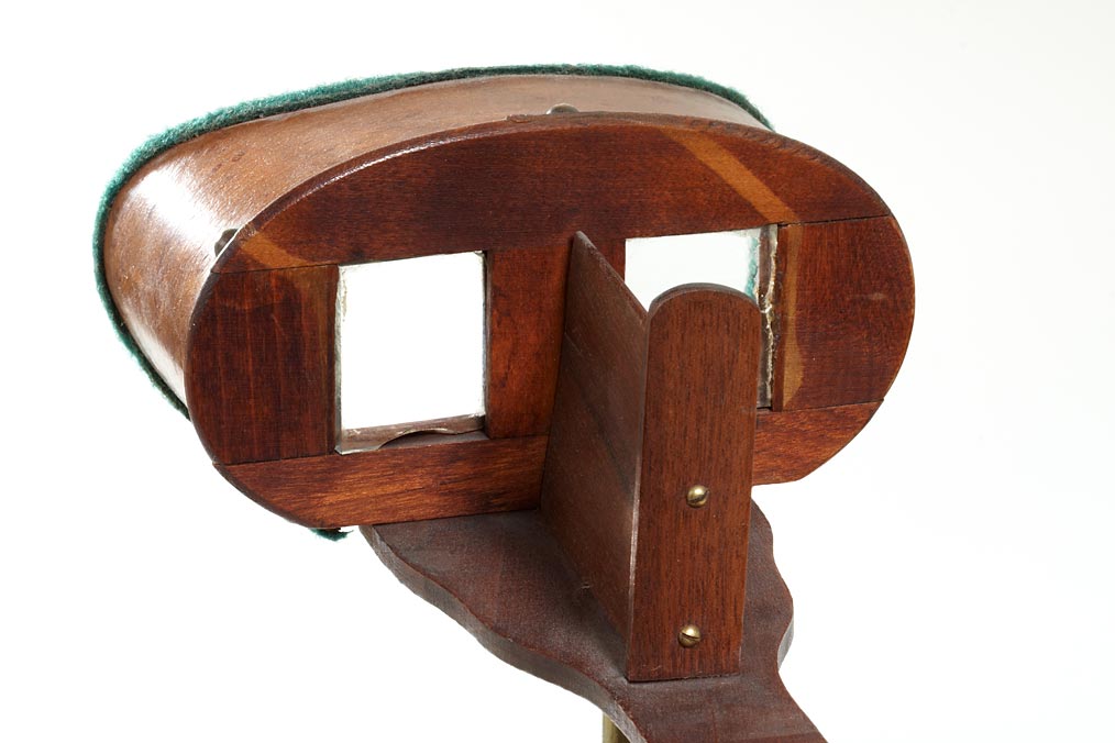 two Holmes type viewers, one on a wooden stand, the other one on a brass stand with a porcelain base.(2)