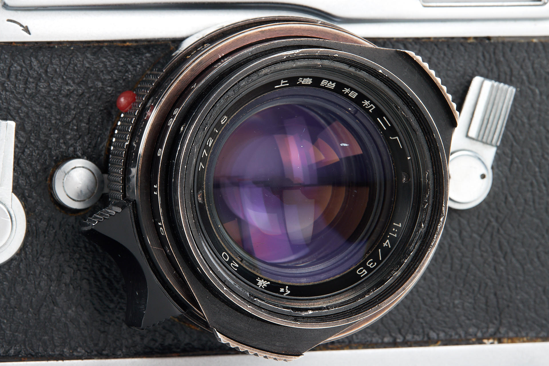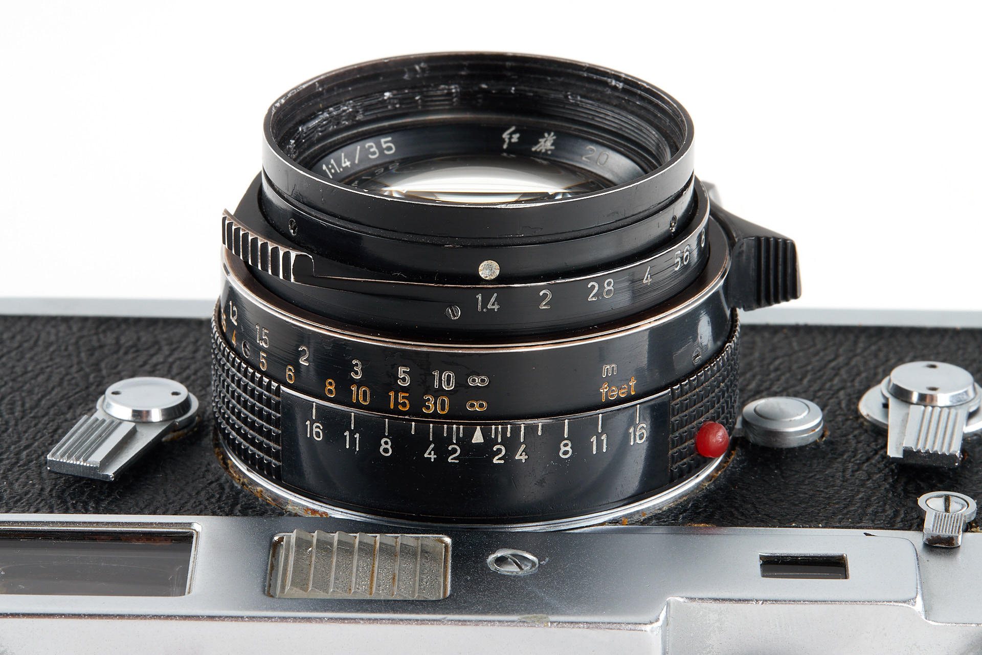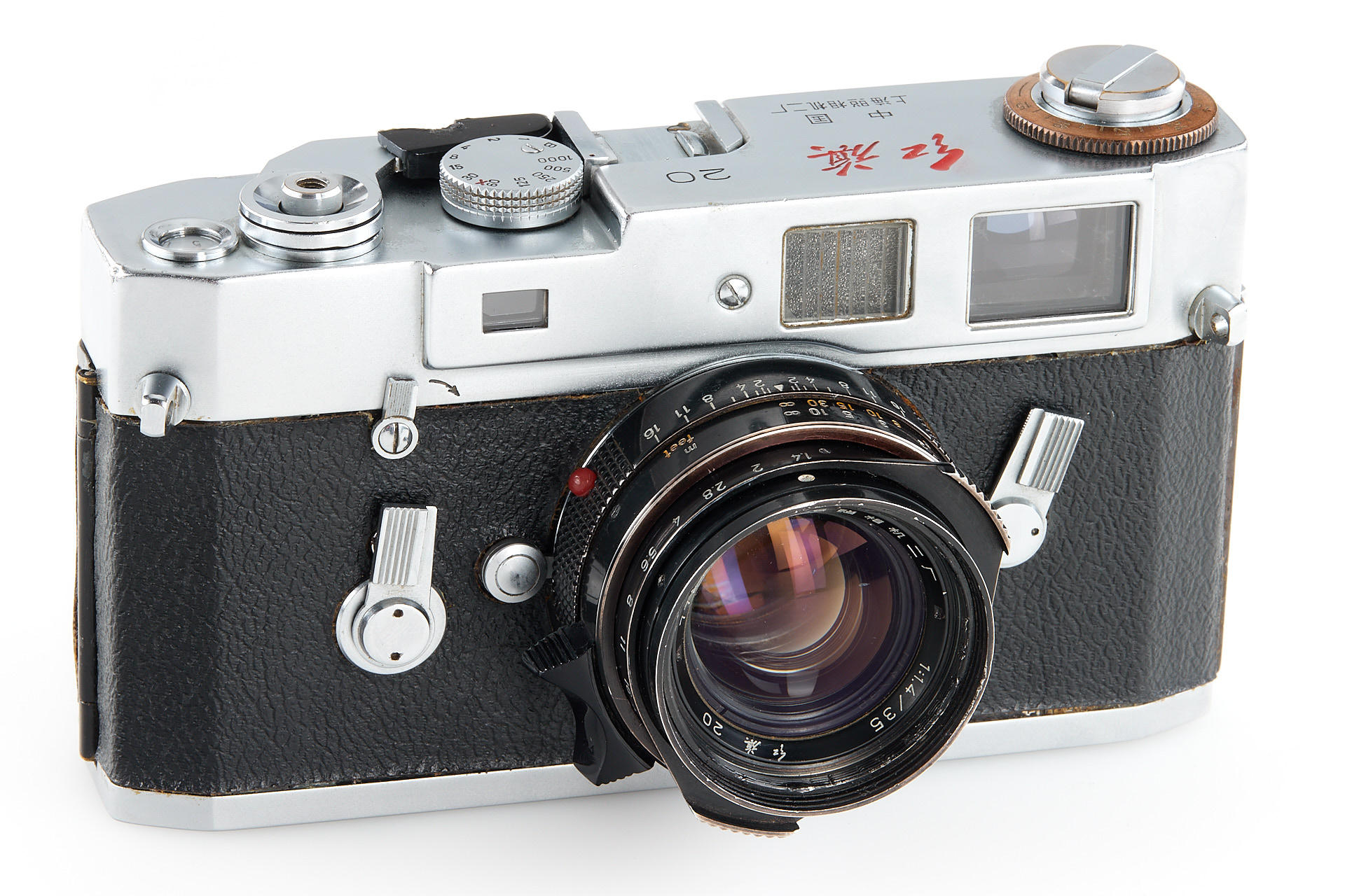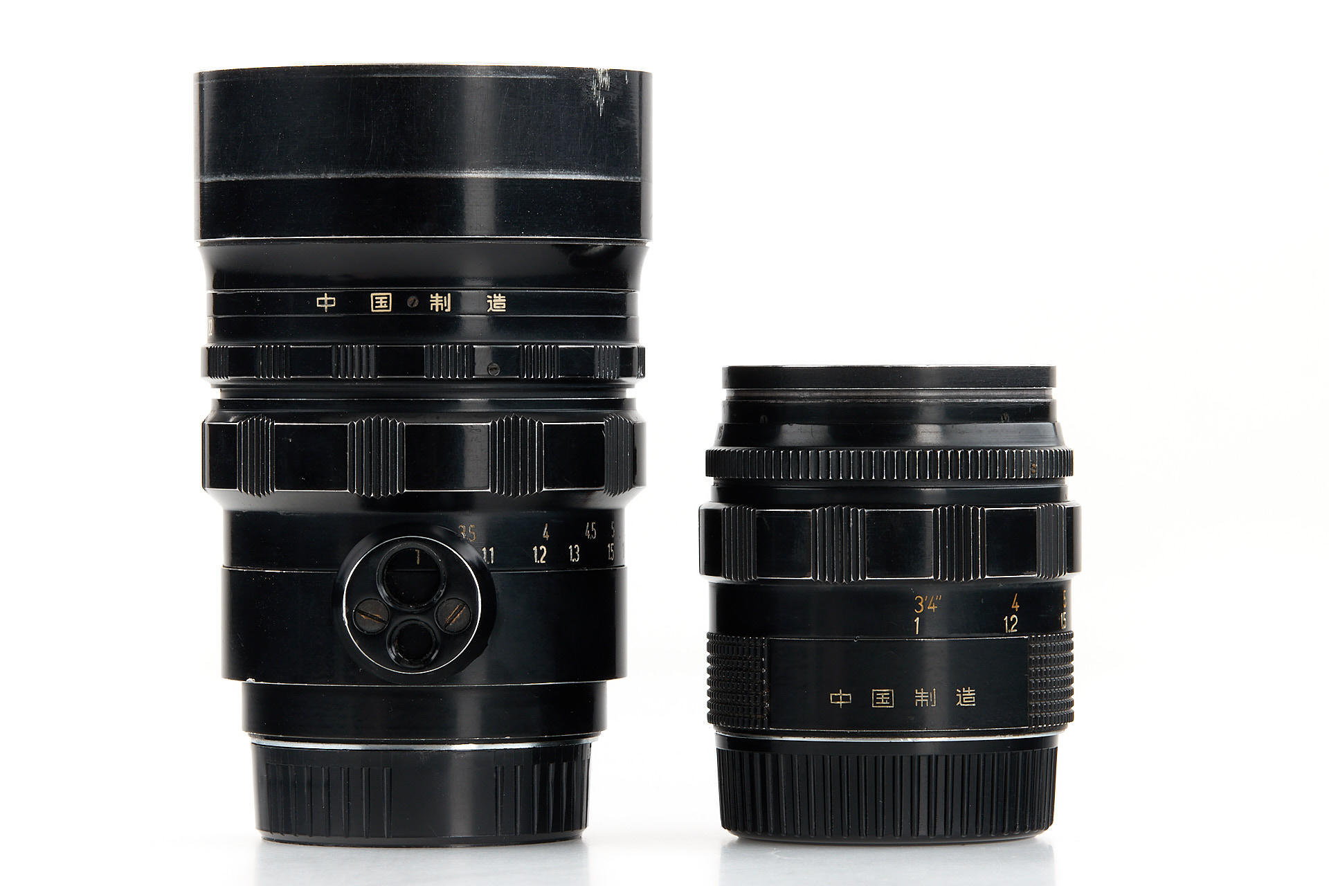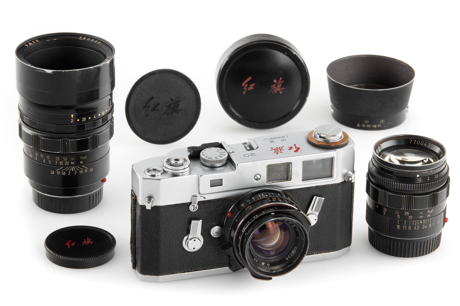 Very rare Chinese Leica M4/M5 copy, less than 200 cameras have been produced by direct order of the government as a demonstration of the capabilities of the Chinese industry, none of these has been sold to the public. This example is in good original condition and in working order, it comes with a complete set of matching lenses: 1.4/35mm no.77218 (Summilux 35mm copy, very good optics, front cap), 1.4/50mm no.770043 (Summilux copy, clean optics - only a few hairline marks, original hood and front cap), 2/90mm no.760028 (Summicron copy, clean lenses - only a few hairline marks, front cap), a rare opportunity for every camera collector!