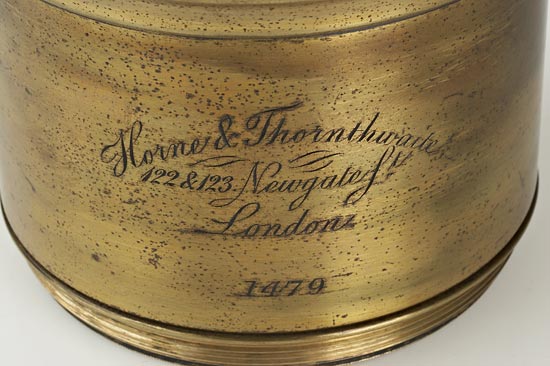 engraved "Horne & Thornthwaite, 122 & 123 Newgate St., London", rack-and-pinion focusing. 7 3/4" high. Ex Spira Collection. According to the London Post Office Directories Horne & Thorthwaite operated at 121 and 123 Newgate St. in 1855-1857 and again in 1867-1874