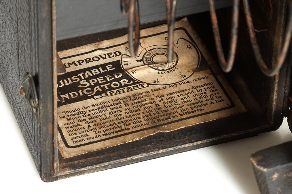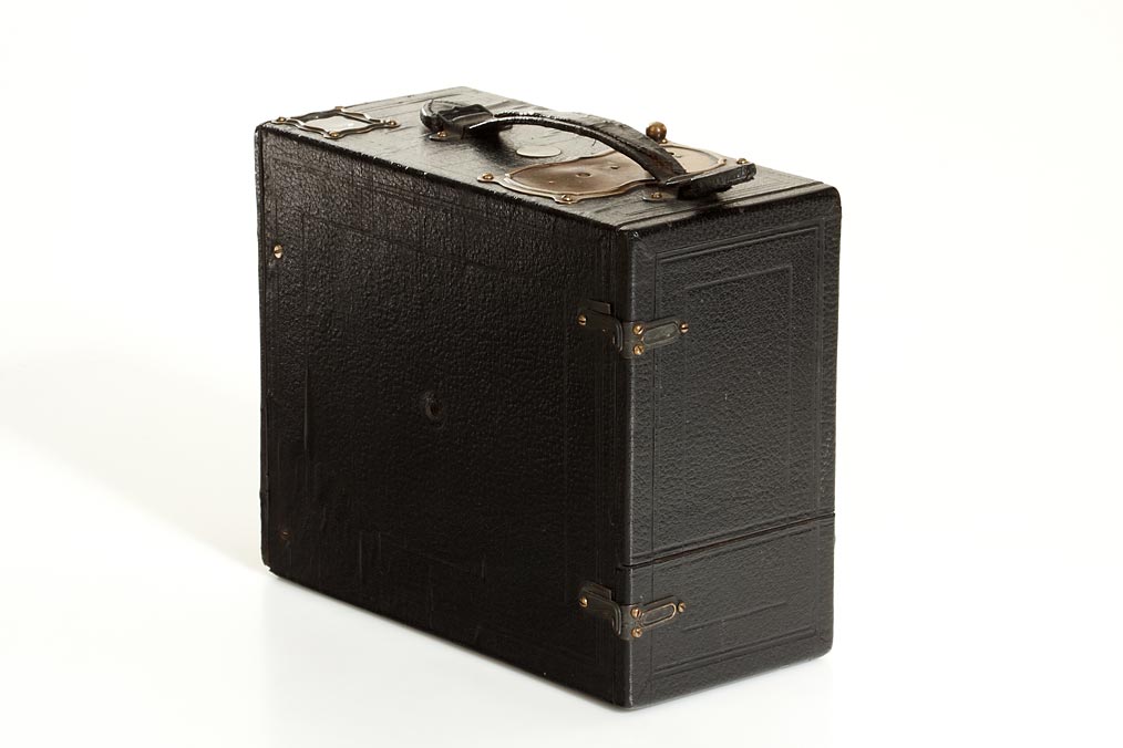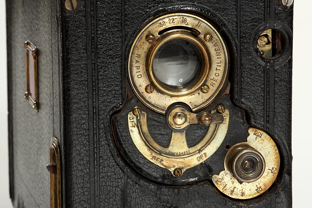 for 12 plates 3 1/4 x 4 1/4", plate box camera with leatherette covering, brass fittings, Rapid Rectilinear lens with iris diaphragm, three close up lenses for 3,6 or 9 feet, in nice condition