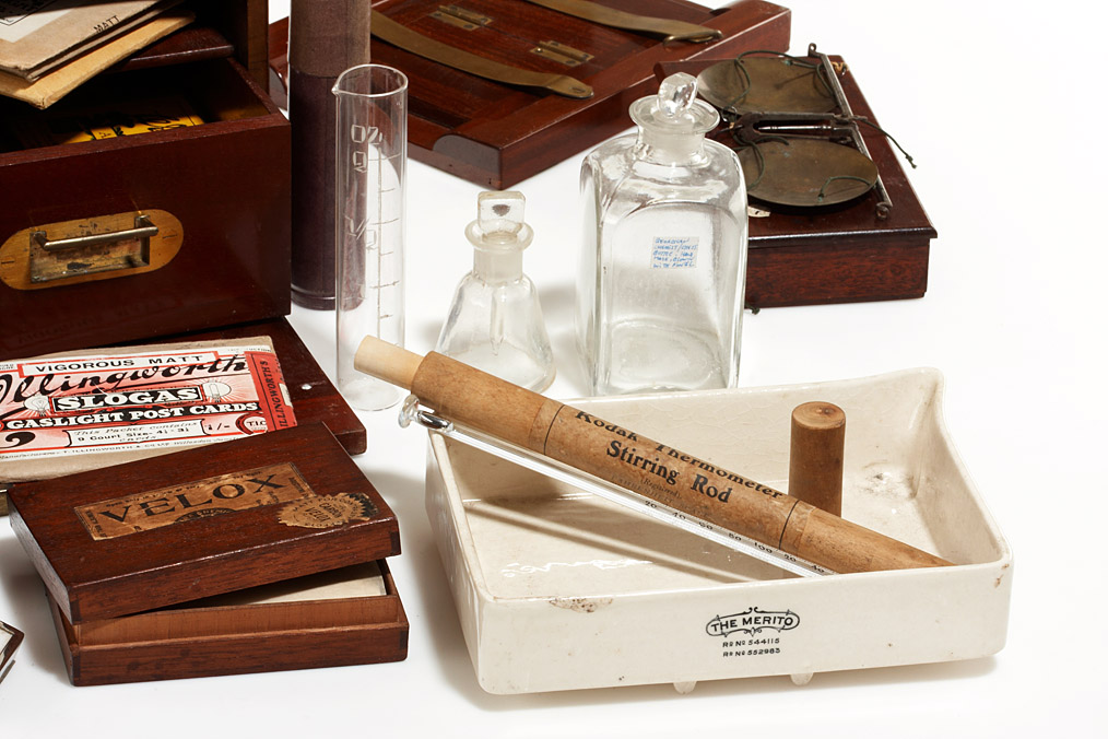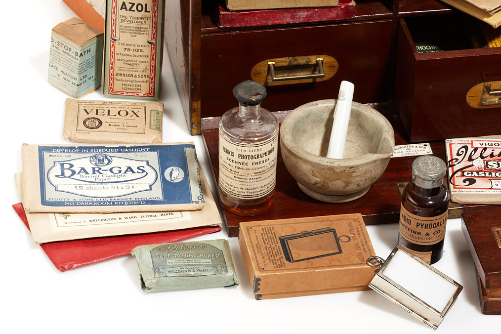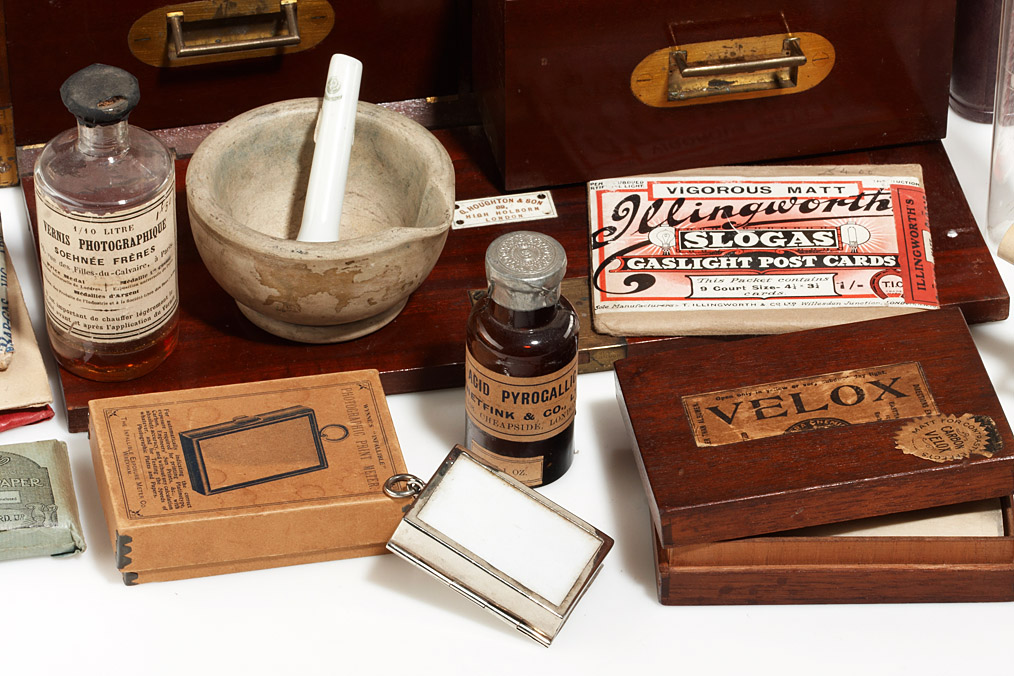 polished mahogany with inset lacquered-brass binding and fittings, the hinged top lifting to reveal a sectioned tray holding photographic chemical jars some with labels, pestle and morter, chemical balance, the front flap opening to reveal four sections, two holding mahogany half-plate printing frames, two drawers holding dish, printing papers and plates - the outfit is in fantastic condition and a real museum piece - ex Barron collection