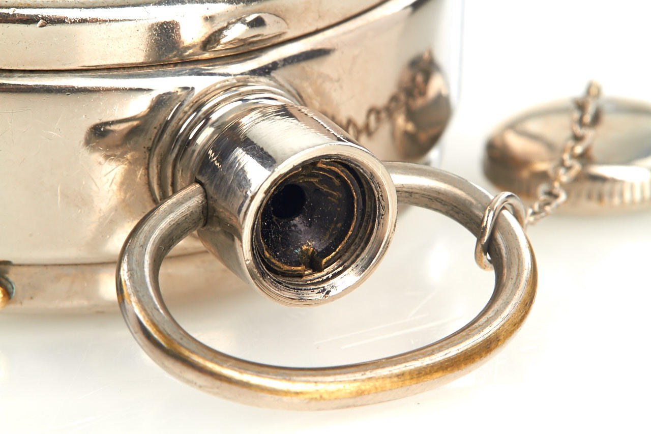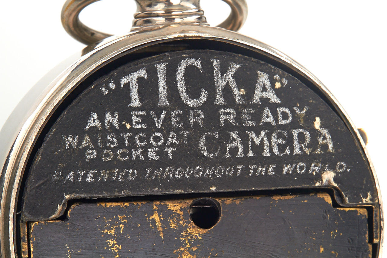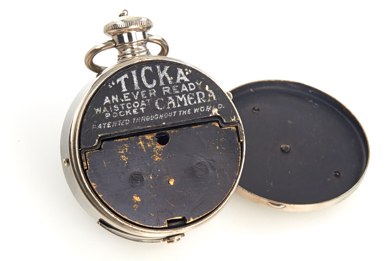 very rare original version of the pocket-watch detective camera (hands on the face show the viewing angle of the lens), in very fine condition with cap and chain