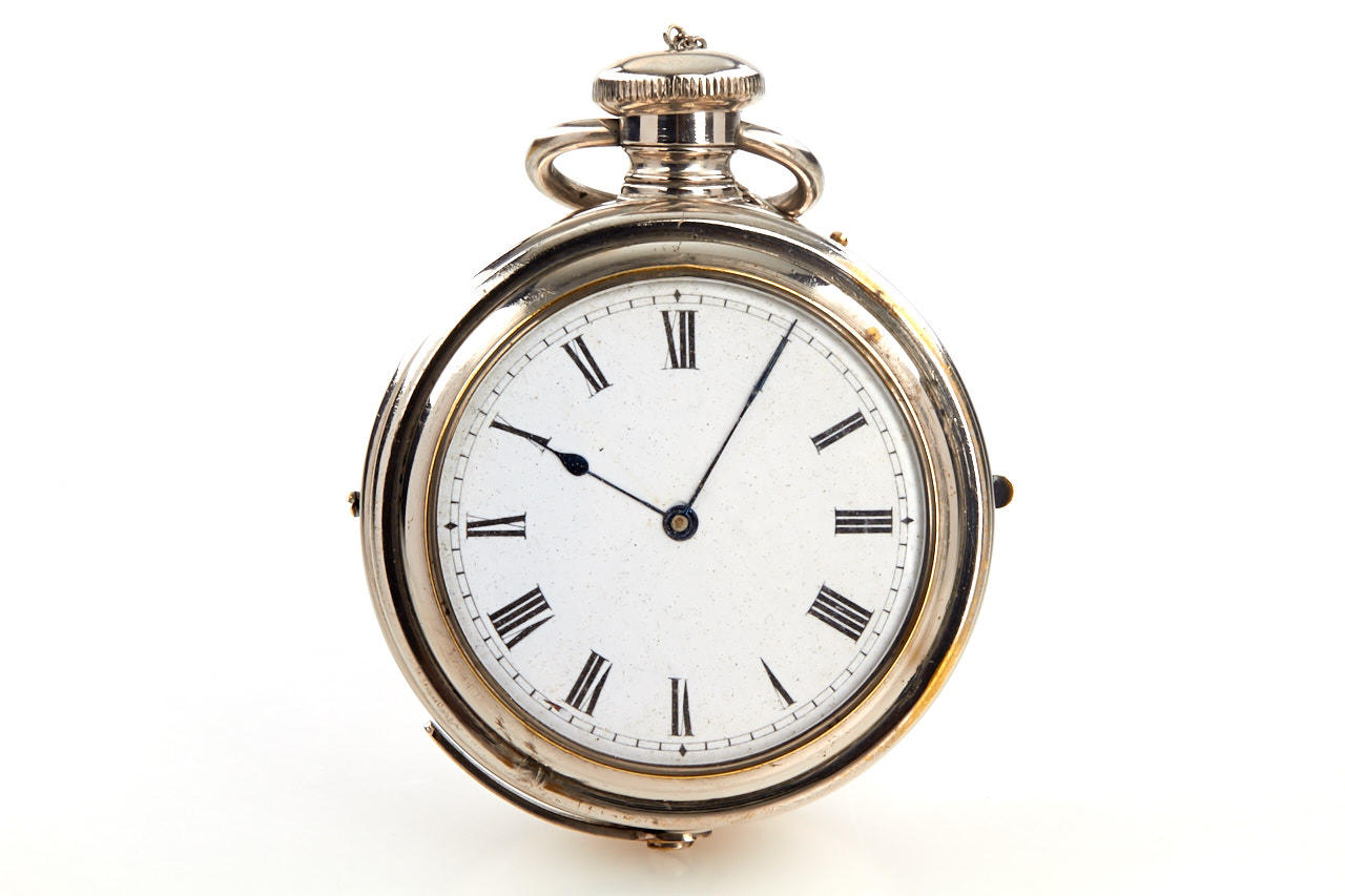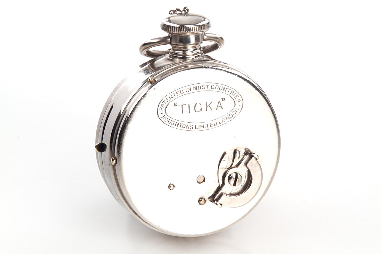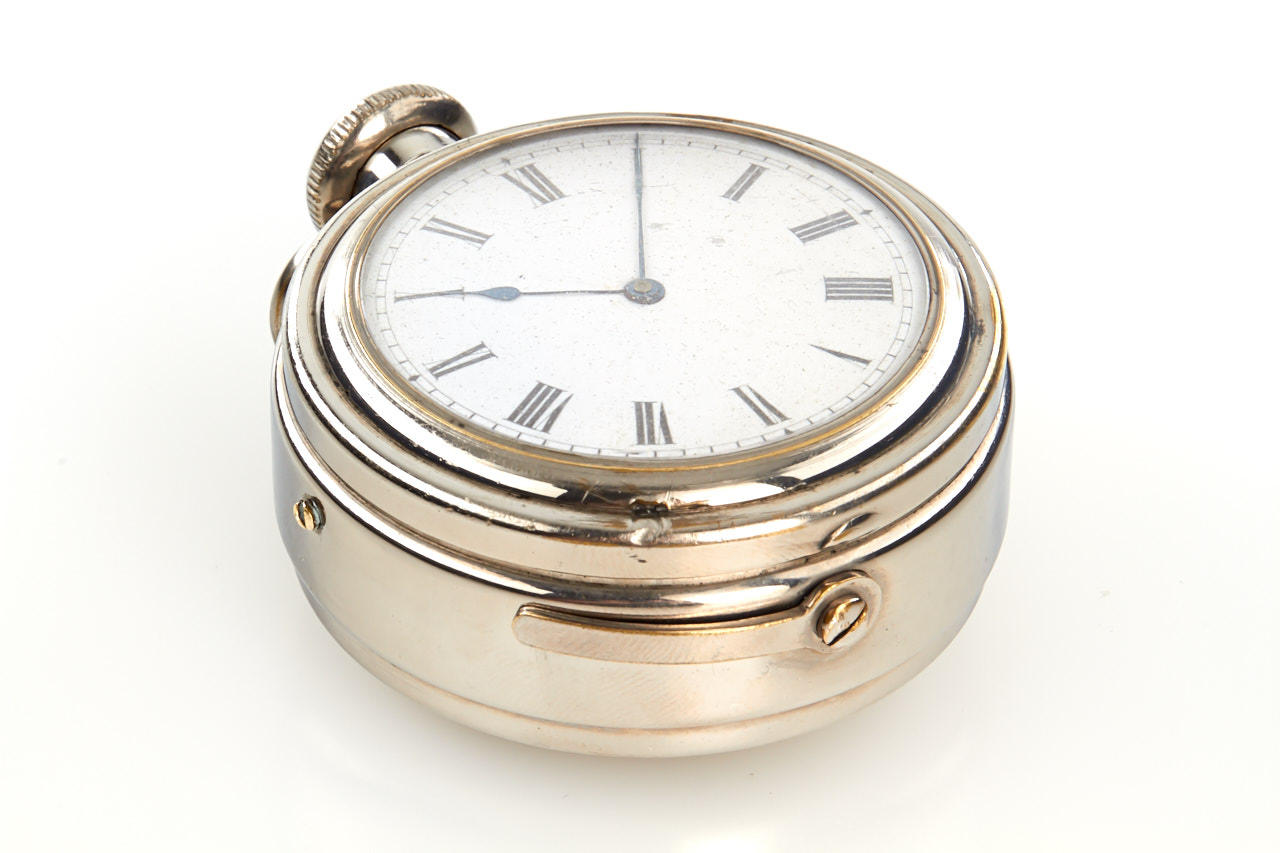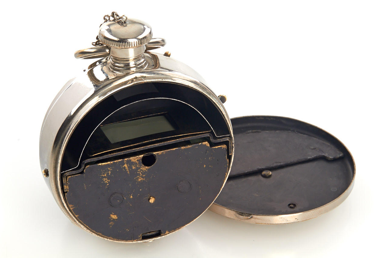 very rare original version of the pocket-watch detective camera (hands on the face show the viewing angle of the lens), in very fine condition with cap and chain