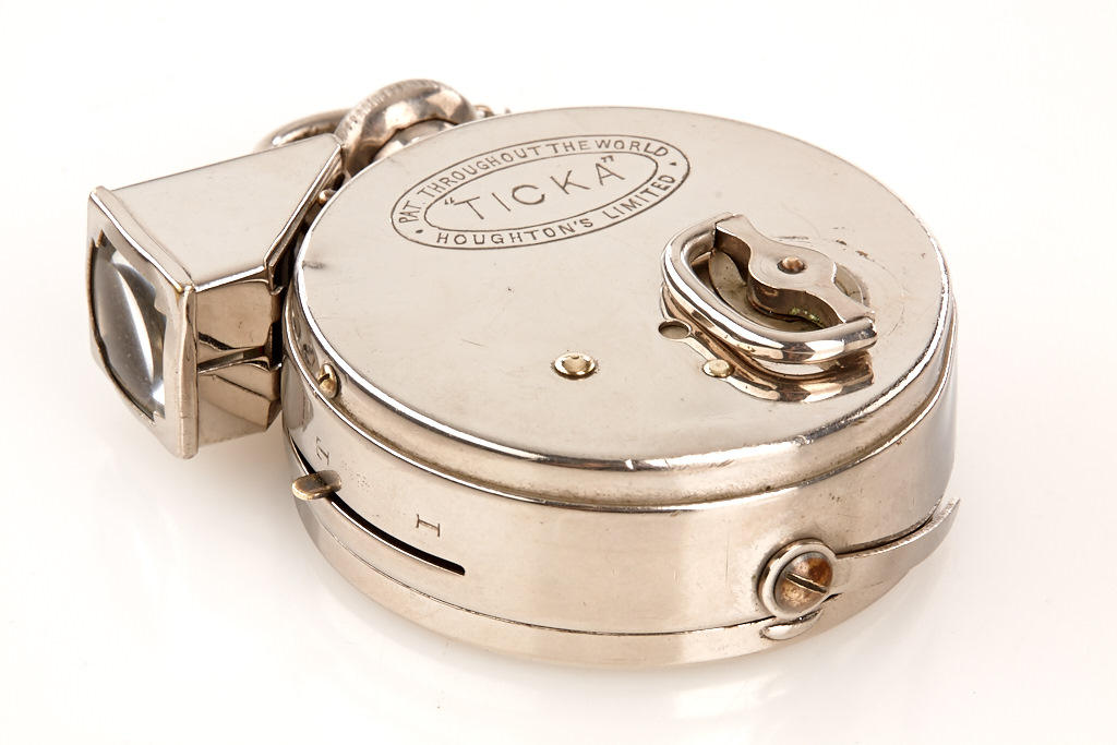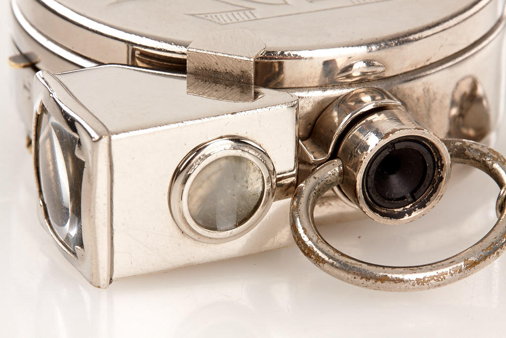 classic pocket-watch-style spy camera with chain, cap, finder and film spool