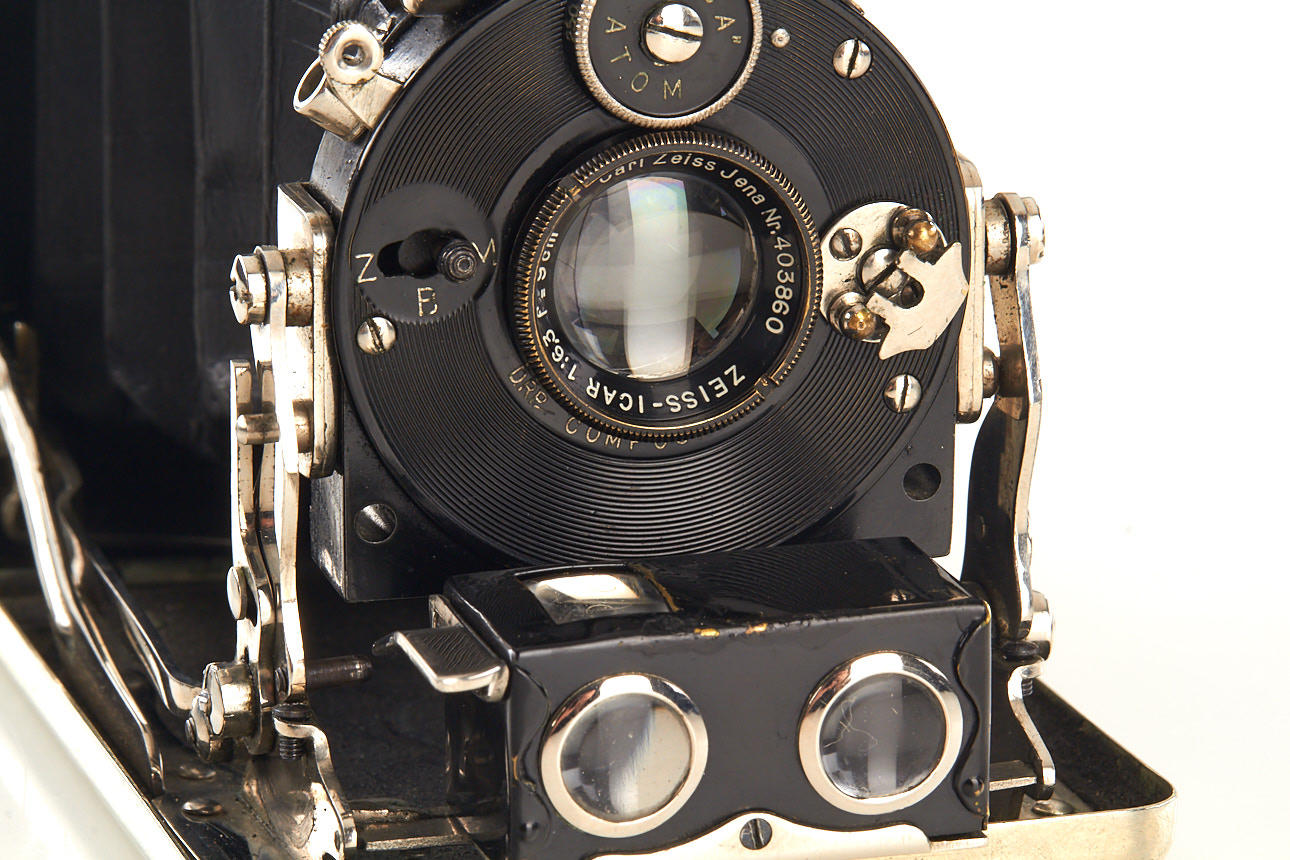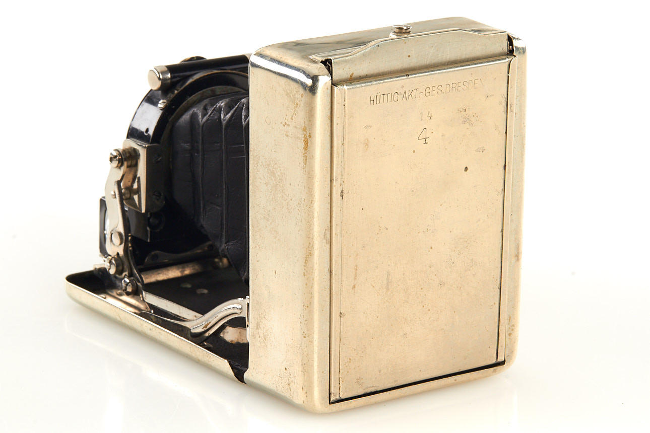 very rare version with nickel-finished metal body (resembling a metal tin when closed), for 4.5x6cm plates, in excellent condition, with uncommon Zeiss-Icar 6.3/9cm no.403860
