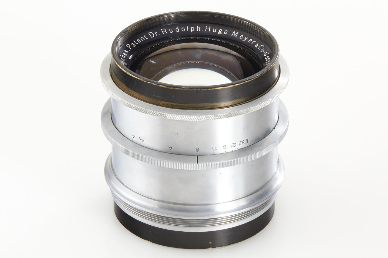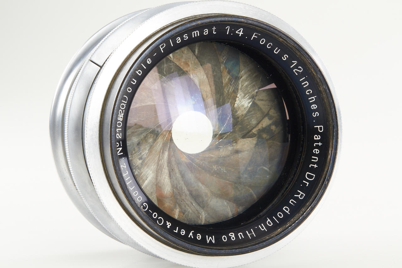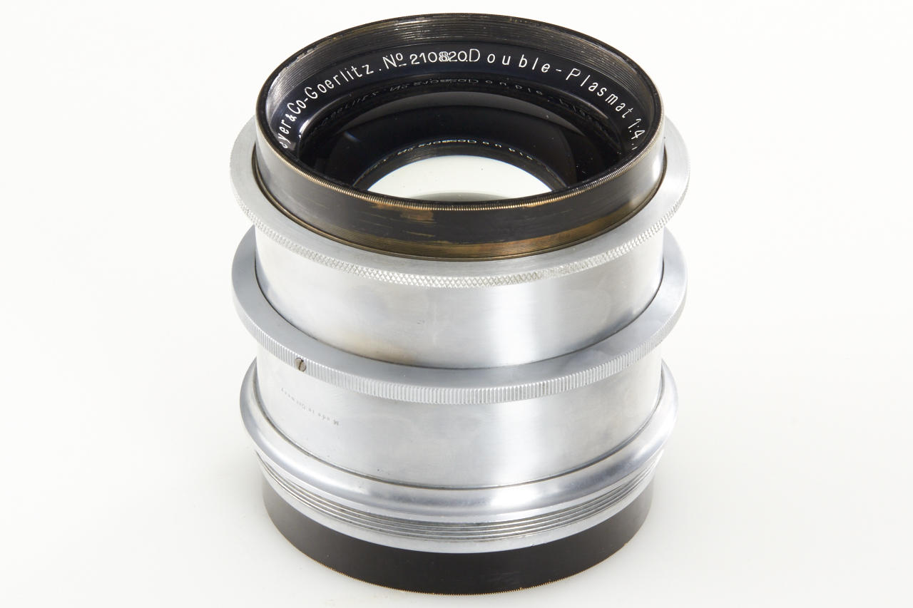 rare Double-Plasmat for large format, covering 8x10", in fine condition with clean optics (only minimal cleaning marks, iris diaphragm f:4 to f:32, rear lens element 19 3/4 inches f:8, with custom made set of adapters and extension rings, wooden box