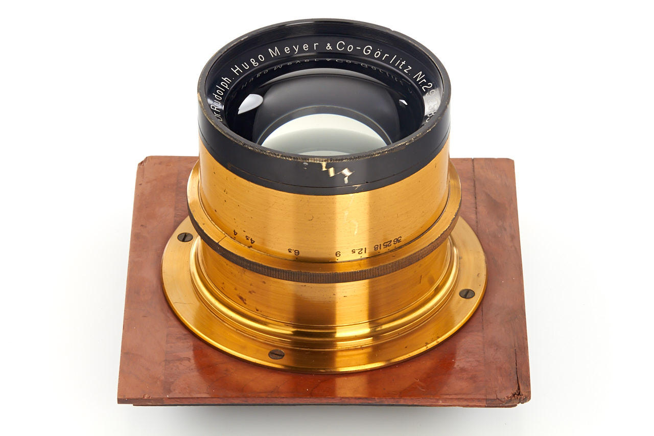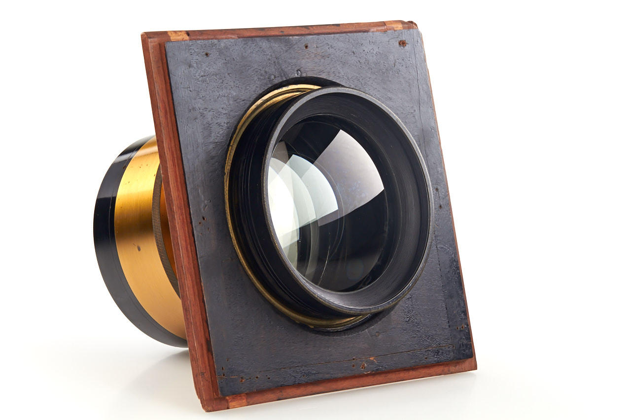 early version in heavy brass mount, front and rear element diameter c.75mm total height c.115mm, in excellent condition with clean optics, iris diaphragm f.4 to f.36, with mounting ring, on 153x153mm wooden lens board