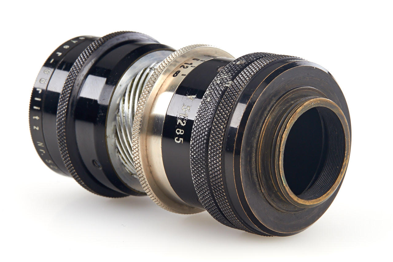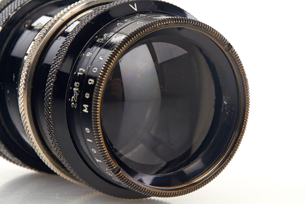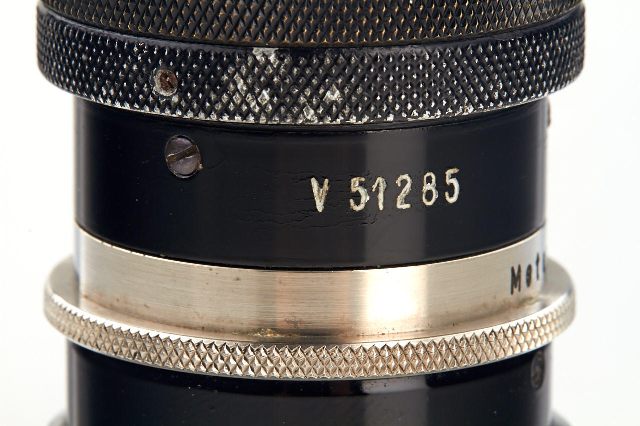very interesting black/nickel lens in focussing screw mount, prototype engraved 'V51285', in very good condition, front lens with some marks