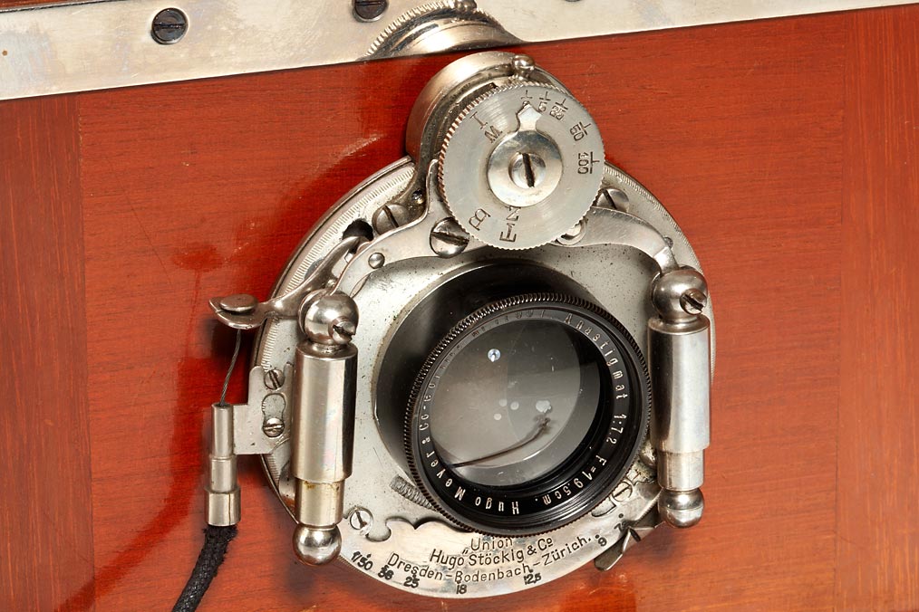 13x18cm, folding-bed-plate camera with brown bellows, Meyer Anastigmat 7.2/19.5cm no.17007, in very good original condition, focal-plane shutter not working, focusing screen missing, maker's plaque written: 'UNION' Hugo Stöckig & Co. Dresden-Bodenbach-Zürich