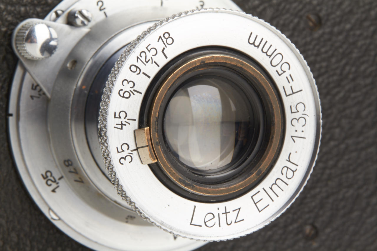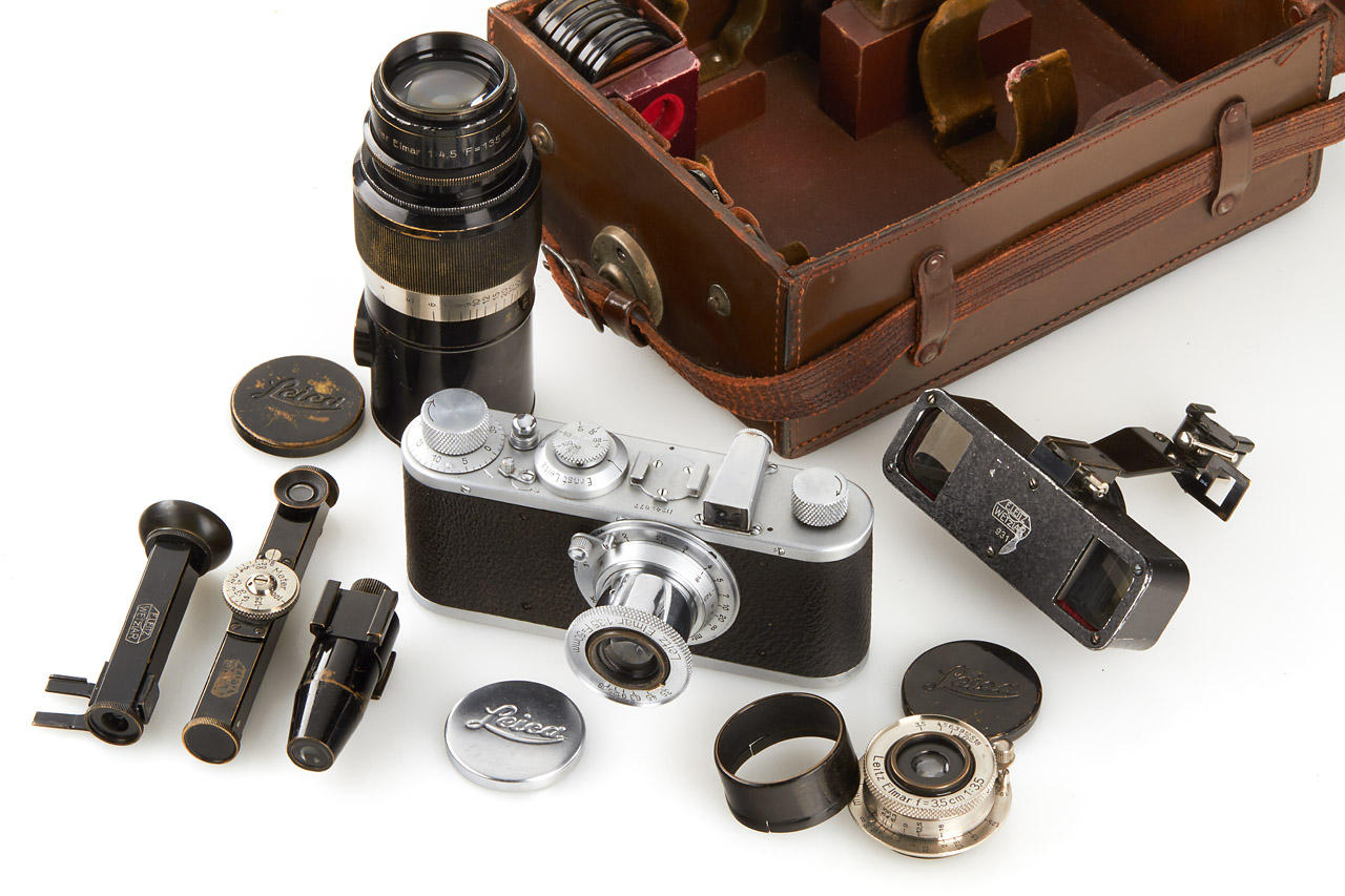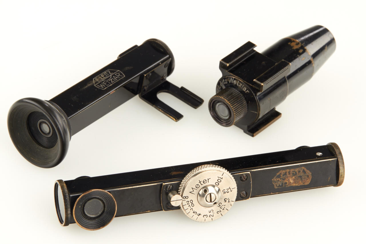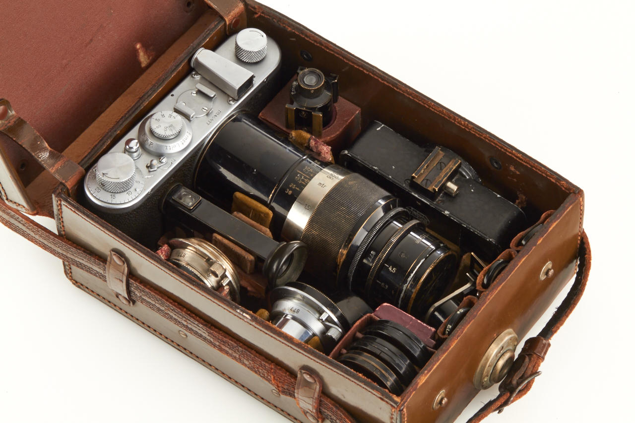very interesting IC non-standard mount outfit with three matching lenses: Elmar 3.5/50mm, Elmar 3.5/3.5cm, uncoupled Elmar 4.5/135mm - all lenses engraved '877' on barrel, the camera and the Elmar 50mm have been re-chromed by Leitz in the late 30's, other than that the outfit includes VISOR torpedo finder, WINKO right angle finder, FODIS rangefinder, early STEREOLY no.931 with removable arm, early FISON hood without set screw and six filters, everything in early fitted leather outfit case