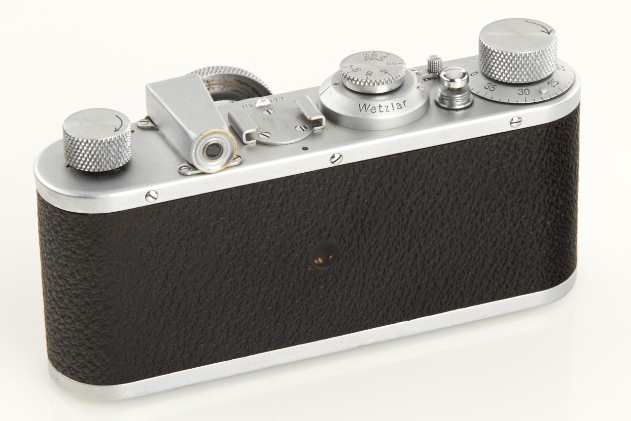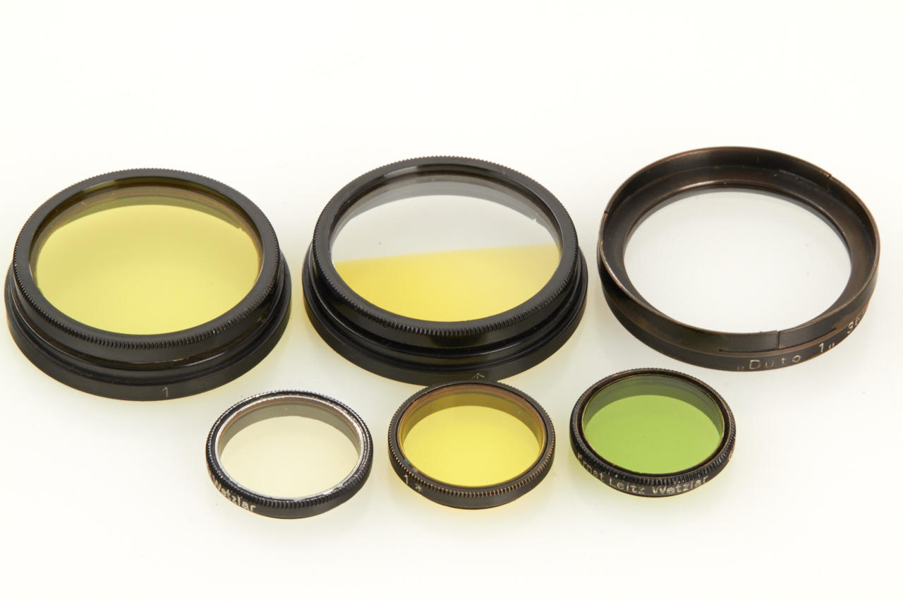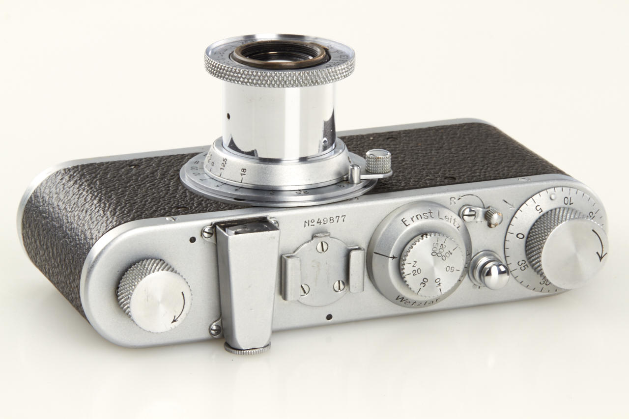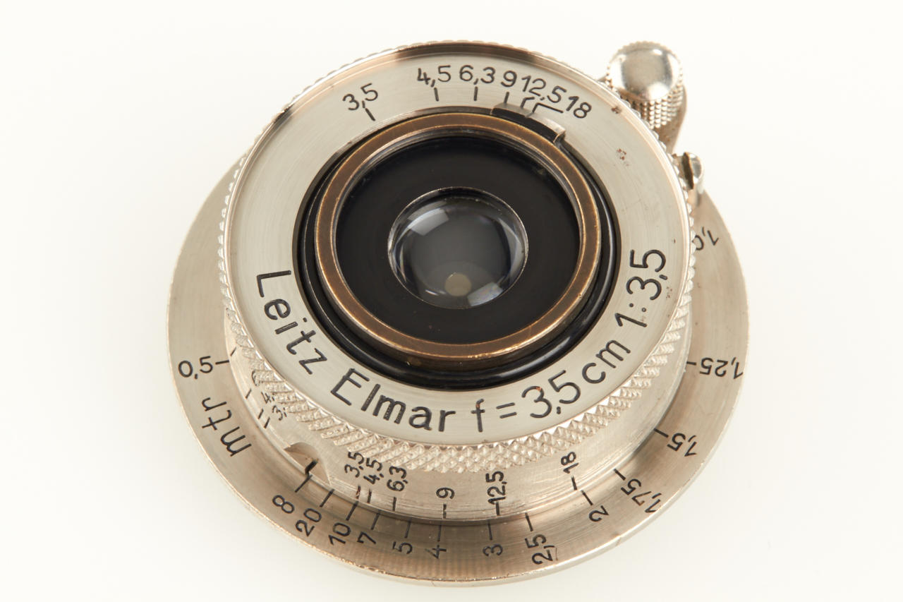 very interesting IC non-standard mount outfit with three matching lenses: Elmar 3.5/50mm, Elmar 3.5/3.5cm, uncoupled Elmar 4.5/135mm - all lenses engraved '877' on barrel, the camera and the Elmar 50mm have been re-chromed by Leitz in the late 30's, other than that the outfit includes VISOR torpedo finder, WINKO right angle finder, FODIS rangefinder, early STEREOLY no.931 with removable arm, early FISON hood without set screw and six filters, everything in early fitted leather outfit case