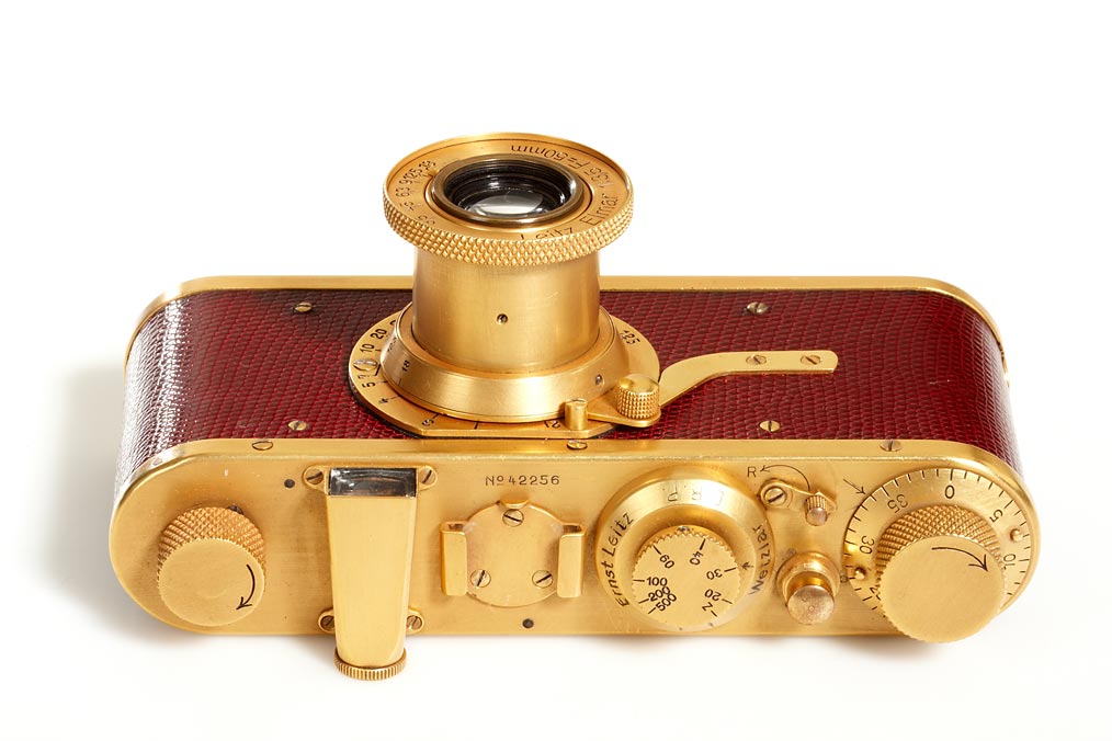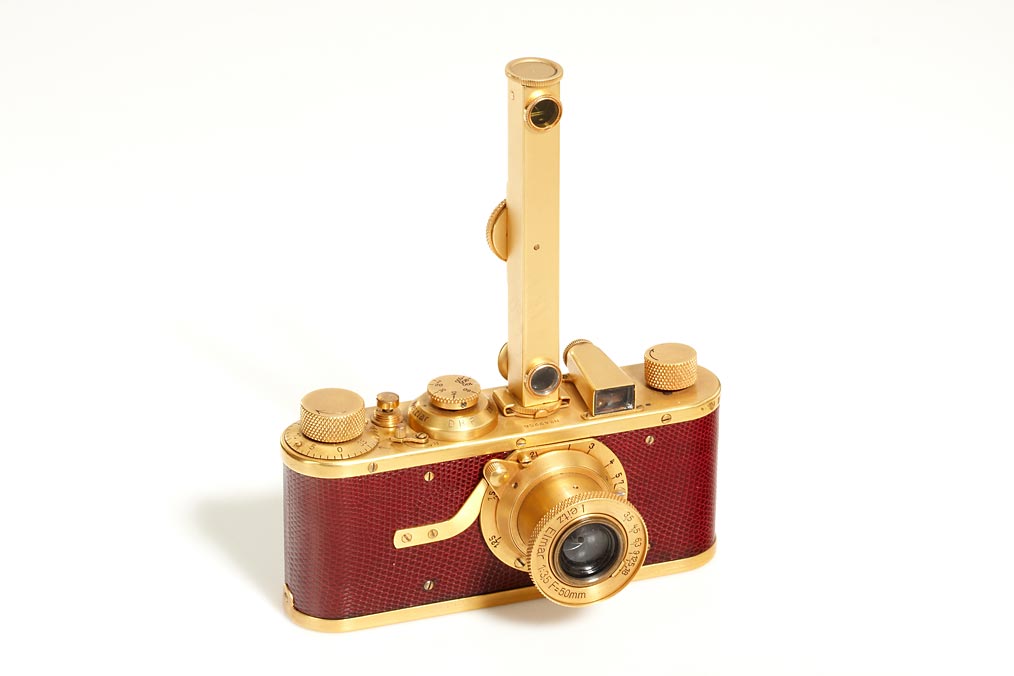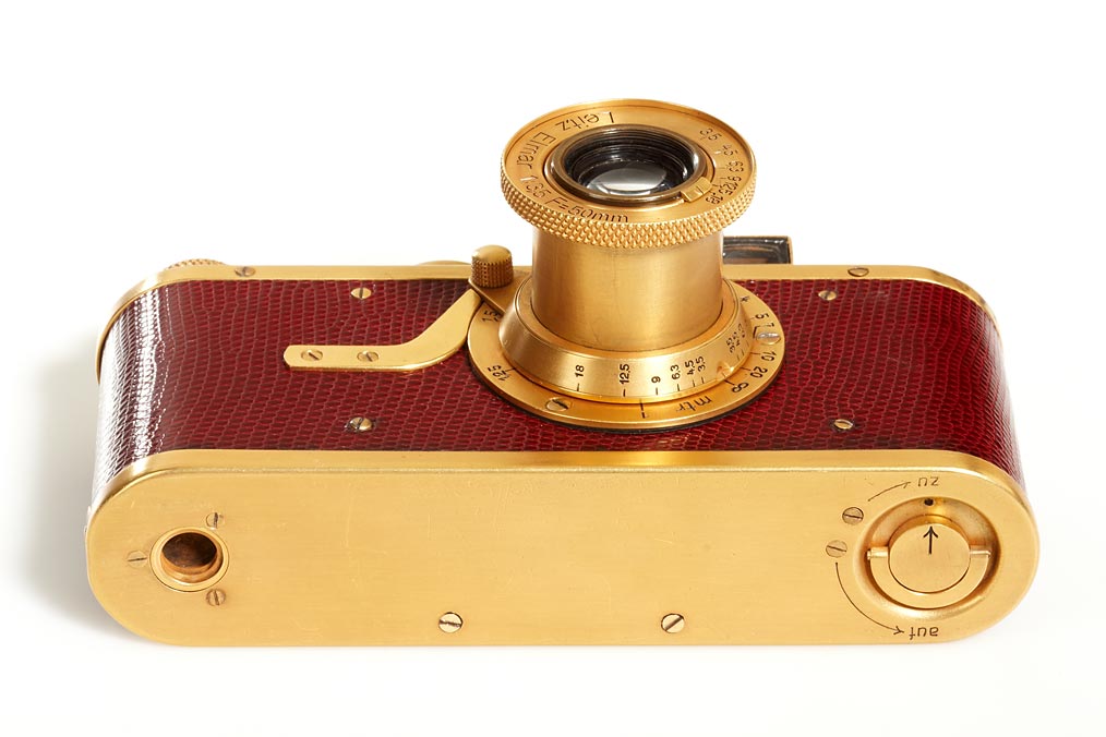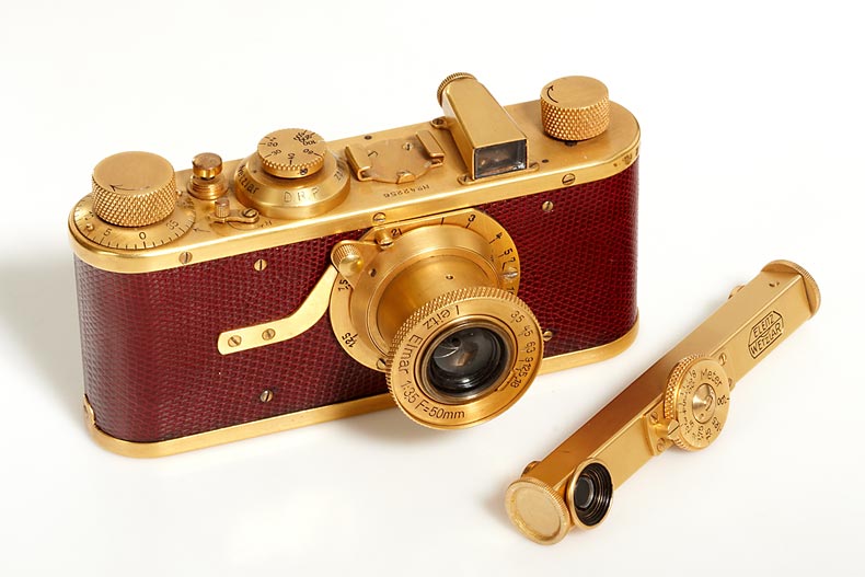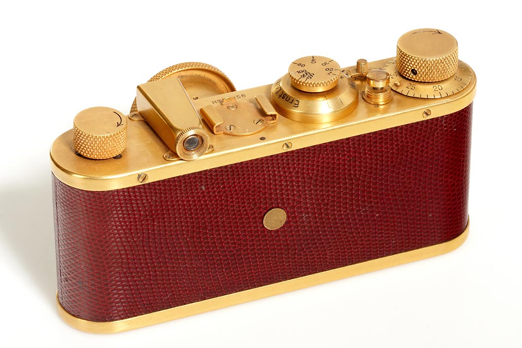 nicely made Luxus Replica in fine condition, brown reptile leather covering, gold plated FODIS rangefinder