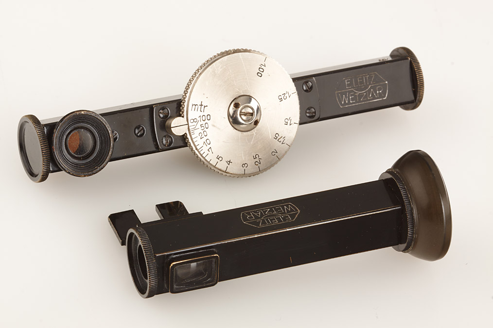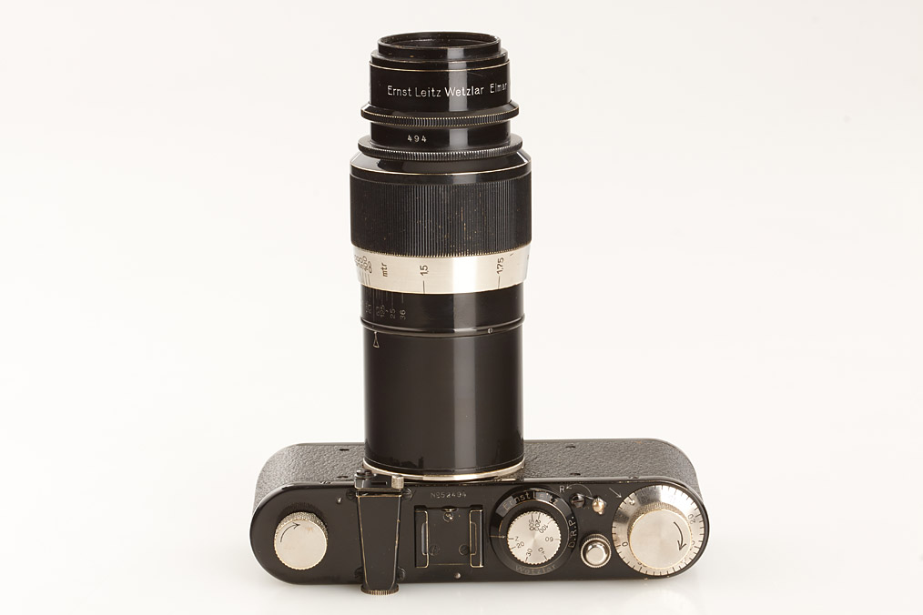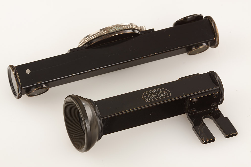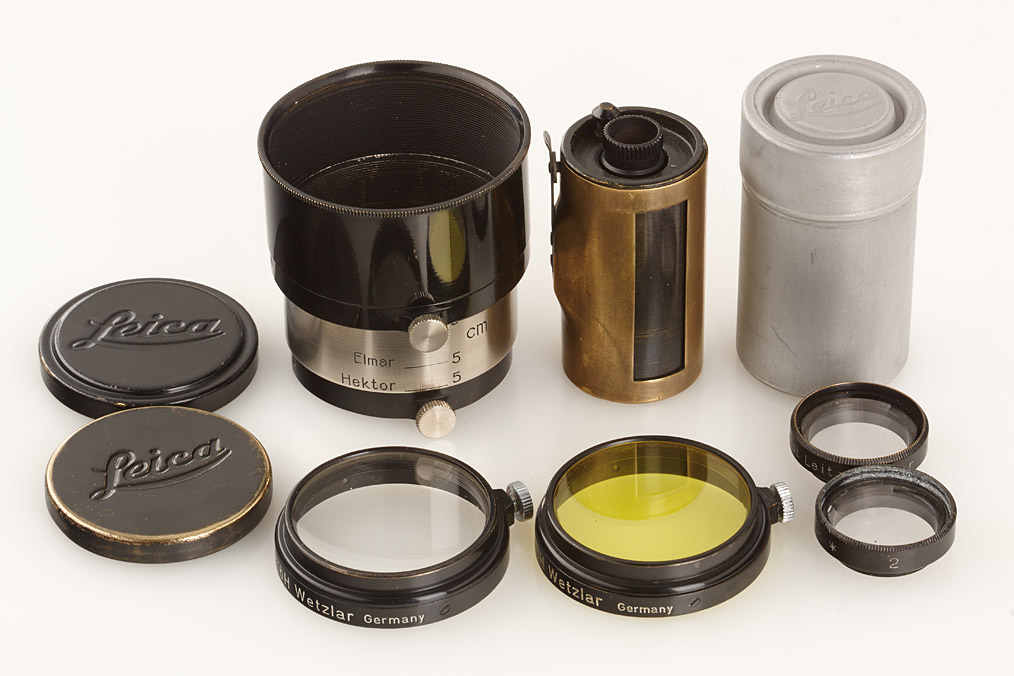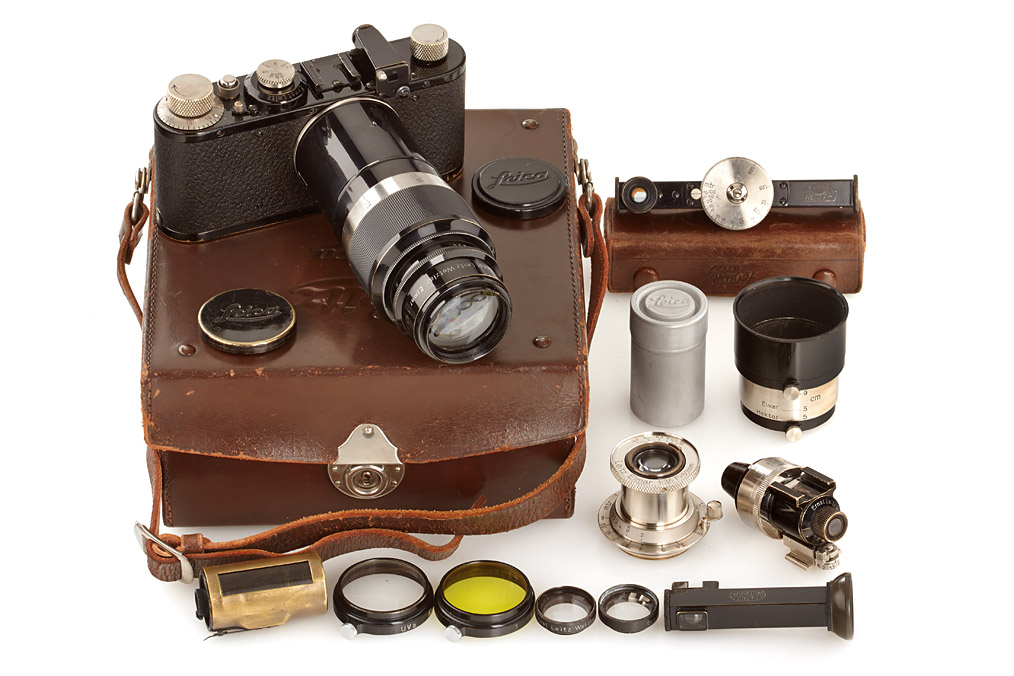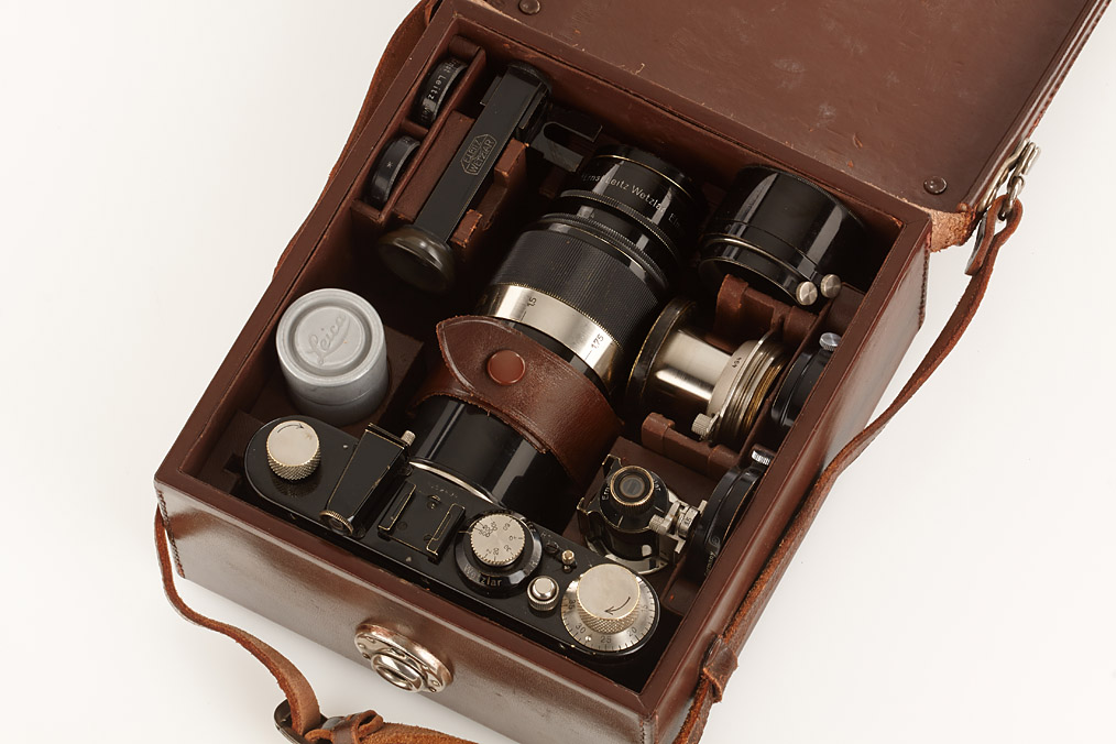 fully original I Mod. C Non Standard with two matching lenses and accessories in leather outfit case: Elmar 3.5/50mm and Elmar 4.5/13.5cm (both engraved '494' on barrel), base plate engraved 'auf-zu', swinging mask for 13.5cm, FOFER rangefinder (case), black/nickel VIDOM universal finder, WINKO right angle finder, film container with B cassette, 2 close-up lenses (ELPRO, ELPIK), A36 yellow and UVa filter (FIGRO and FIOLA), early black/nickel FIKUS hood, rare outfit of the first Leica for interchangeable lenses in very fine condition