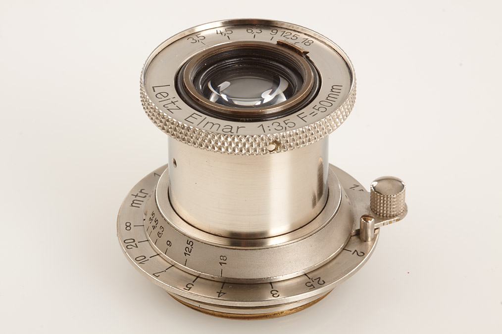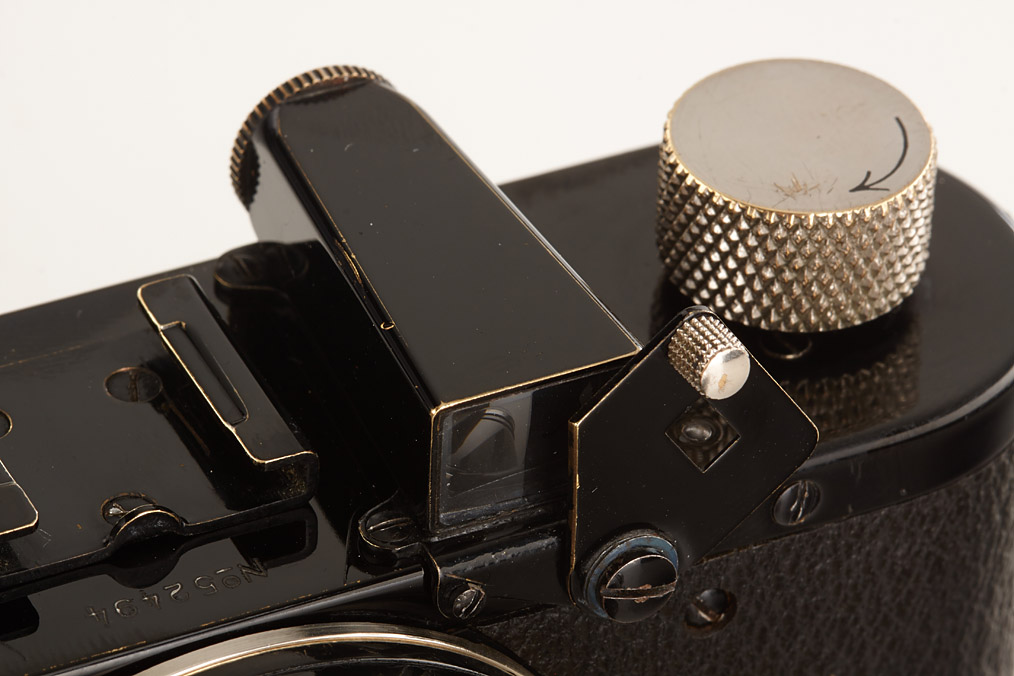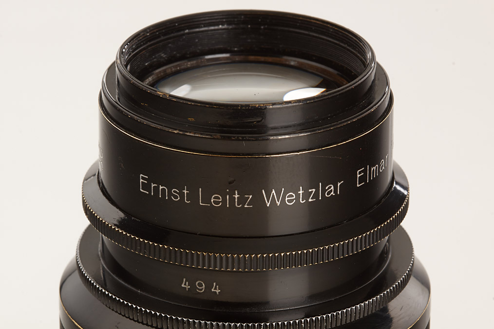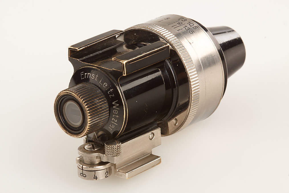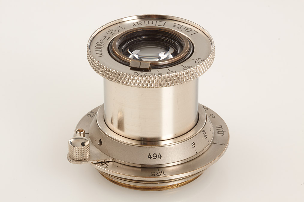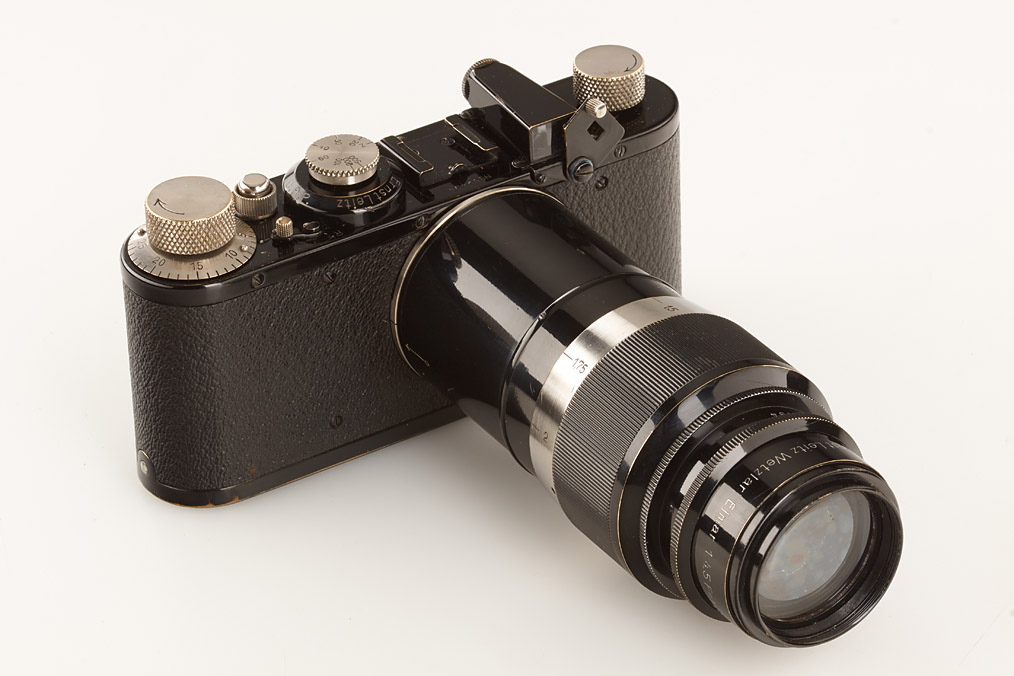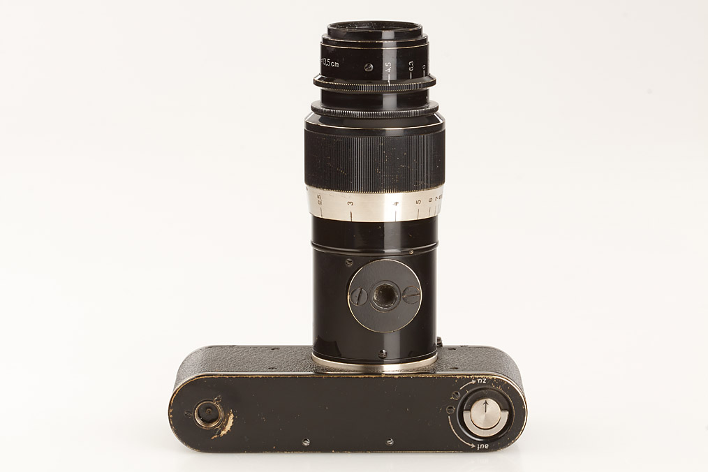 fully original I Mod. C Non Standard with two matching lenses and accessories in leather outfit case: Elmar 3.5/50mm and Elmar 4.5/13.5cm (both engraved '494' on barrel), base plate engraved 'auf-zu', swinging mask for 13.5cm, FOFER rangefinder (case), black/nickel VIDOM universal finder, WINKO right angle finder, film container with B cassette, 2 close-up lenses (ELPRO, ELPIK), A36 yellow and UVa filter (FIGRO and FIOLA), early black/nickel FIKUS hood, rare outfit of the first Leica for interchangeable lenses in very fine condition
