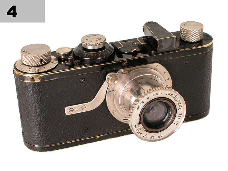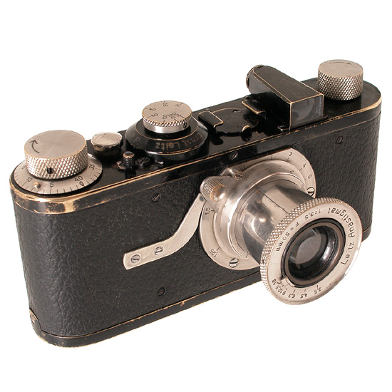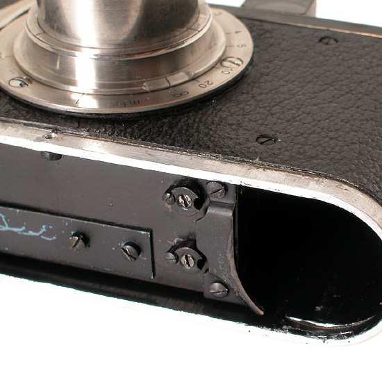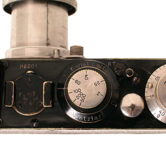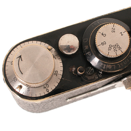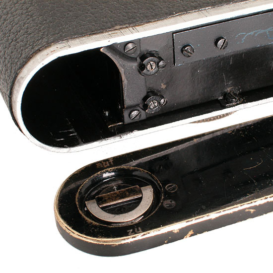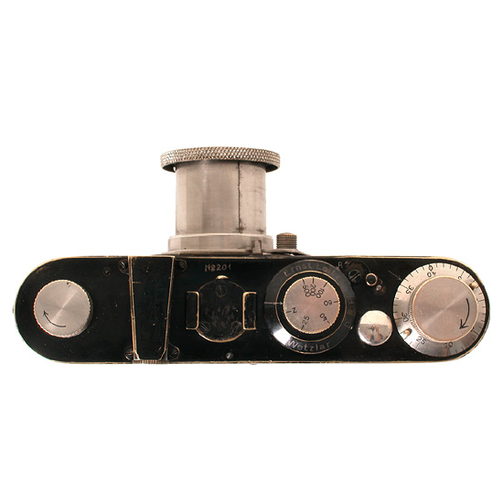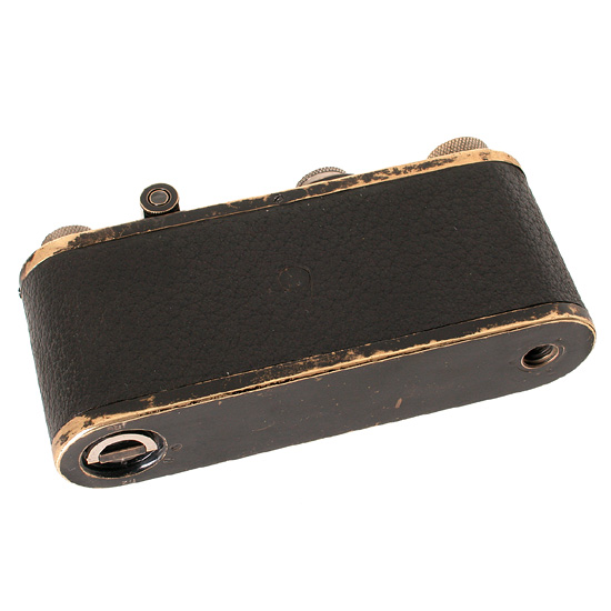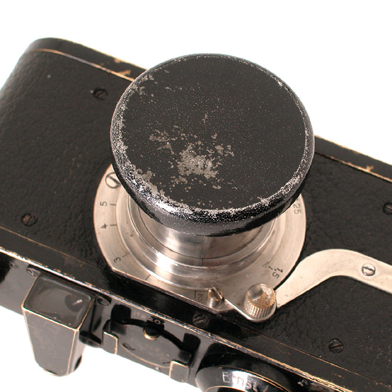absolute original with all early parts, ratchet wind, mushroom release, 6-speed shutter, knobs, film advance knob 0-40, early baseplate, leather covering, finder, lens with datum line, first lens cap without engraving, very good condition, in good working order