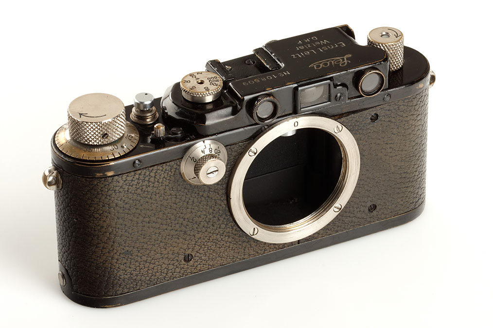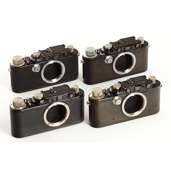 (1) converted I Mod.A no.35109 (working shutter, shark-skin covering, partly repainted, no base plate, strap lugs), (2) II Mod.D no.85909 (no strap lugs, partly repainted, leather damaged, (3) converted II Mod.D no.108509 (strap lugs, repainted), (4) orig