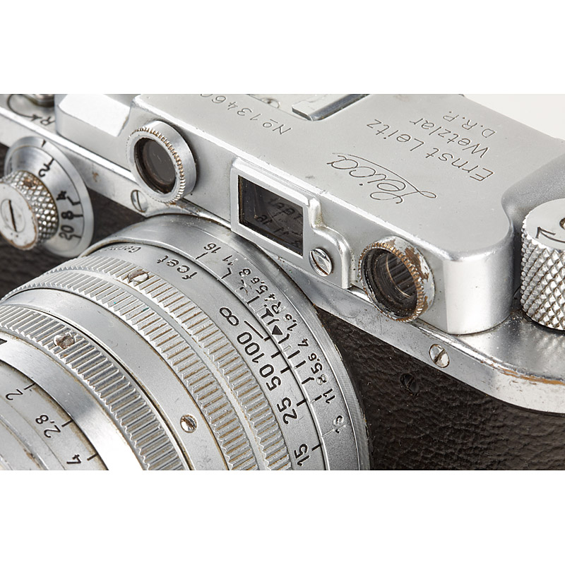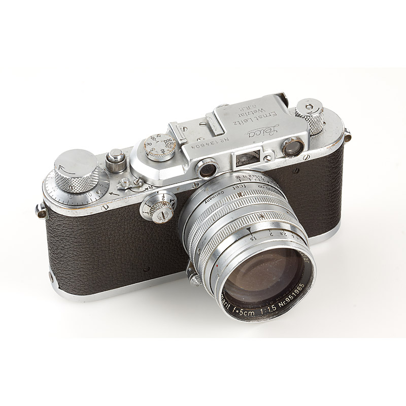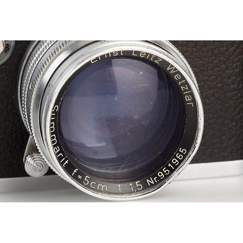 The very first Leica owned by renowned photographer Inge Morath ! Outfit including Summarit 1.5/5cm no.951965 (cap), Summaron 3.5/3.5cm no.889349 (caps), Hektor 4.5/13.5cm no.854664 (cap), VIOOH universal finder no.1333. Inge Morath received this Leica from her brother Werner in 1946 and also used it to shoot her famous picture 'Mrs. Eveleigh Nash, Buckingham Palace Mall, London 1954'. After Inge Morath passed away, the outfit went back to her brother Dr. Werner Mörath, who is offering the camera in this auction. It comes with a personal letter from Dr. Werner Mörath outlining the history of this outfit. It also includes a copy of the book ' Bibliothek der Photographie, Grosse Photographen unserer Zeit: Inge Morath', signed by Inge Morath and copies of some private photographs. Please note that in our auction of photographs, running alongside this auction, a vintage photograph documenting Inge Morath with this exact camera is on offer (Lot 1099)