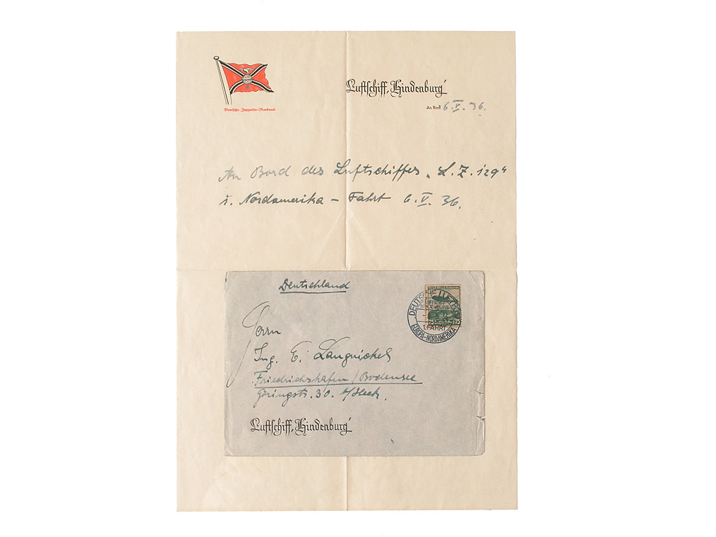 The Leica equipment from Fritz Deeg, the steward on the Hindenburg on 6th May 1937. Three days after the crash of the Hindenberg, Deeg found the remains of his camera equipment at the crash site which included a Leica IIIa, a VIDOM viewfinder, a Nooky close-up attachment, Elmar f/4 9cm lens, two filters and lens cap. In 1970 Michael von Rosen aquired the camera direct from Fritz Deeg. The camera came with authentic, original archive material including the newspaper 'The New York American', morning edition dated May 7th, 1937 with the legend “Hindenburg Explodes at Lakehurst 35 dead”, in-flight brochure with seating plan and journey information, an unopened letter with Hindenburg emblem sent from New York to Frankfurt with Lakehurst Trans-Atlantic flight postmark dated May 11th,1936 and a similar letter on Hindenburg paper with envelope dated 1936 sent by another passenger, an in-flight brochure for the Graf Zeppelin, original press photograph of the Hindenburg crew on the airship which includes Fritz Deeg, a postcard sent from the Graf Zeppelin by Fritz Deeg and another postcard with Zeppelin postmark, two publicity photographs of the Hindenburg, five press photographs of the disaster, photographs of Mr.von Rosen and Fritz Deeg in 1971 when purchasing the camera, two blue-prints and schematic drawings of airships, three contemporary photographs of the Hindenburg in flight, taken in 1936, three framed photographs relating to the Graf Zeppelin and other material.