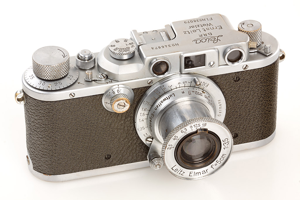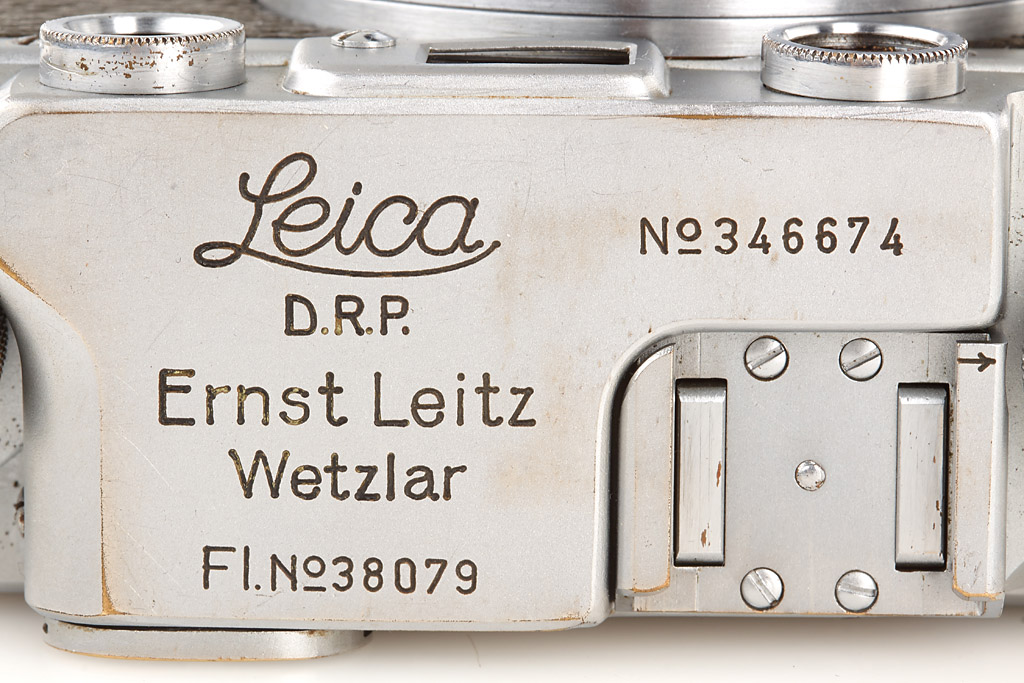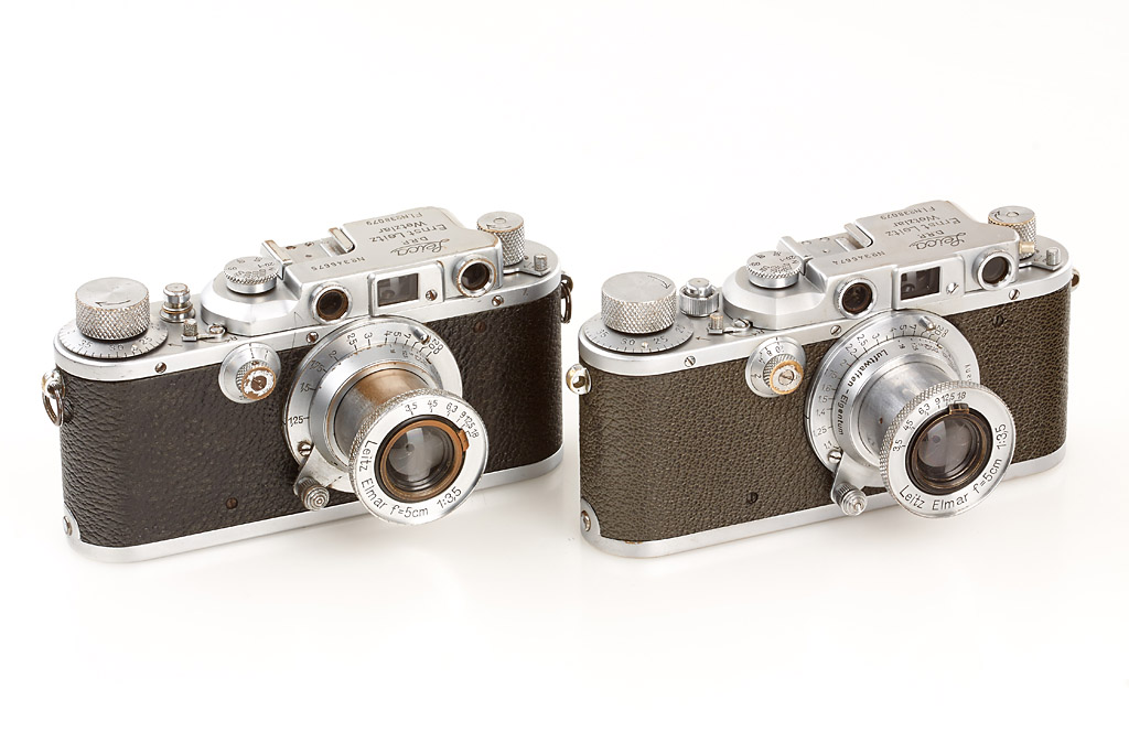 extremely rare pair of two cameras with consecutive serial numbers (346674 + 346675), both in good original condition, stamped 'Luftwaffen-Eigentum' on rear, engraved 'Fl.No.38079' on top plate, camera no.346674 with Elmar 3.5/5cm no.546482 engraved 'Luftwaffen-Eigentum', camera no.346675 with Elmar 3.5/5cm no.534915 (caps) - both cameras were shipped on the same day (February 26th, 1940) with the same delivery number 7989 to Luftwaffe Bln. (also Elmar 3.5/5cm no.534915), Elmar 3.5/5cm no.546482 was shipped to Luftw.Bln. on January 16th, 1941.