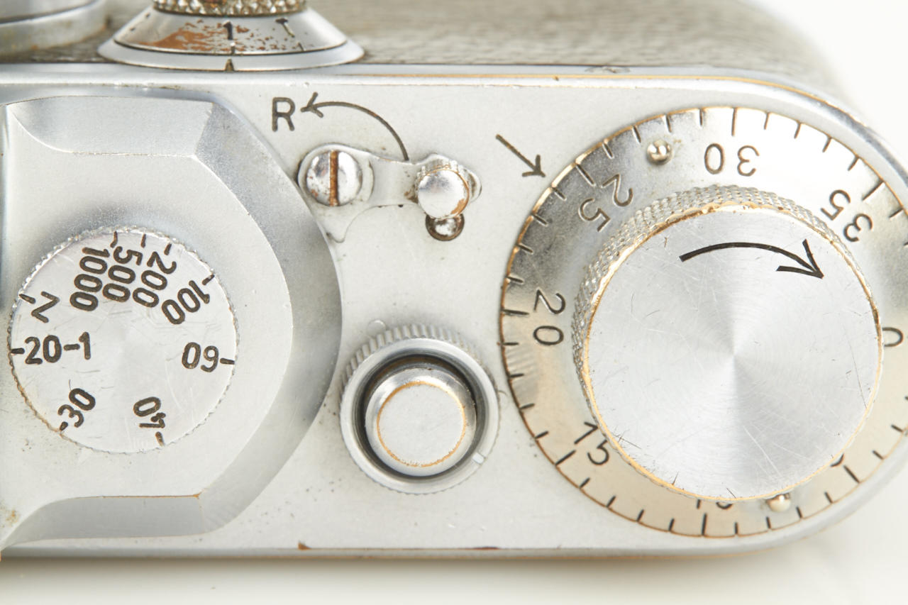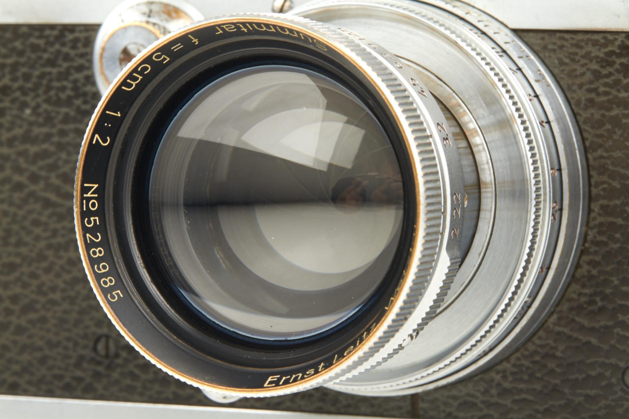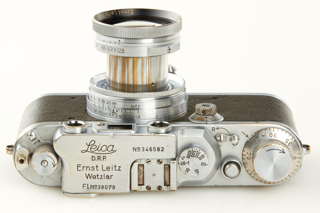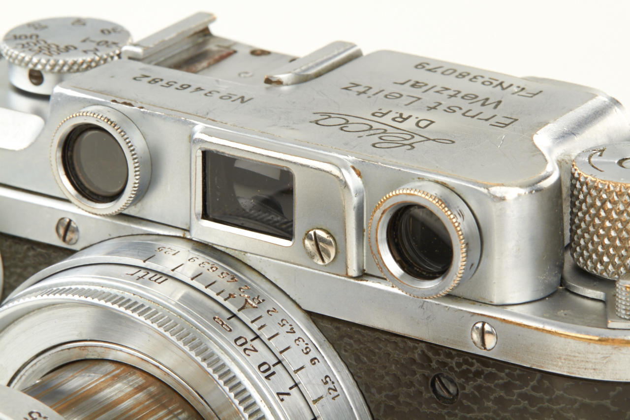 very rare German military camera in used condition (synchronized), engraved 'Fl.No38079' on top-plate, stamped 'Luftwaffen-Eigentum' on the vulcanite (delivered to Luftwaffe Bln. on February 10th, 1940, delivery no.9008), Summitar 2/5cm no.528985 - original set with patina of heavy use during the war