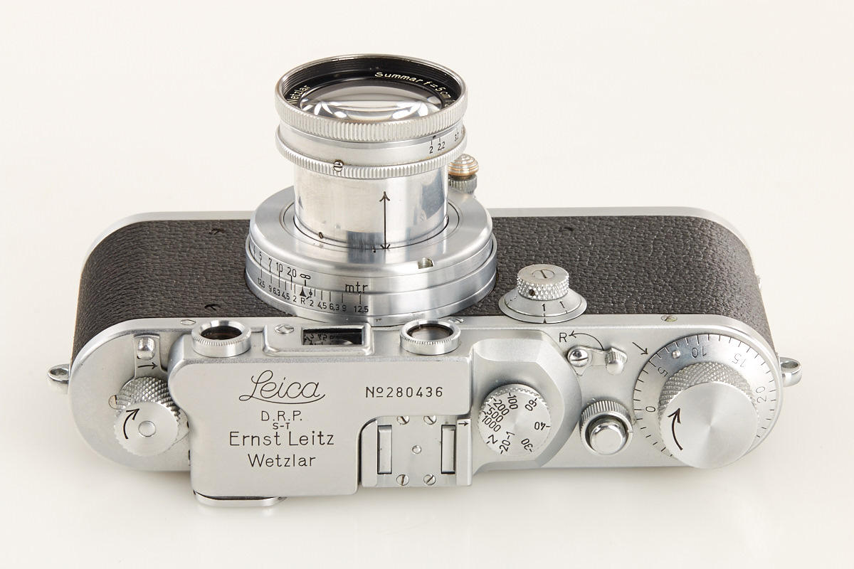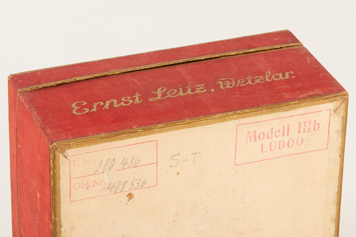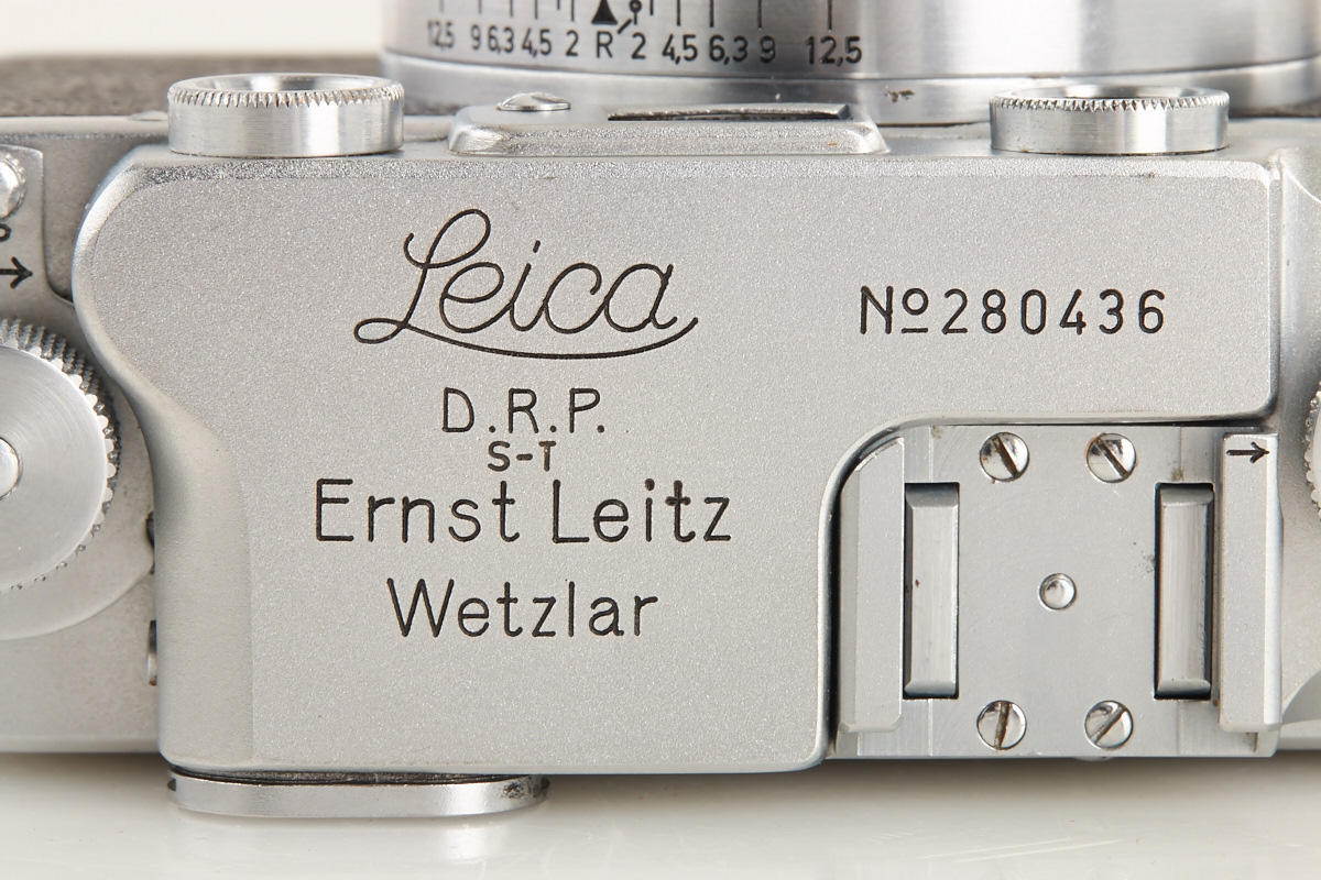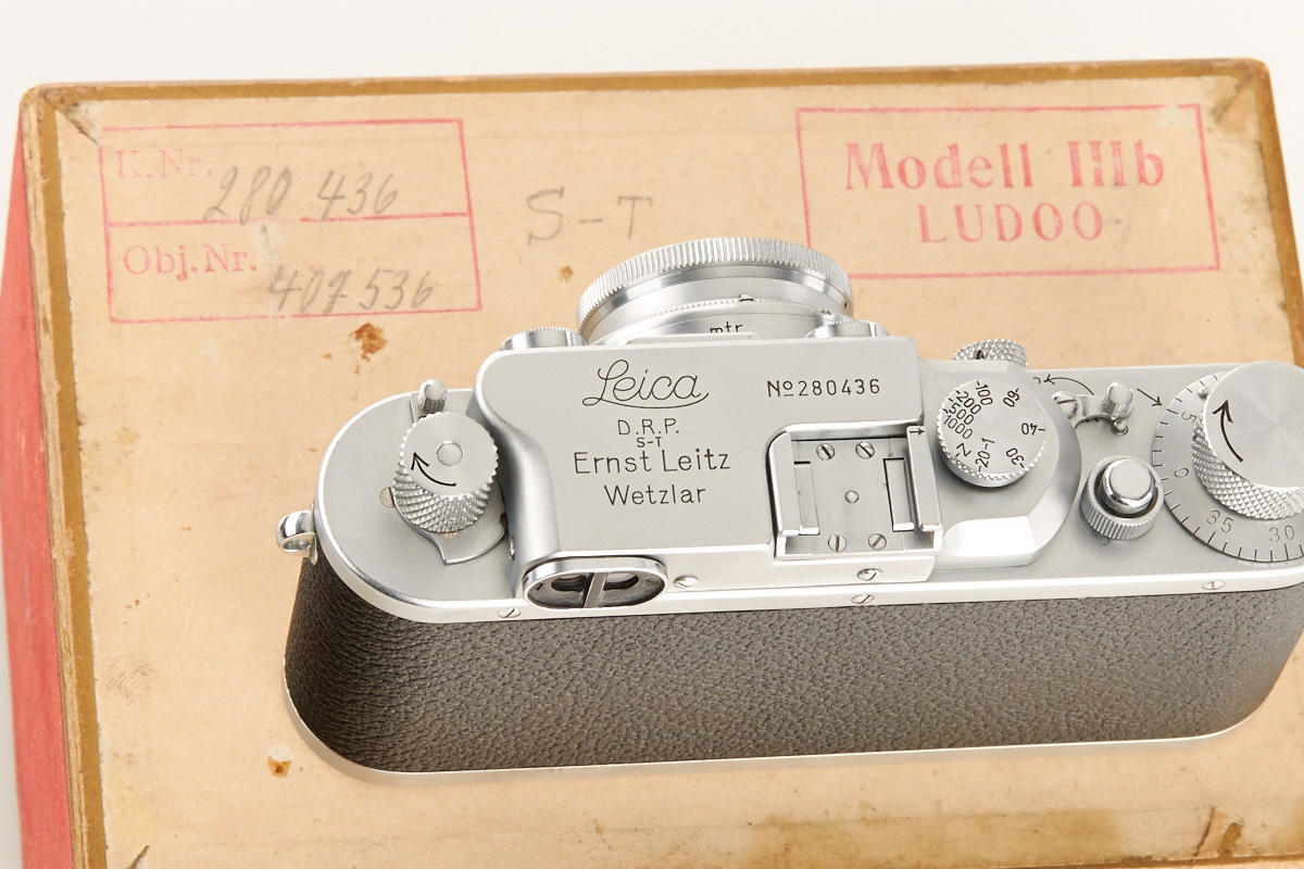 top plate engraved 'S-T' for the sales agent in France, with Summar 2/5cm no.407536 (cap), original matching IIIb LUDOO box numbered with both serial numbers + S-T, very rare in this almost mint condition - the outfit comes with a framed original advertising for Leica by SPECIALITES TIRANTY (the camera on this has serial number 280371)