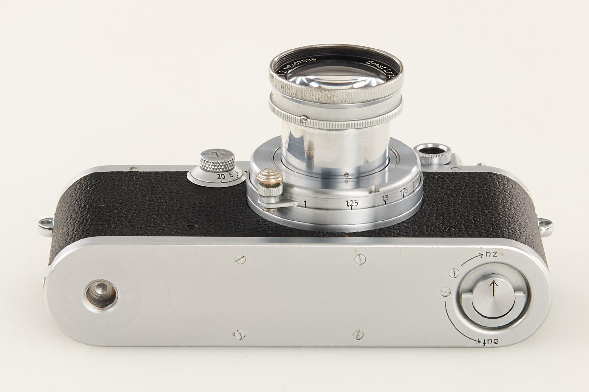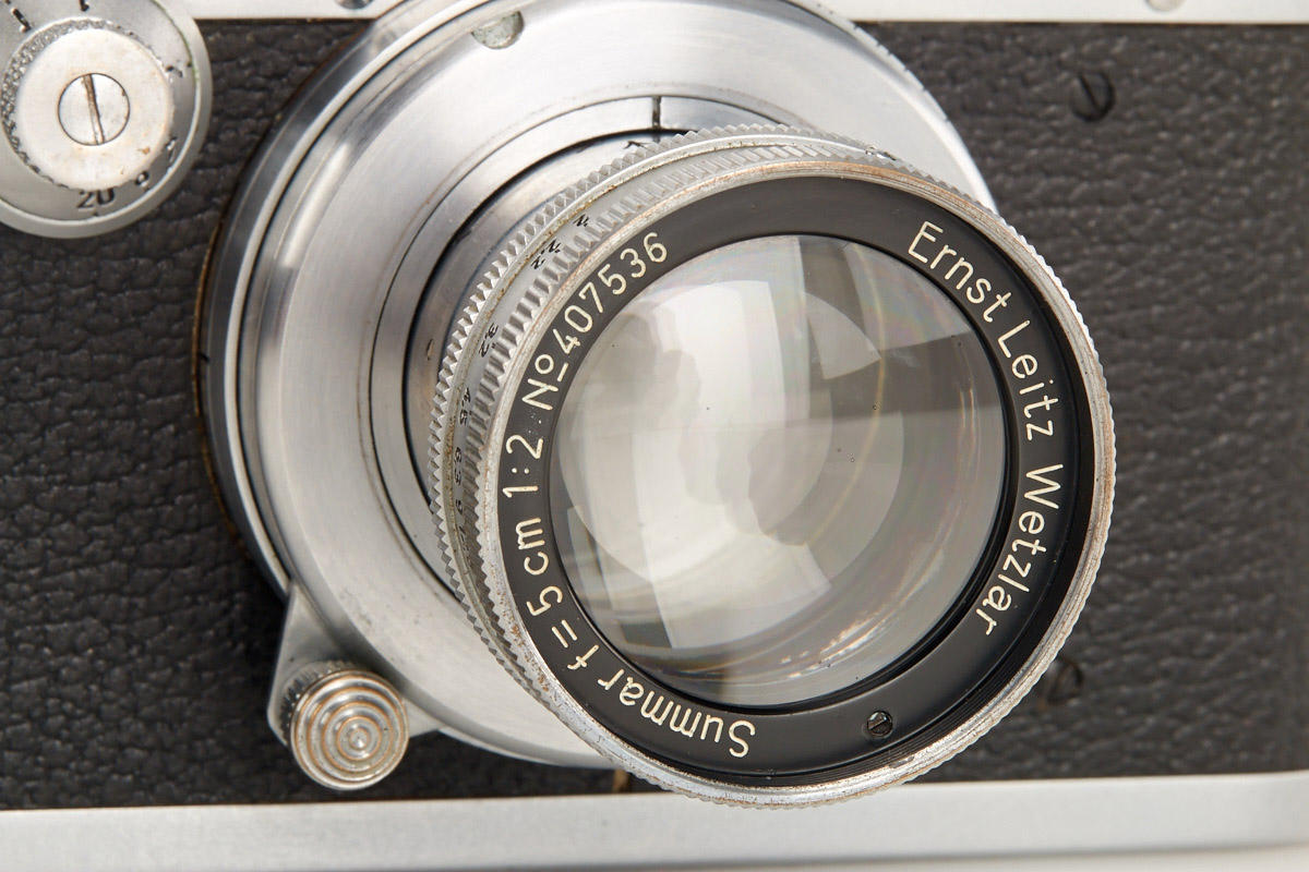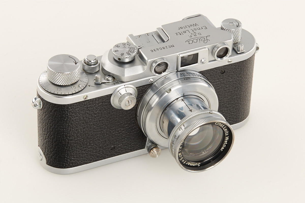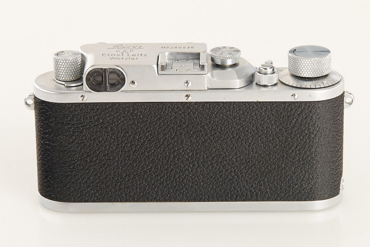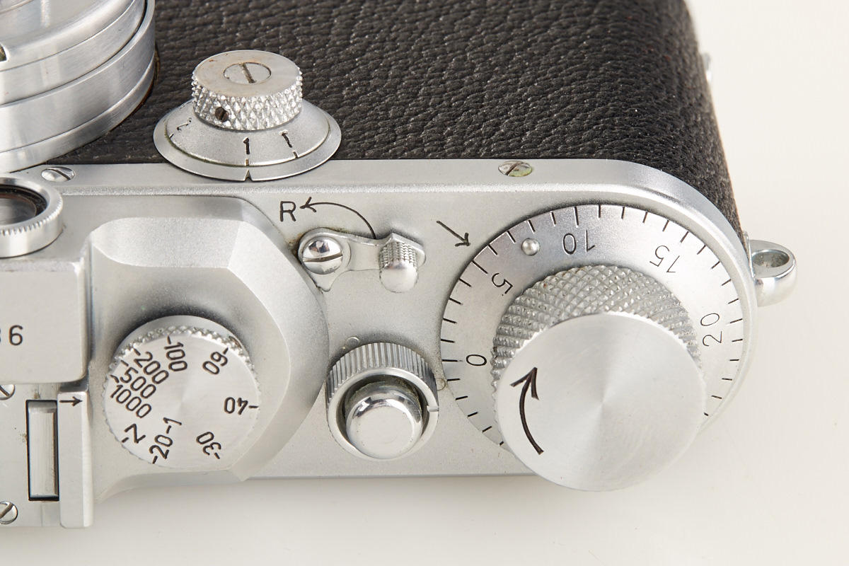 top plate engraved 'S-T' for the sales agent in France, with Summar 2/5cm no.407536 (cap), original matching IIIb LUDOO box numbered with both serial numbers + S-T, very rare in this almost mint condition - the outfit comes with a framed original advertising for Leica by SPECIALITES TIRANTY (the camera on this has serial number 280371)