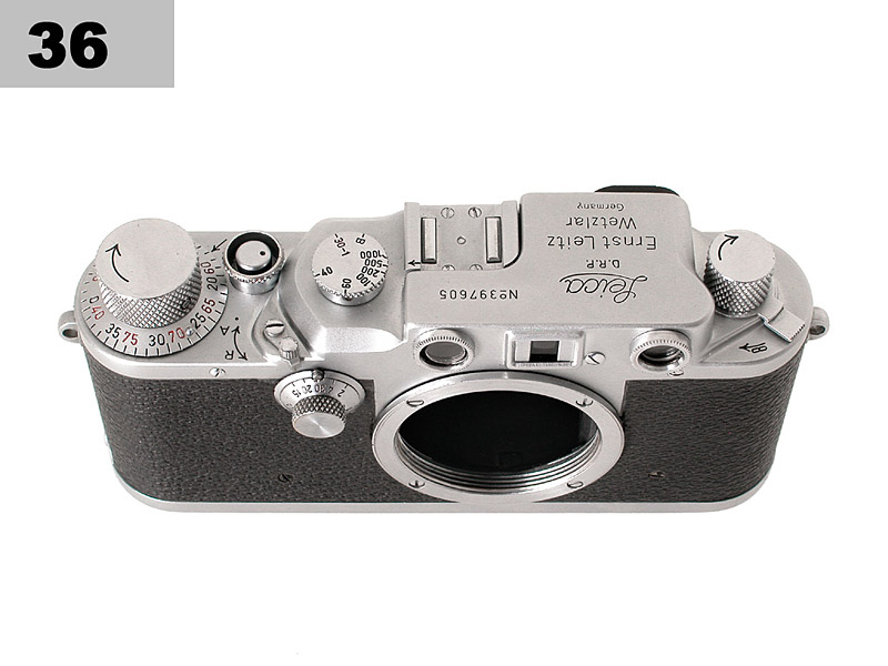 18x24mm, filmcounter 1-75, frame-mask for 18x24mm inside the viewfinder, halframe prototype based ona Leica IIIc, produced around 1945.The camera war recently discovered and is one of three examples manufatured. Current research (backed up by photo-graphs of the camera mechanism), by Leica expert Ottmar Michaely from Wetzlar, has uncovered docu-ments relating to this important camera. (ref: Wilhelm Albert, Geburtstage der Leitz-Foto-Konstruktionen, page 65). The other known cameras are no. 397604 (see Lager I, page 81), no. 397606 (ref: v.Hasbroeck, page 119). The mechanism of this camera is illustrated in “Rogliatti, The fist sixty years”, page 71. The camera is in near mint condition