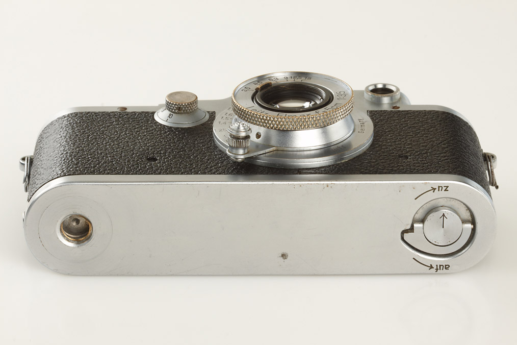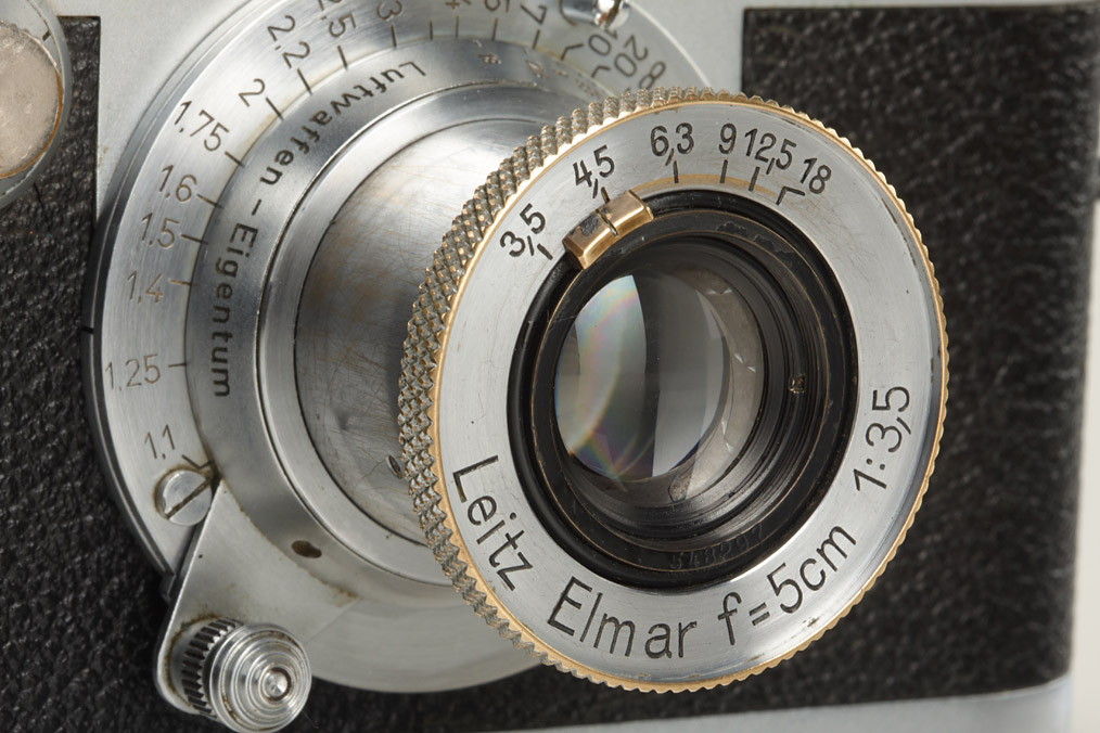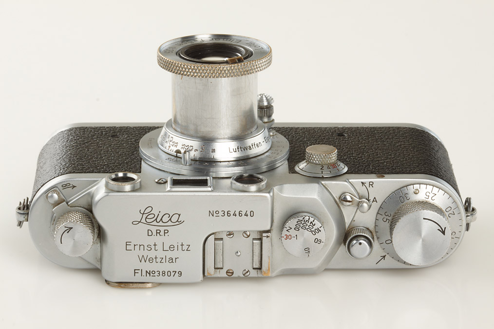 100% original camera with Luftwaffen-Eigentum on the vulcanite, engraved Fl.no.38079 on top plate, red shutter, in very fine and perfect working condition (camera was delivered October 1st, 1940 to Luftwaffe Bln., delivery number 9780), Elmar 3.5/5cm no.548297 engraved 'Luftwaffen-Eigentum' (delivered on March 26th, 1941 to Bln., delivery no.25293)