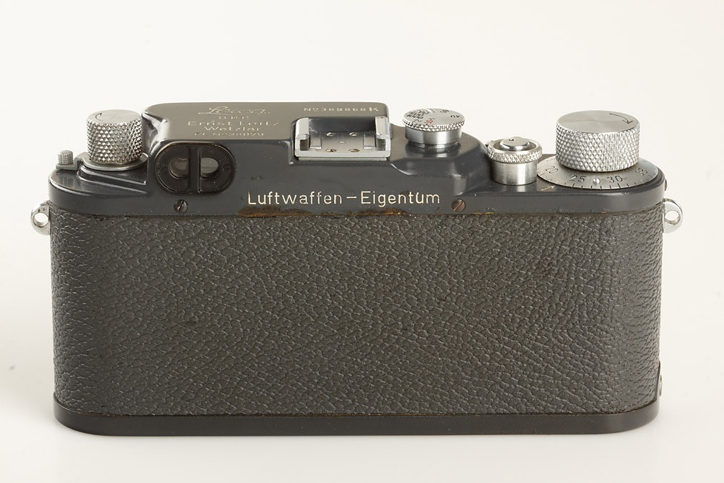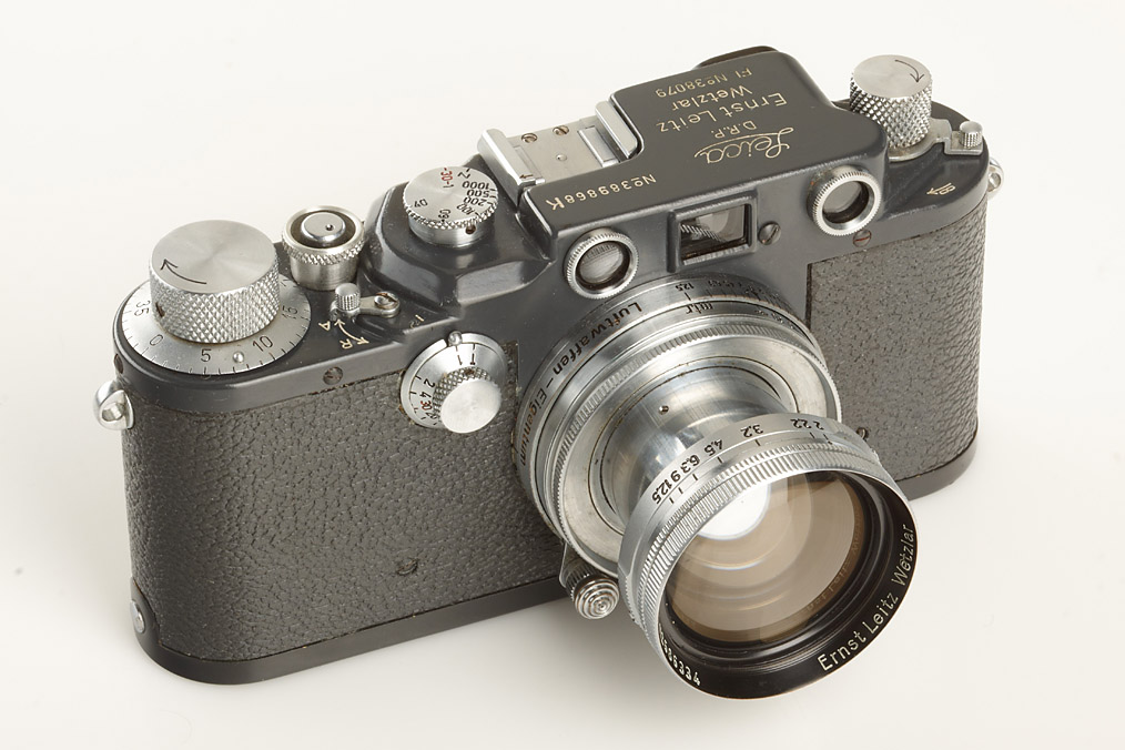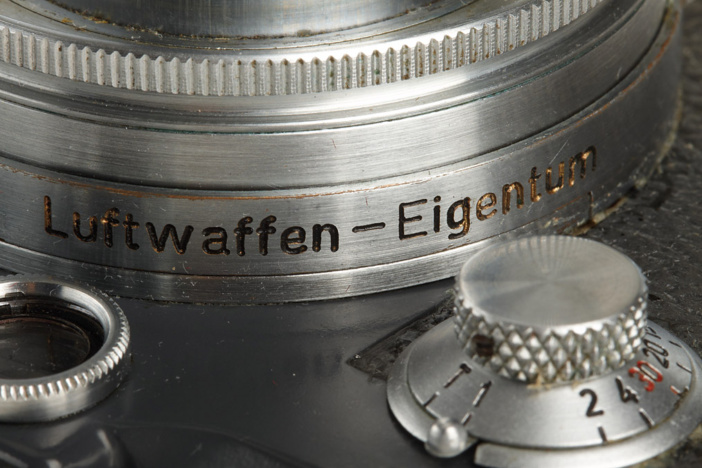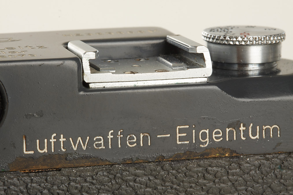 100% authentic and very rare camera in extremely fine condition, engraved 'FL.No 38079' and 'Luftwaffen-Eigentum', white K on shutter blind, grey leather covering, delivered on August 24th, 1943 to BLN (delivery number 9909), matching Summitar 2/5cm no.586334 engraved 'Luftwaffen-Eigentum', grey everready case with Luftwaffen-Eigentum markings (defaced)