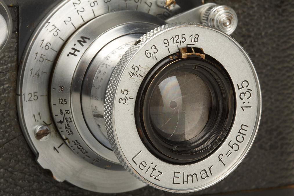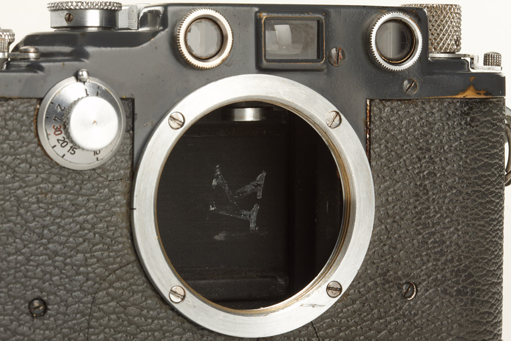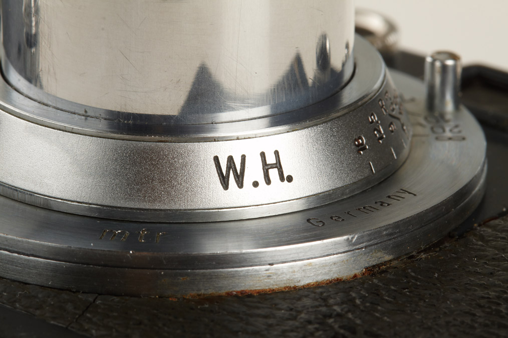 grey W.H. (Wehrmacht Heer) camera with grey leather covering (LOOPN K), in fine original condition, white K on shutter blind, special fiducial film points still present (usually removed later), with matching Elmar 3.5/5cm no.593694 engraved W.H., delivered on Dec.12th, 1944 to Bln. (delivery number 9774) - fully original set in perfect condition
