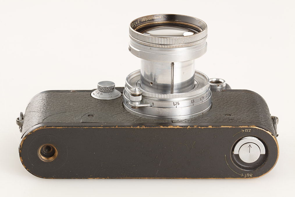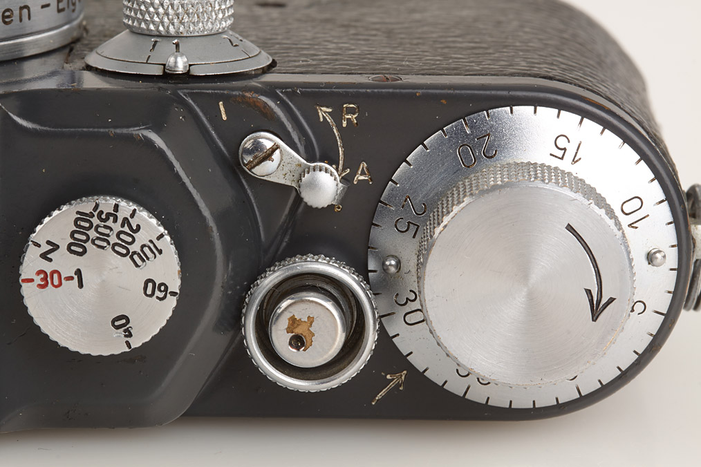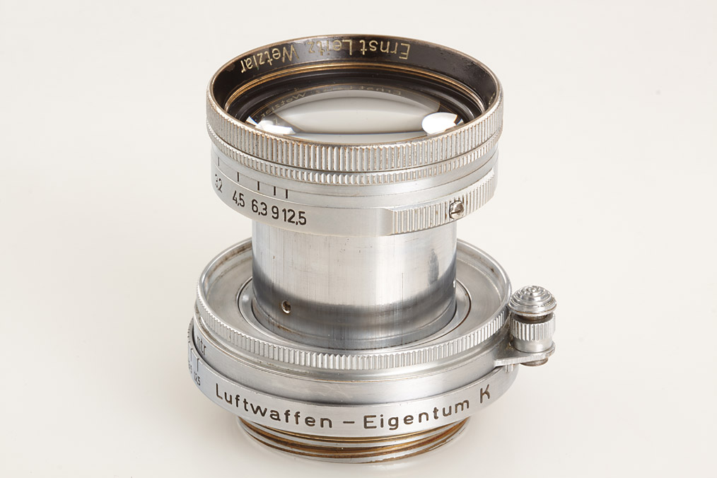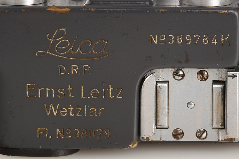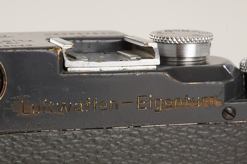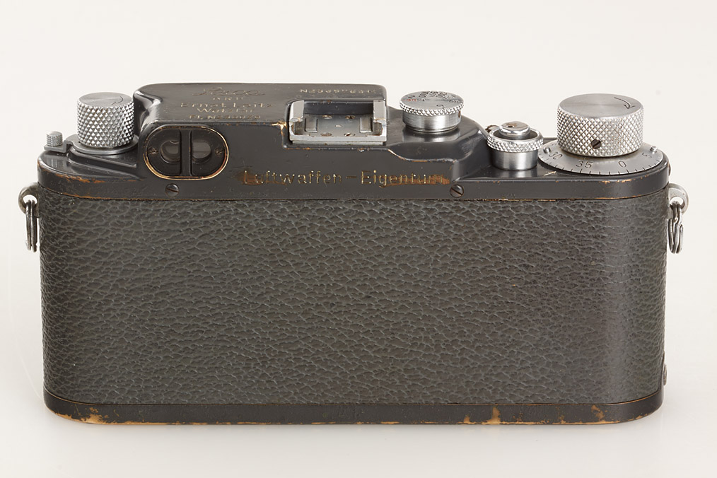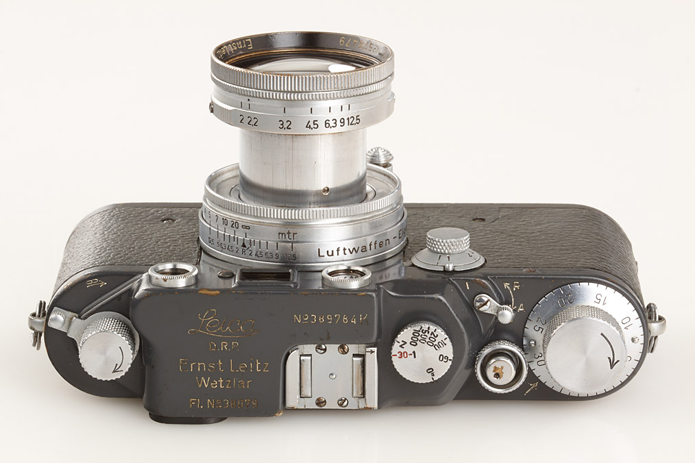 100% original military IIIc grey in good condition, grey leather covering (partly broken), engraved 'Luftwaffen-Eigentum' + FL.No.38079' on top plate, delivered as LOOKX on July 24th, 1943 to Luftwaffe BLN Berlin (delivery number 9908), white K on shutter blind, with uncoated Summitar 2/5cm no.578479 engraved 'Luftwaffen-Eigentum K', delivered as SOORE for Luftwaffe K on February 27th, 1942 to BLN Berlin (delivery number 29491, cap)