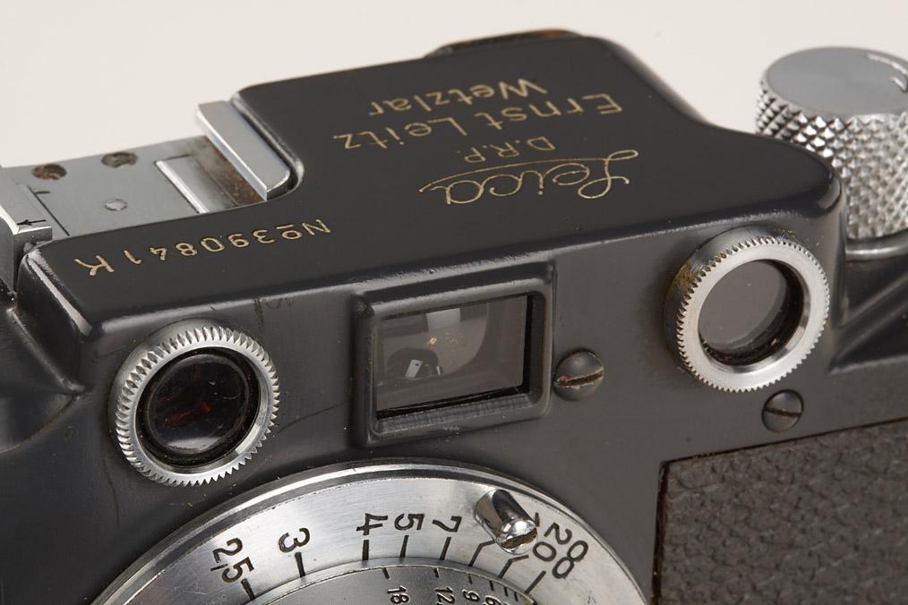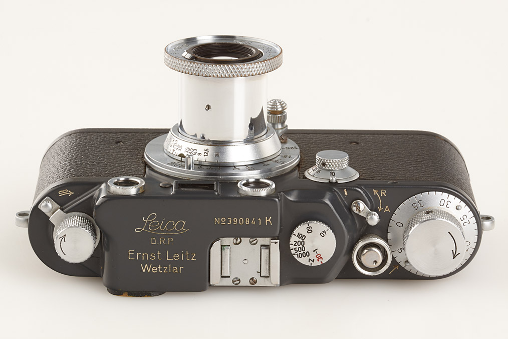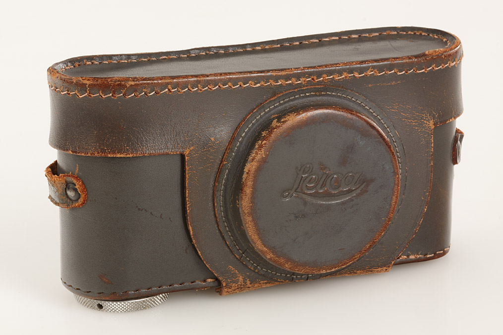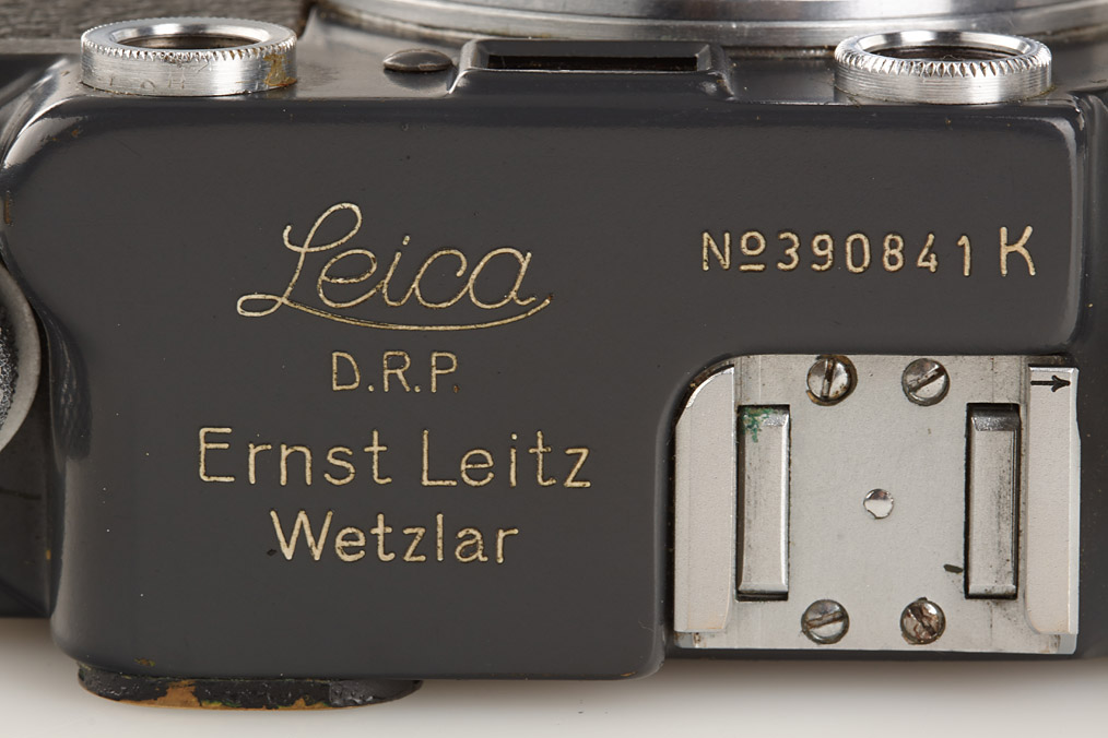 in very fine and fully original condition, grey leather covering (crack on back), white K on shutter blind, Elmar 3.5/5cm no.360147 (cap) and matching grey everready case