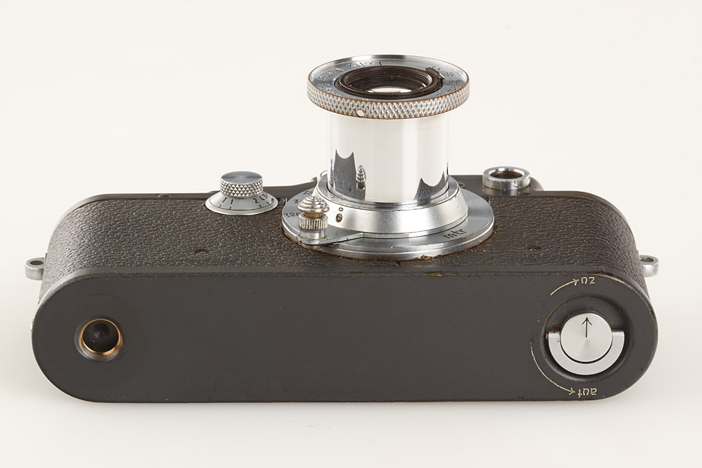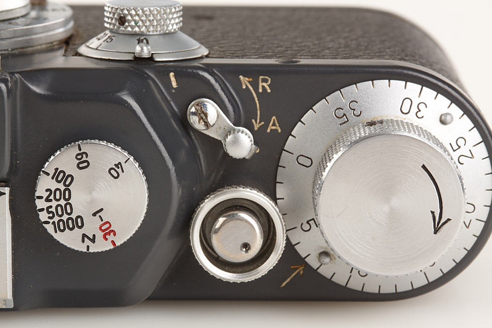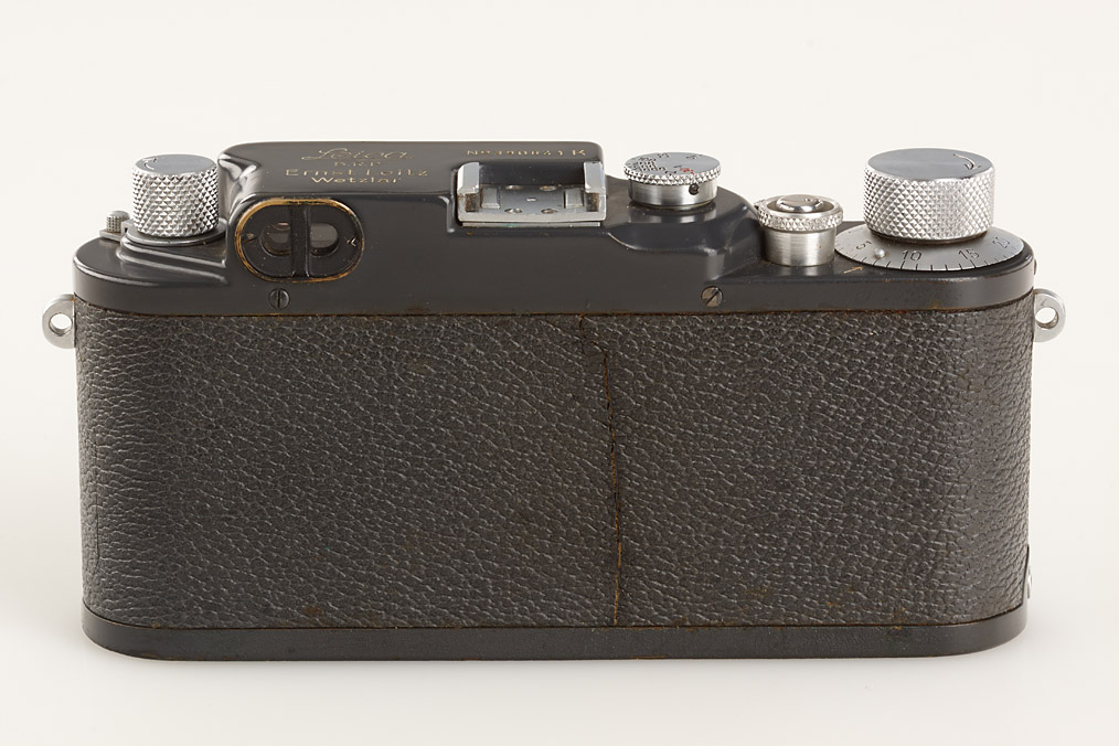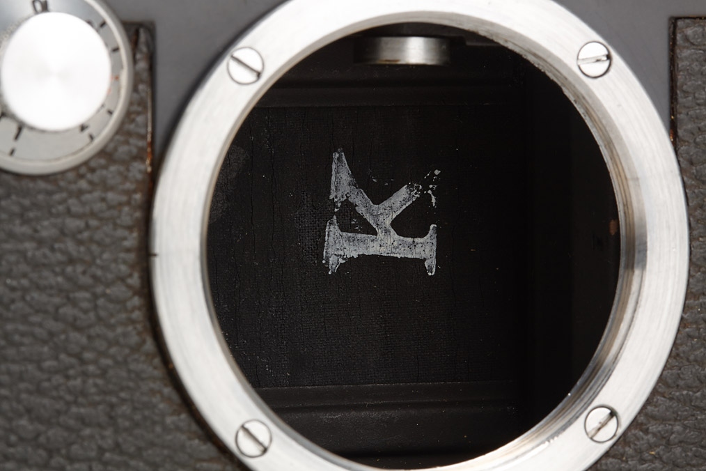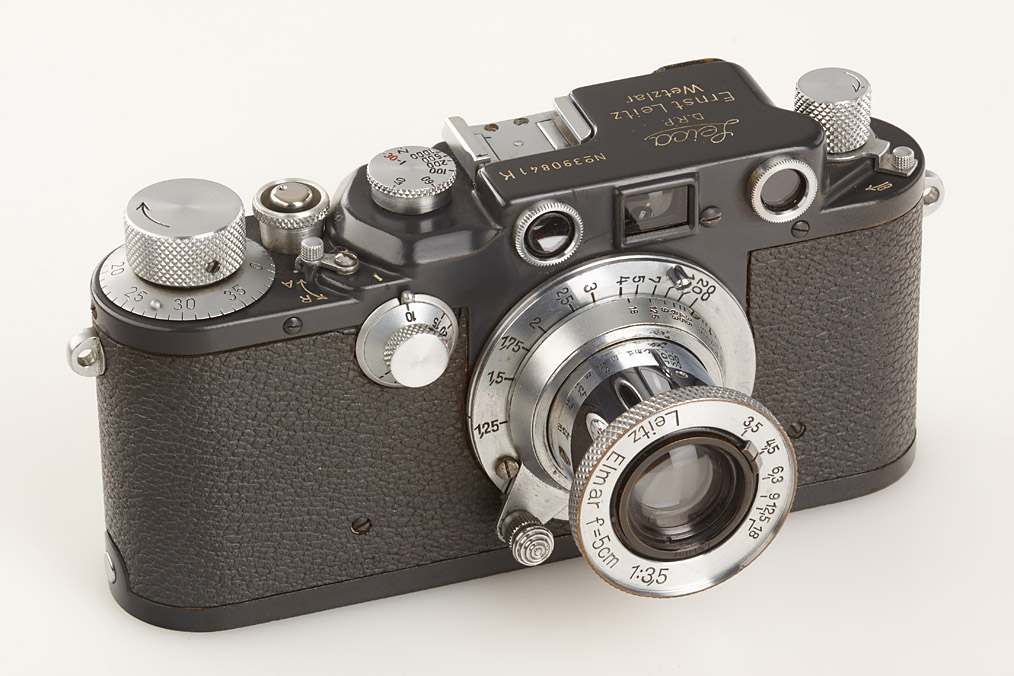 in very fine and fully original condition, grey leather covering (crack on back), white K on shutter blind, Elmar 3.5/5cm no.360147 (cap) and matching grey everready case