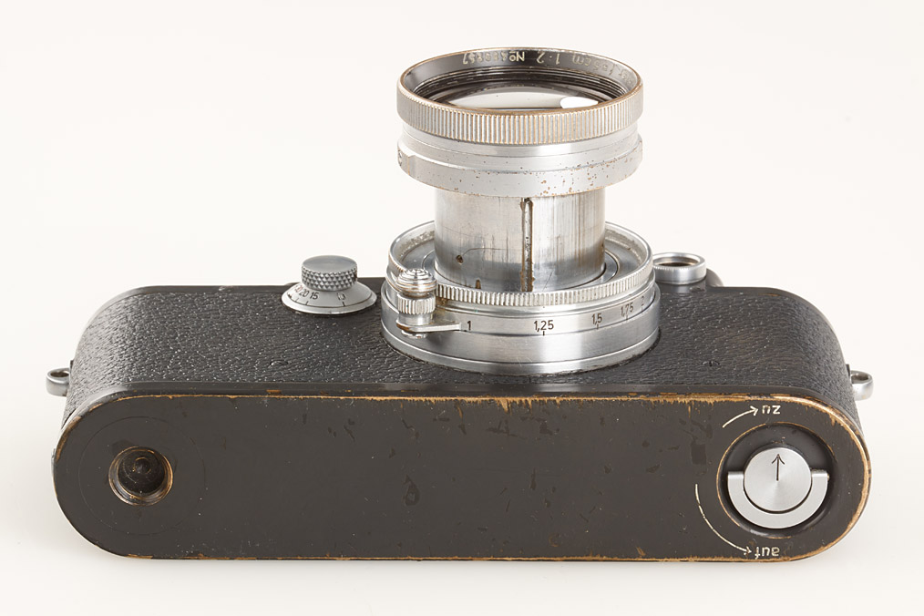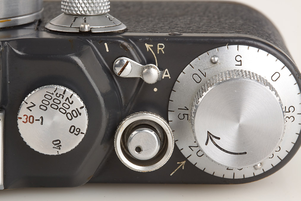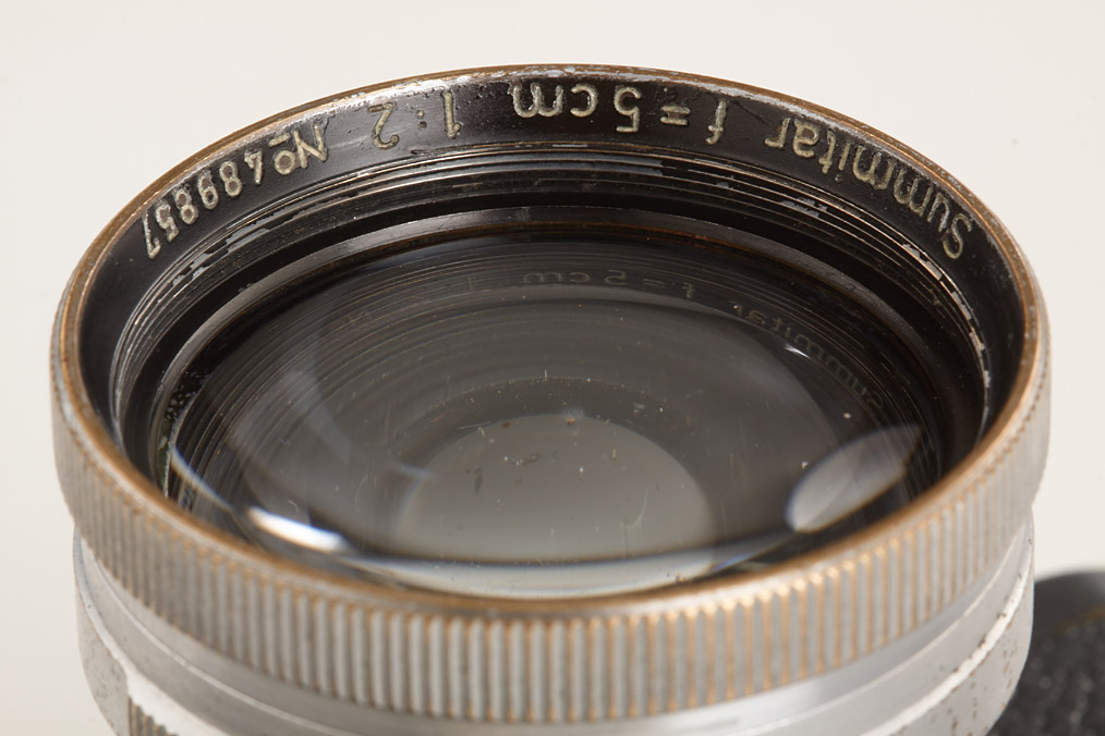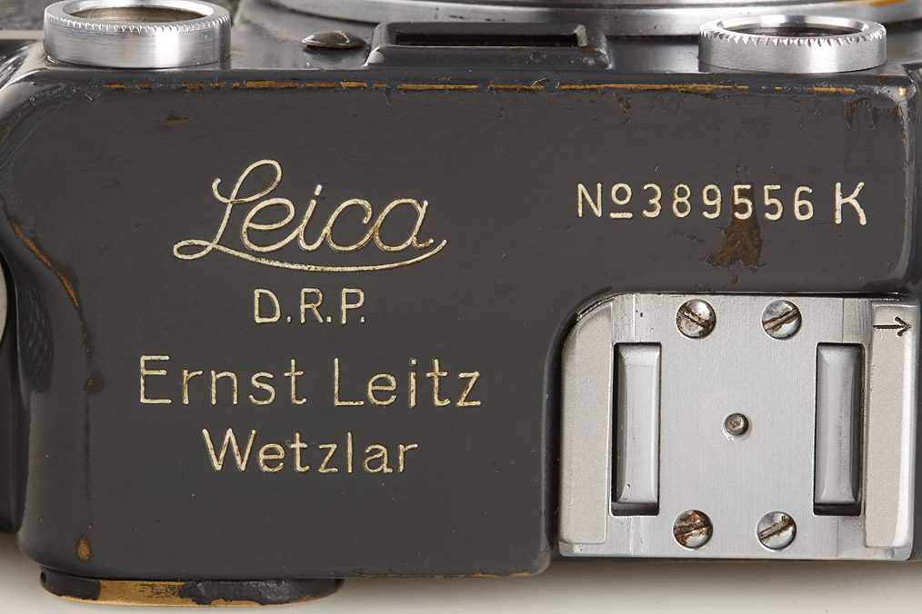 WWII military camera in fine original condition, grey leather covering, very rare with red 'K' on shutter curtain, Summitar 2/5cm no.489857 (cap, yellow filter)
