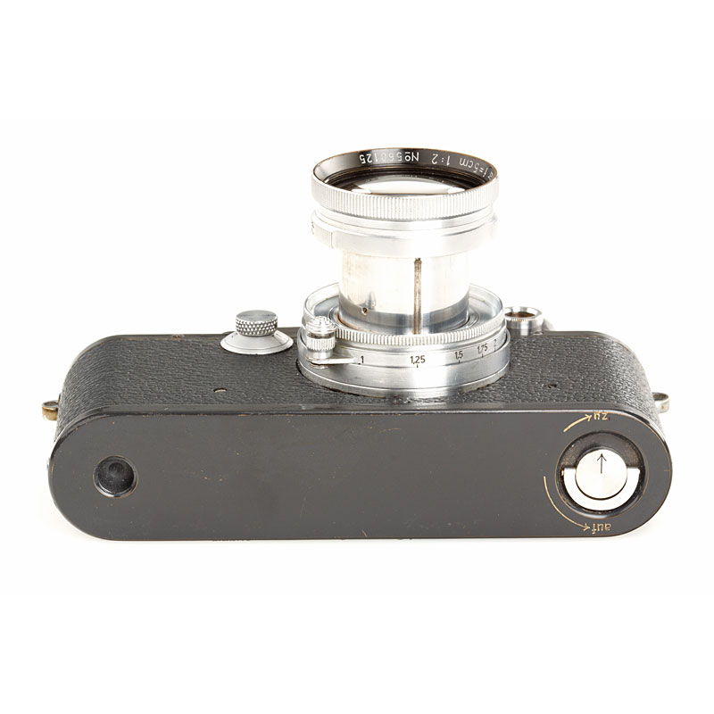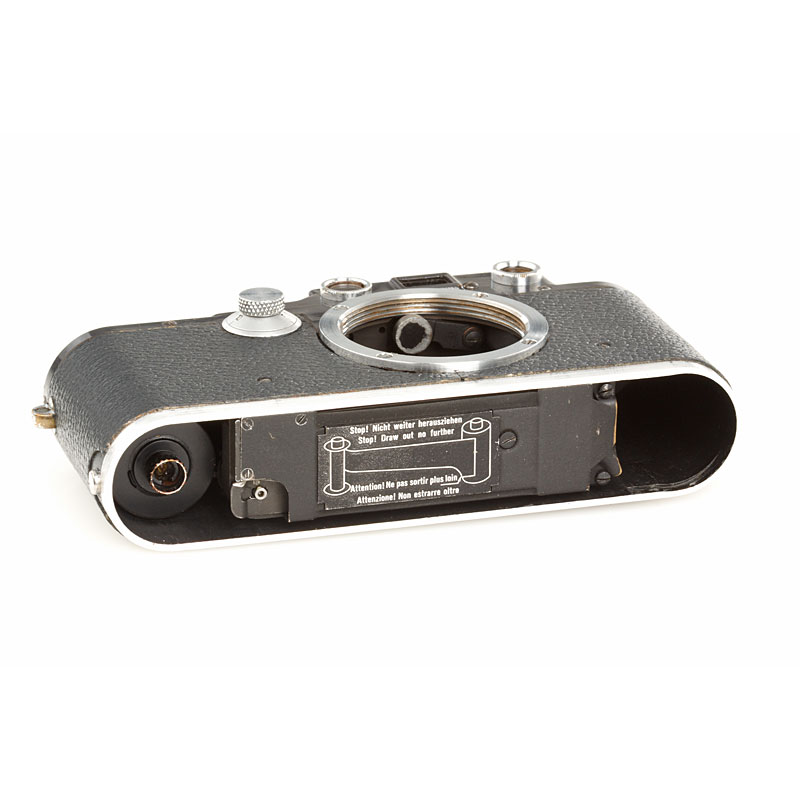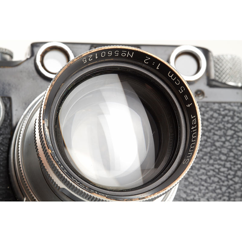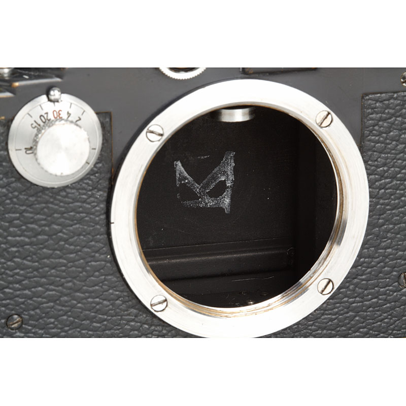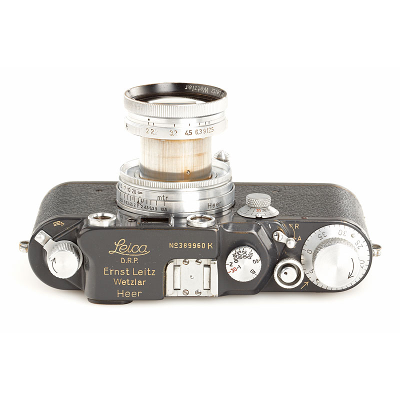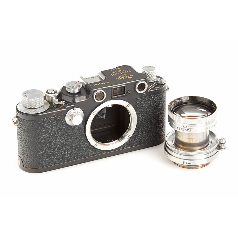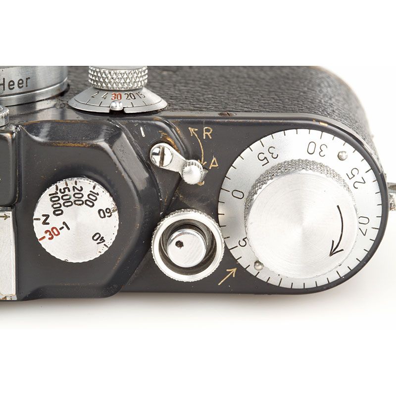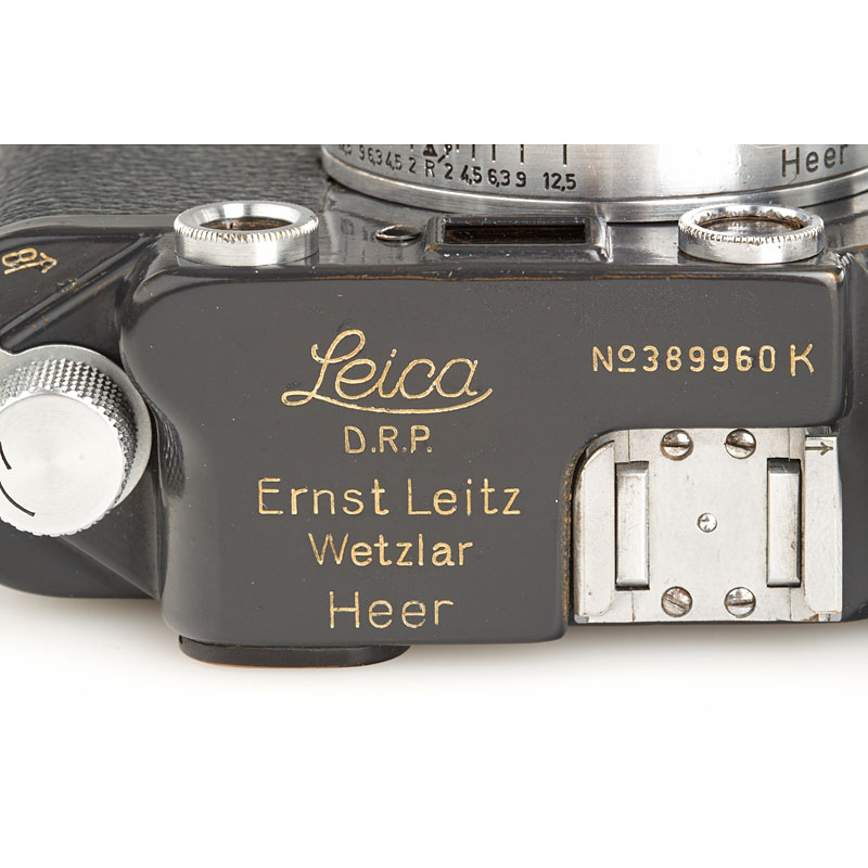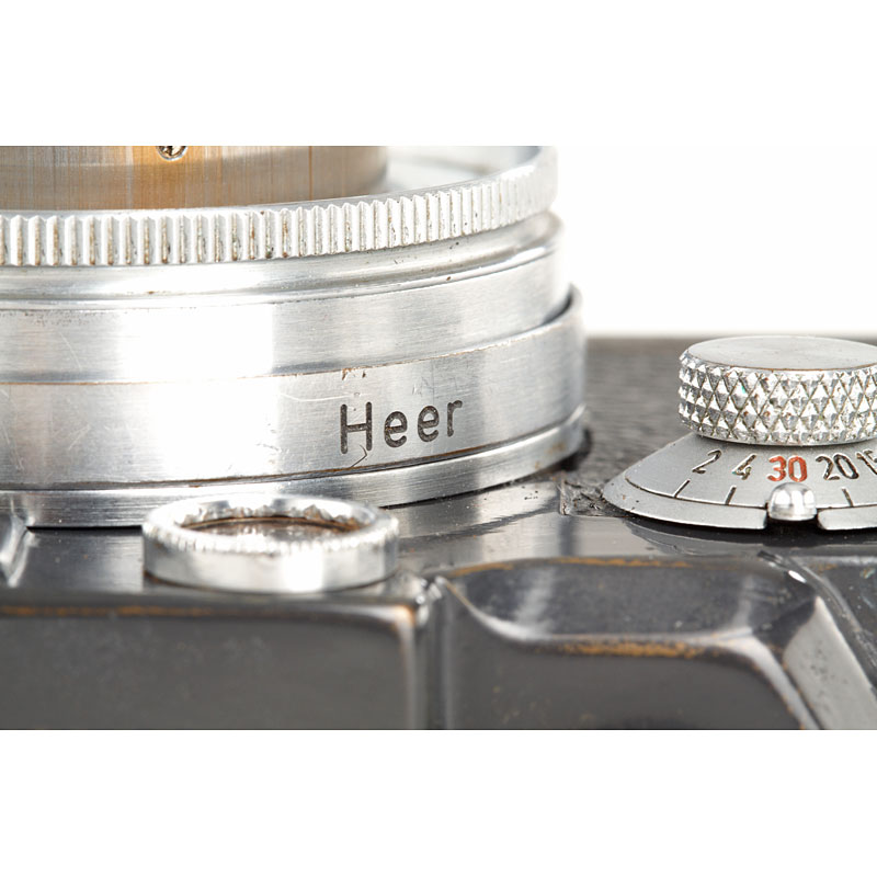 100% authentic and very rare camera in extremely fine condition, engraved 'Heer' on top plate, white 'K' on shutter blind, grey leather covering, delivered to Berlin (Bln) on August 23rd, 1943 (delivery number 9921), matching Summitar 2/5cm no.560125 (cap) engraved 'Heer', delivered to Berlin (Bln) on June 3rd, 1941 (delivery number 25483) - camera and lens with similar engraving are illustrated in Lager Vol.I p.88+89