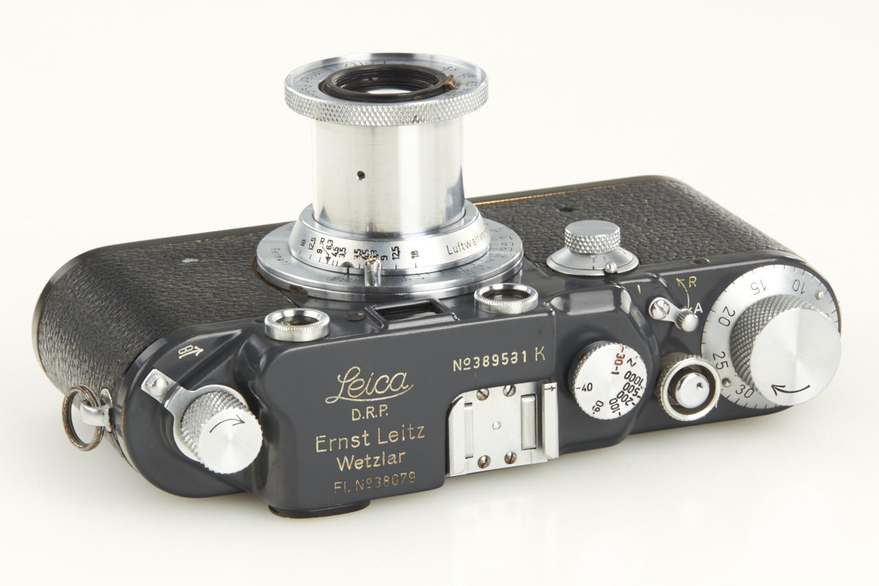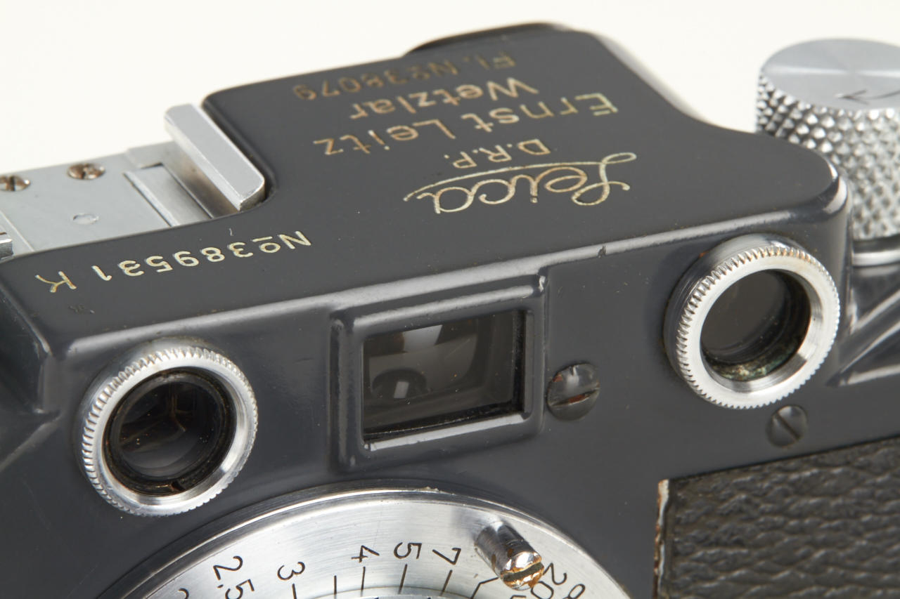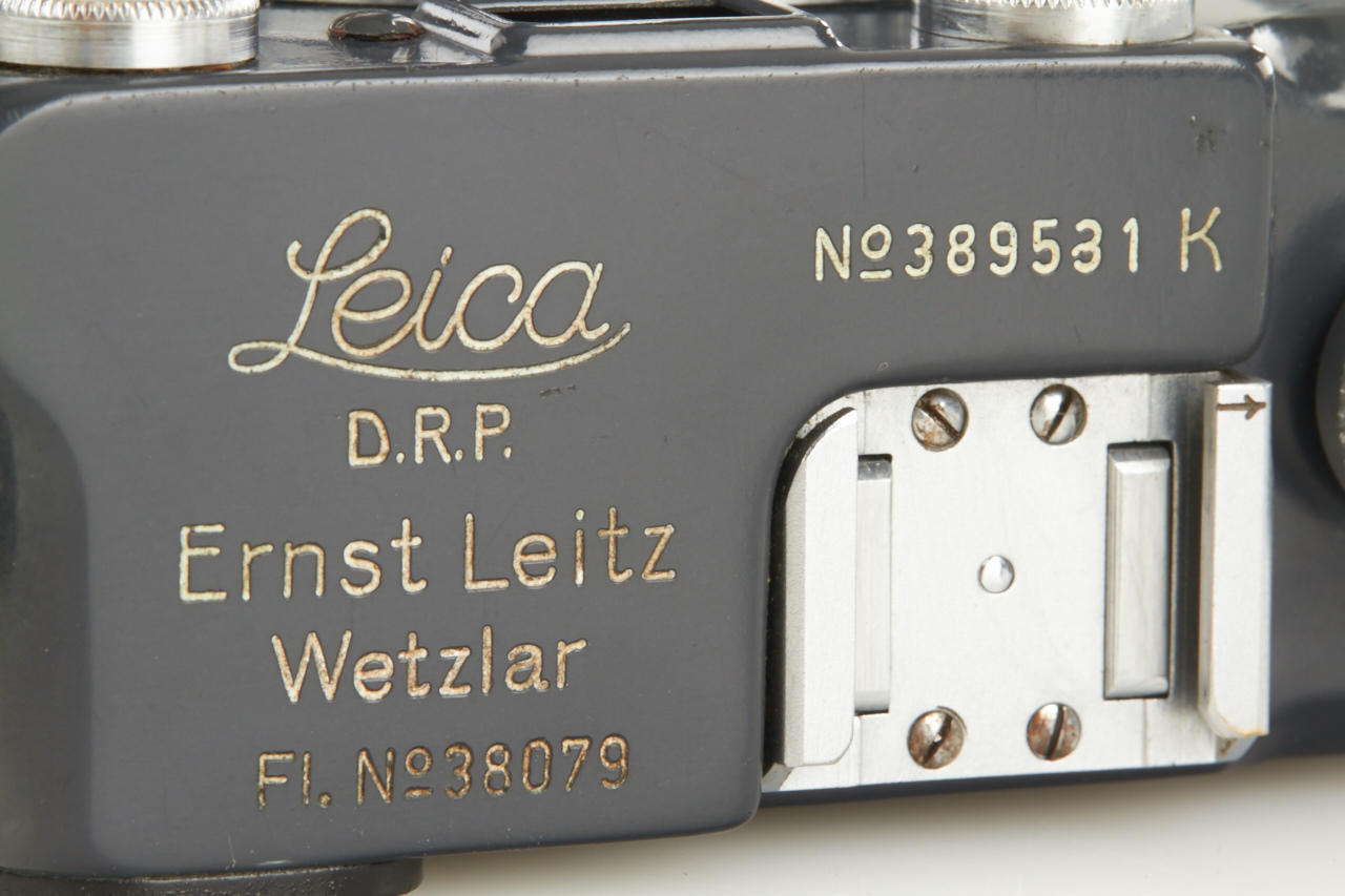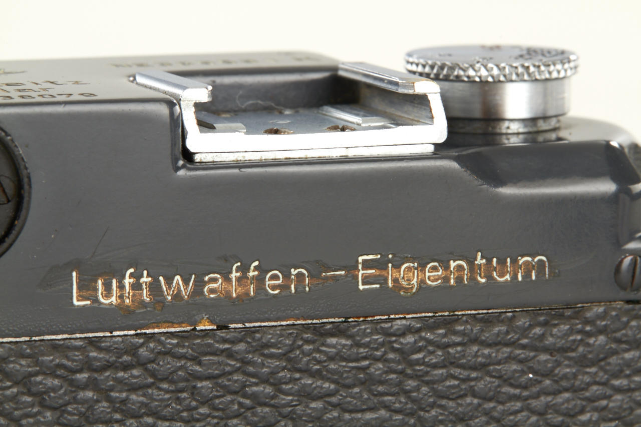 rare military IIIc K grey in beautiful, original and perfect working condition, grey leather covering, engraved 'Luftwaffen-Eigentum' and 'FL.No.38079' on top plate, with red 'K' on shutter curtain, Elmar 3.5/5cm no.571433 engraved 'Luftwaffen-Eigentum', camera and lens were delivered to 'Luftwaffe Berlin' on April 3rd, 1943 (delivery number 9681), inclusive grey painted cap and black everready case stamped 'Bundespolizei' (Federal Police) inside