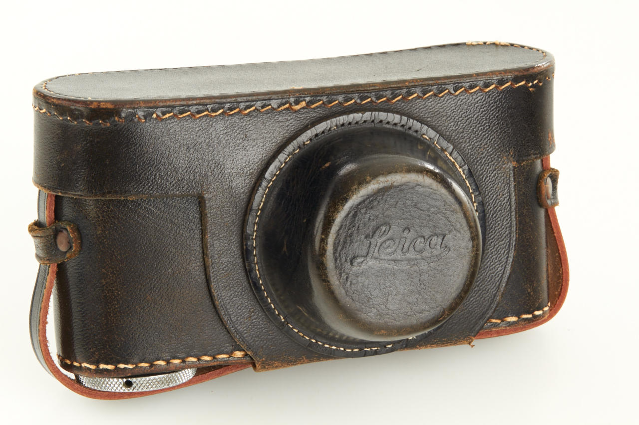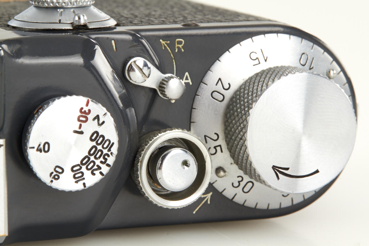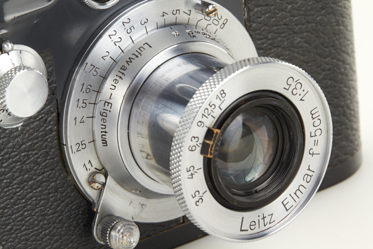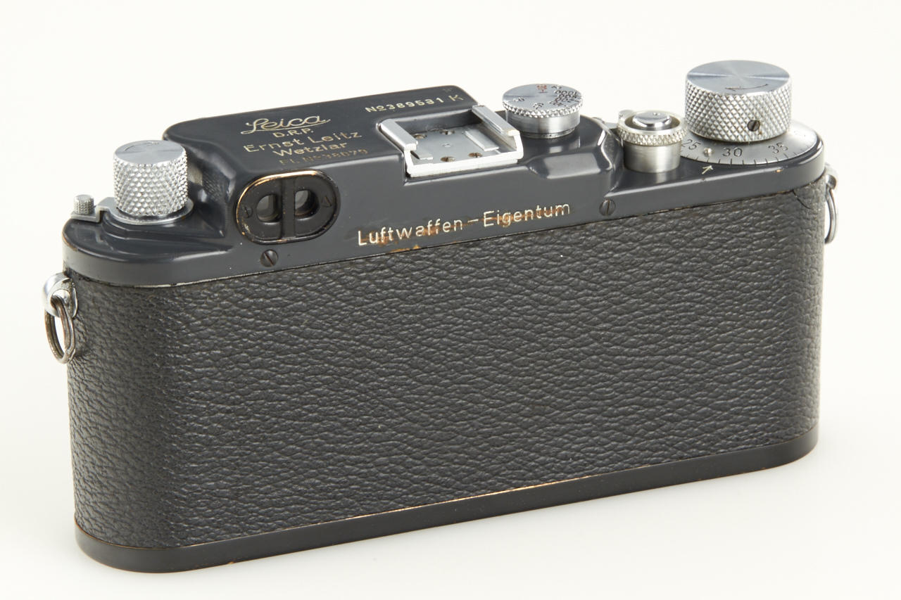 rare military IIIc K grey in beautiful, original and perfect working condition, grey leather covering, engraved 'Luftwaffen-Eigentum' and 'FL.No.38079' on top plate, with red 'K' on shutter curtain, Elmar 3.5/5cm no.571433 engraved 'Luftwaffen-Eigentum', camera and lens were delivered to 'Luftwaffe Berlin' on April 3rd, 1943 (delivery number 9681), inclusive grey painted cap and black everready case stamped 'Bundespolizei' (Federal Police) inside