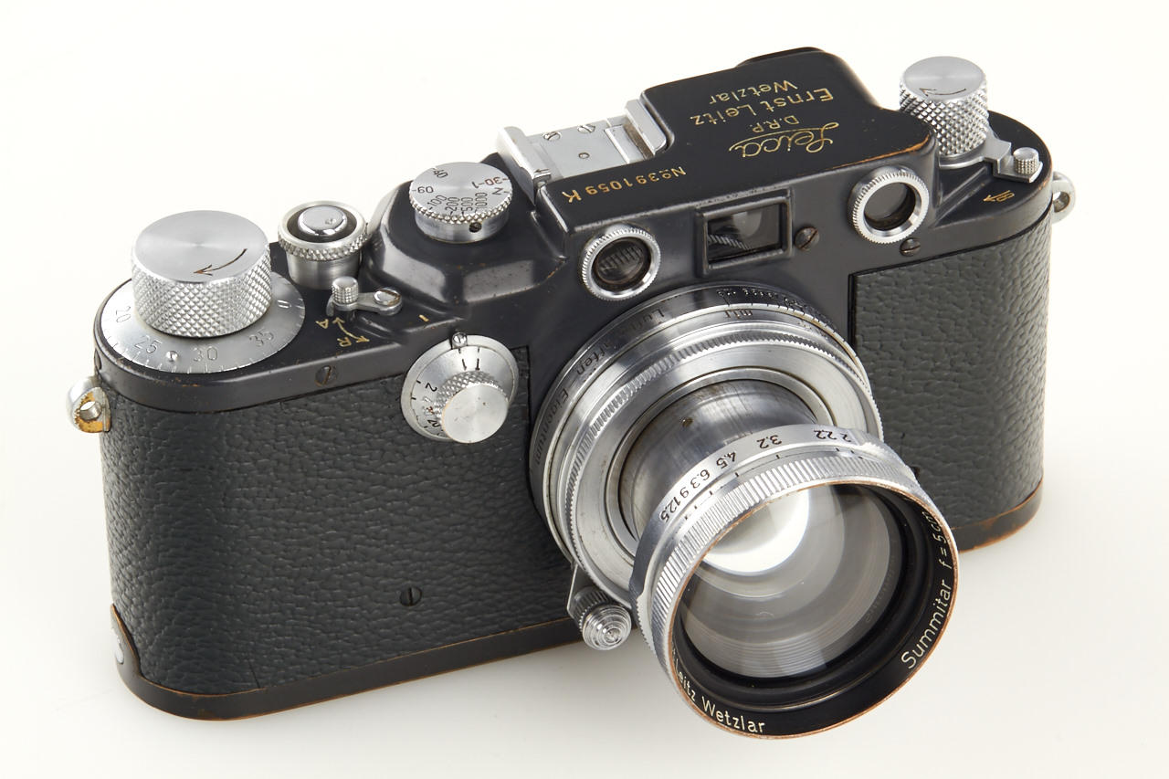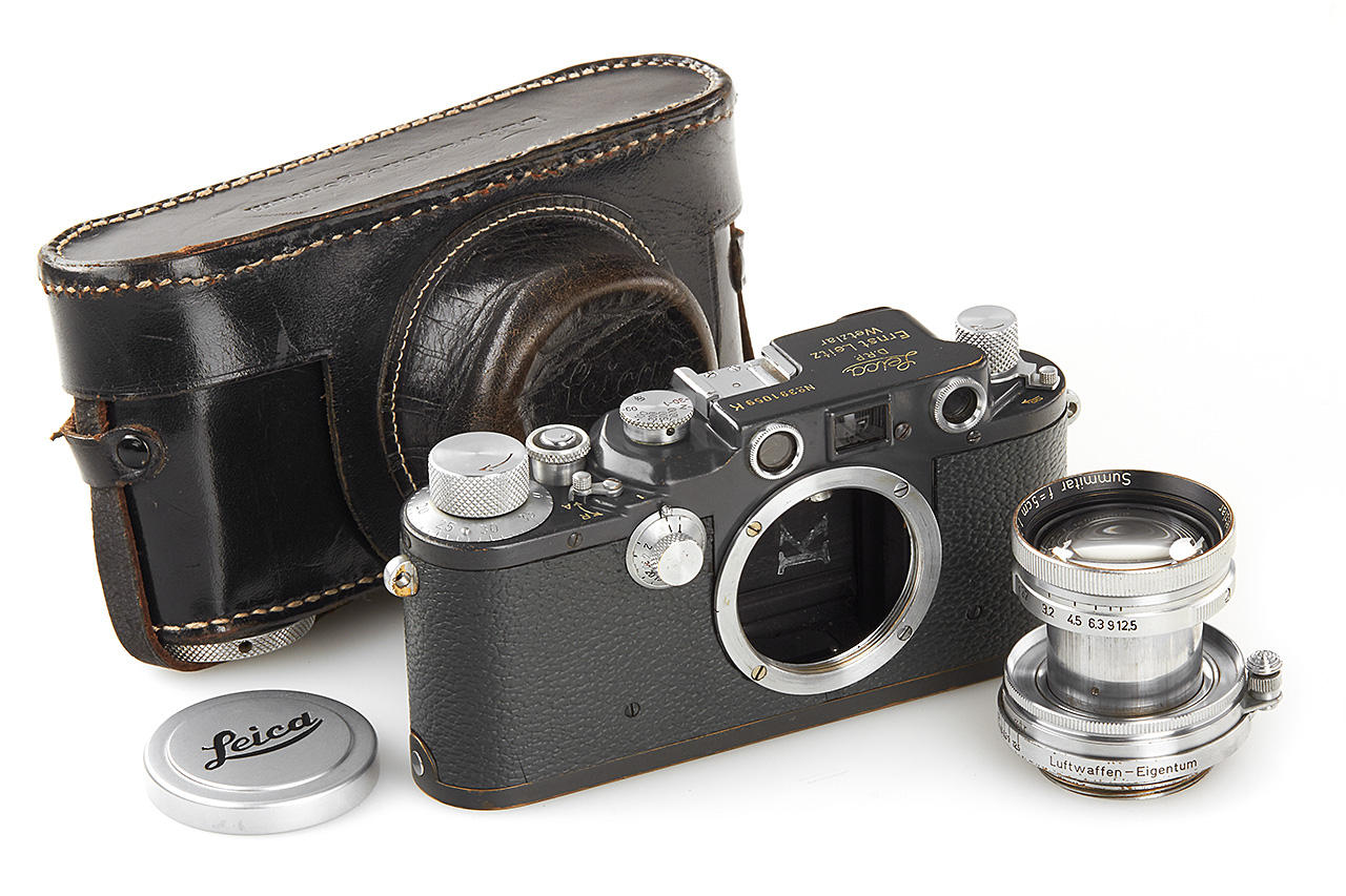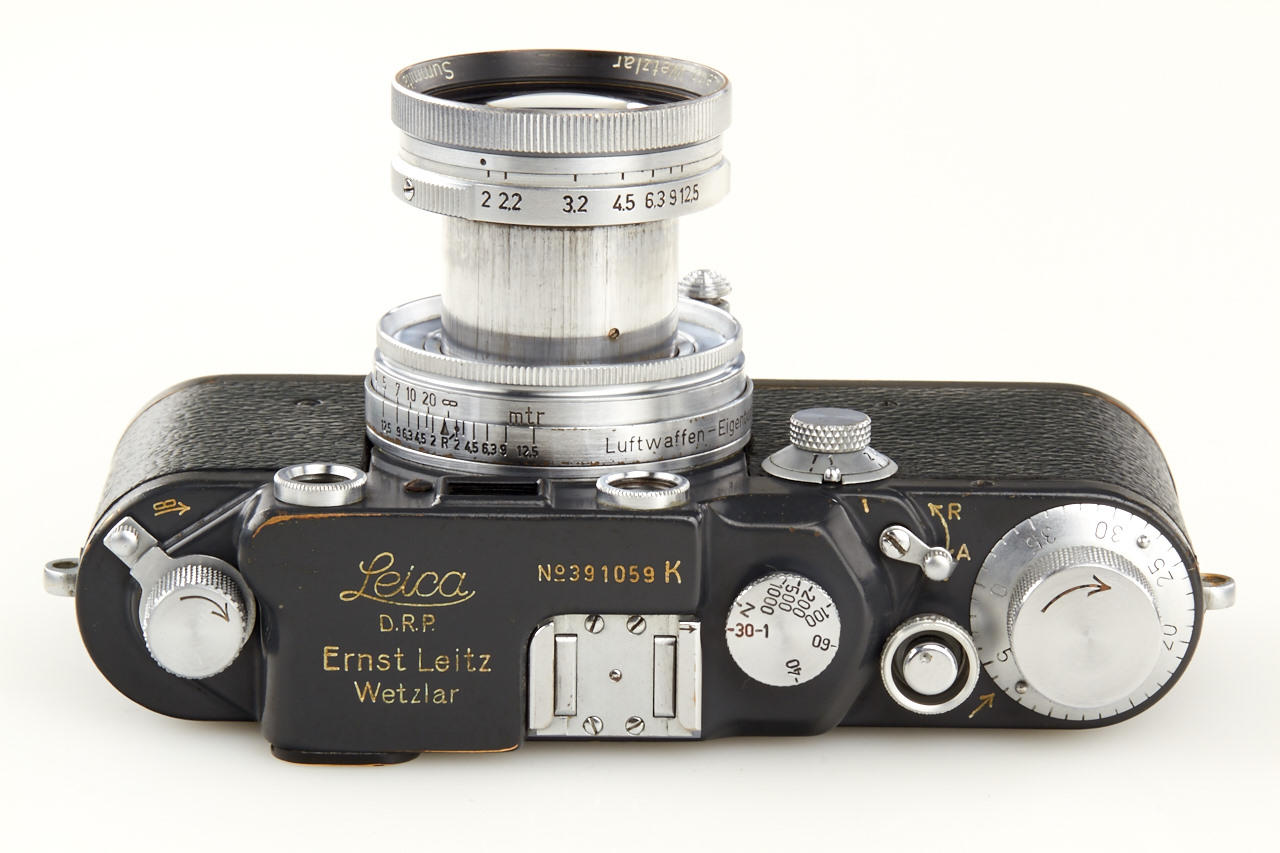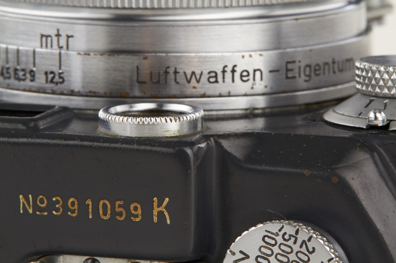 very late IIIc grey with grey leather covering, white 'K' on shutter curtain, in beautiful original and perfect working condition, according to Leitz records the camera was delivered to the American Army in May 1945, Summitar 2/5cm no.554590 engraved 'Luftwaffen-Eigentum', cap, dark everready case stamped 'Luftwaffeneigentum'