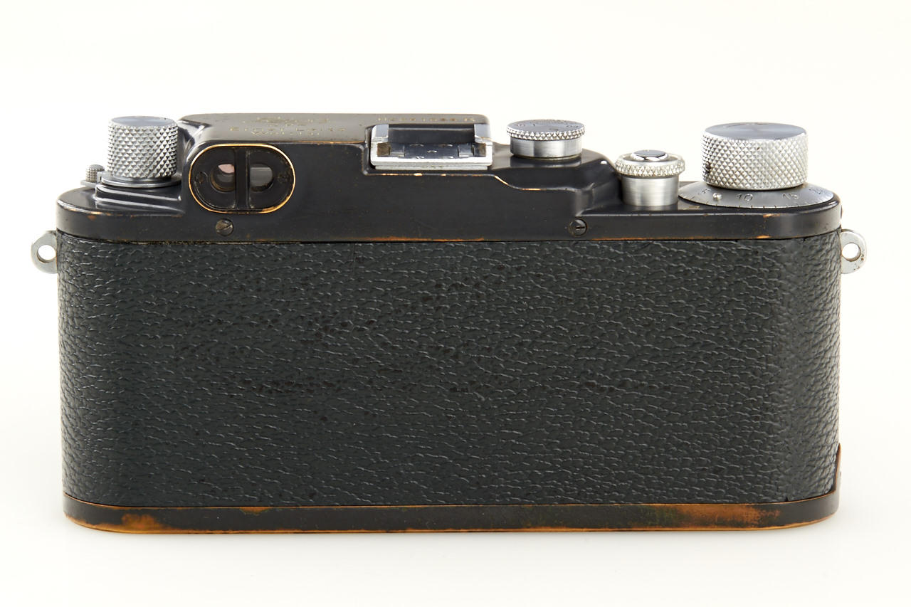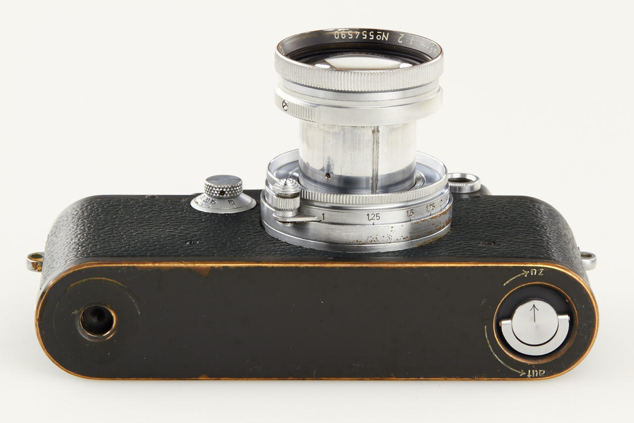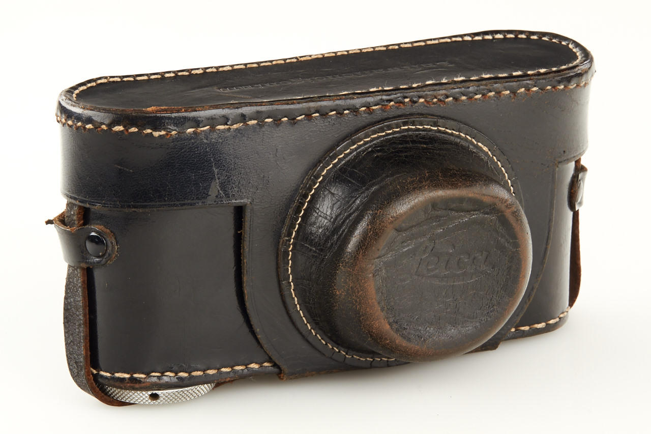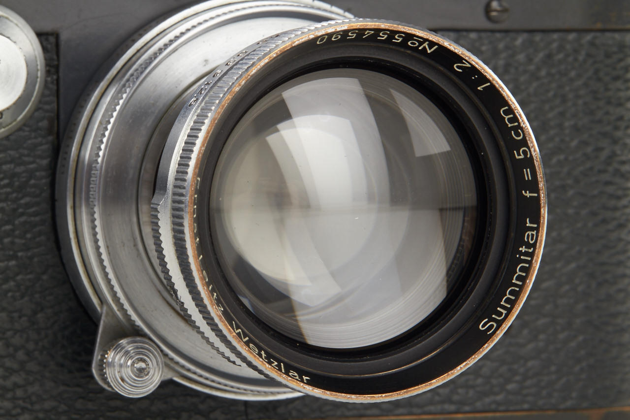 very late IIIc grey with grey leather covering, white 'K' on shutter curtain, in beautiful original and perfect working condition, according to Leitz records the camera was delivered to the American Army in May 1945, Summitar 2/5cm no.554590 engraved 'Luftwaffen-Eigentum', cap, dark everready case stamped 'Luftwaffeneigentum'