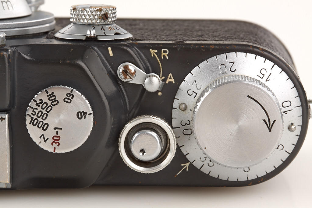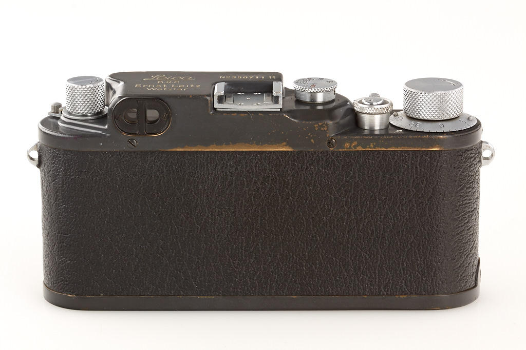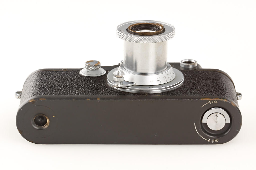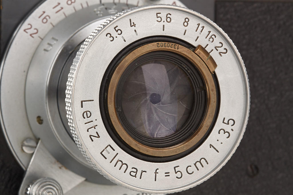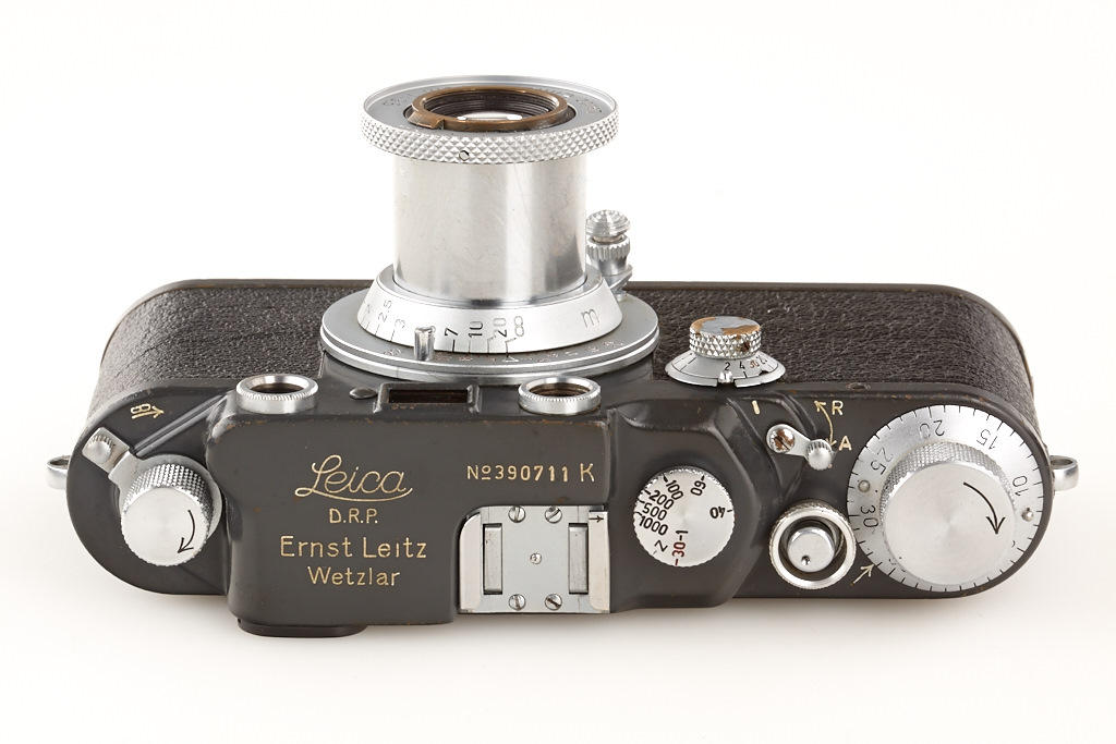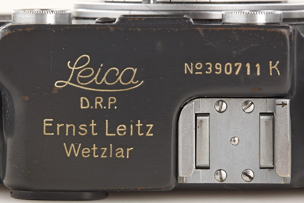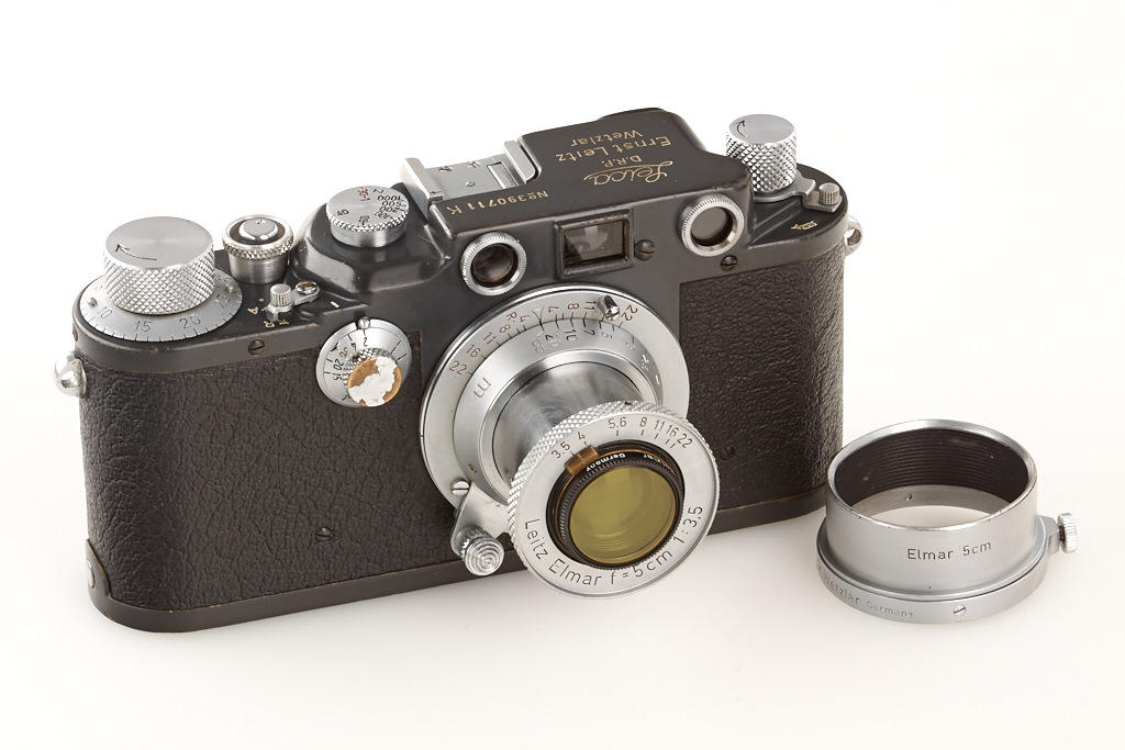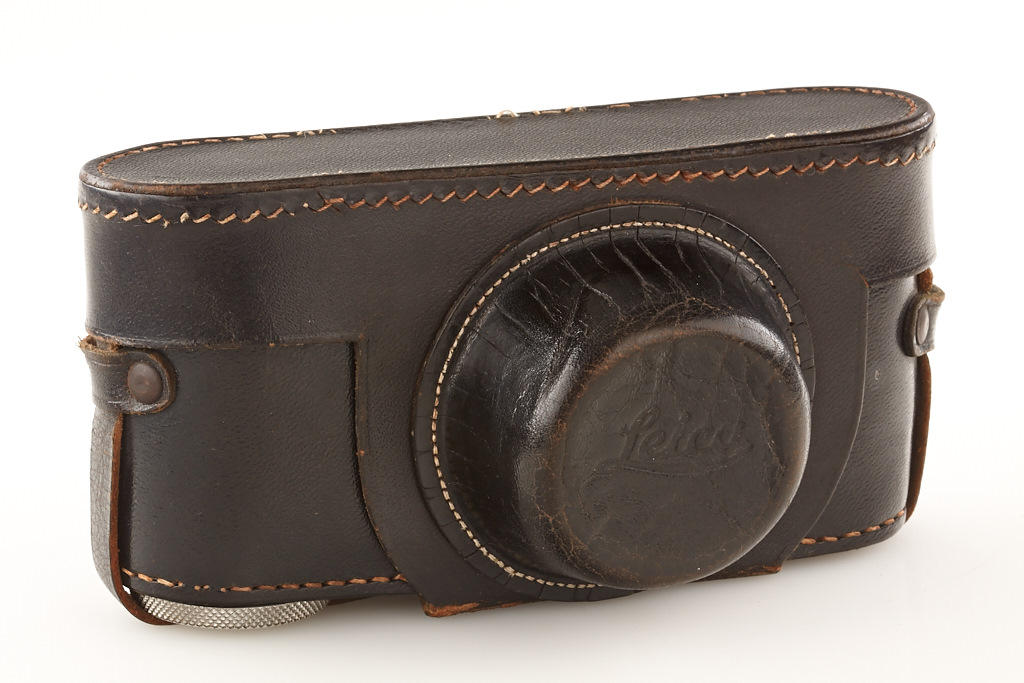 in very fine condition, leather covering replaced, white K on shutter blind, red scale Elmar 3.5/5cm no.1320302 (yellow filter 1, FISON, cap), black everready case