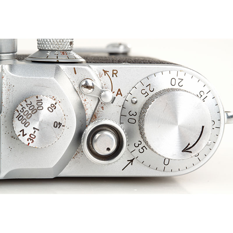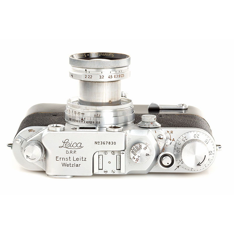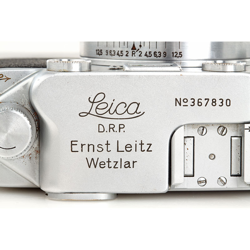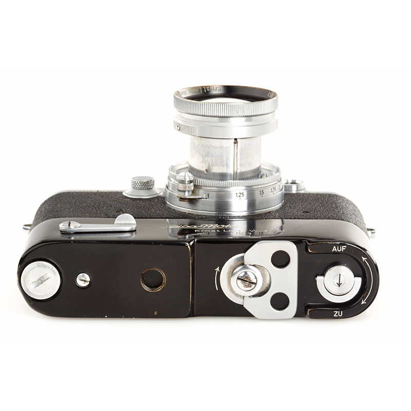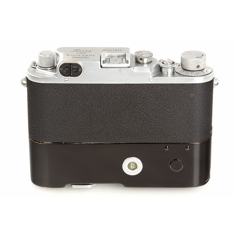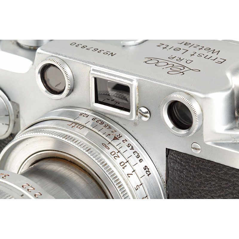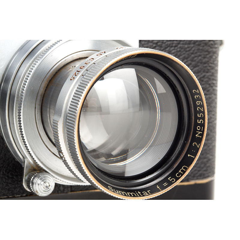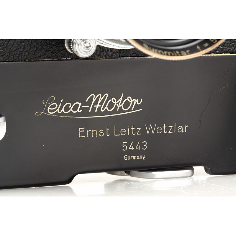 fine war-time IIIc body with red shutter blind with matching Summitar 2/5cm no.552932 and rare spring motor drive MOOLY-C no.5443 in black paint with internal coupling (for Leica models IIIc and IIId, in good working order and original condition), rare matching brown leather everready case EYSOO