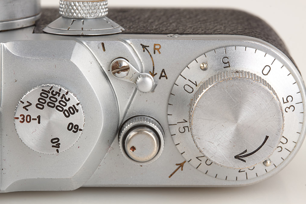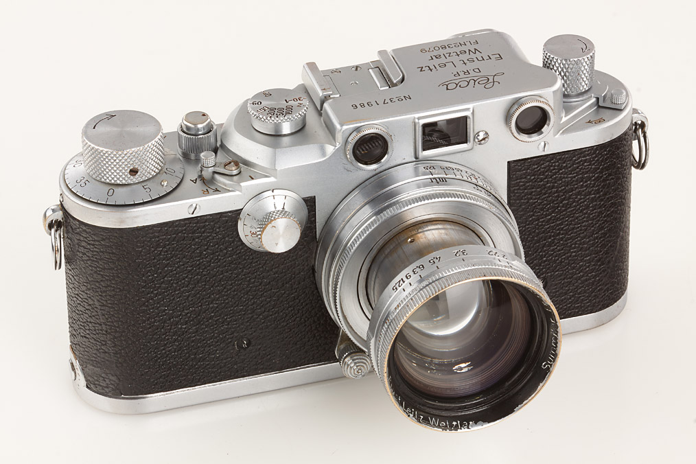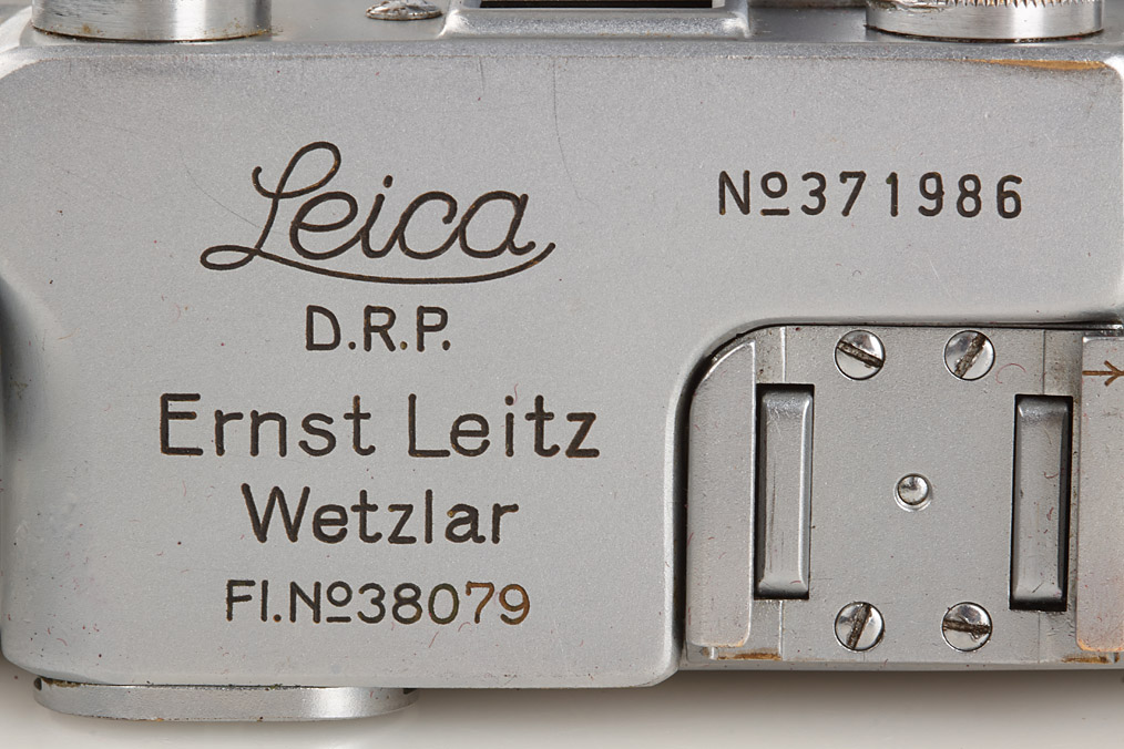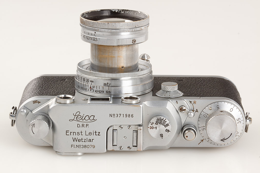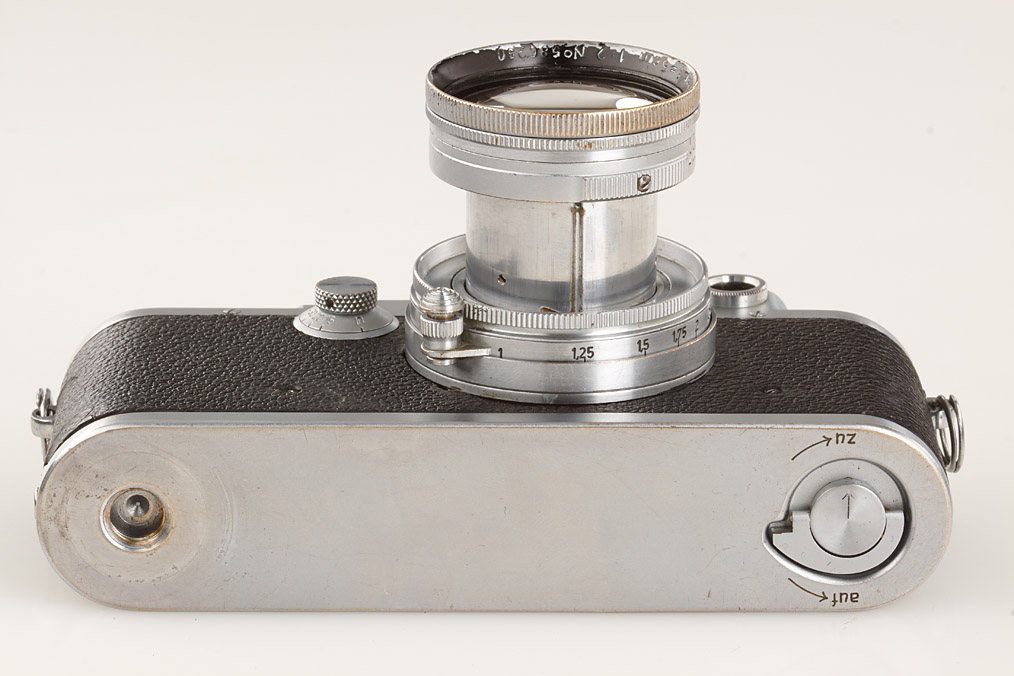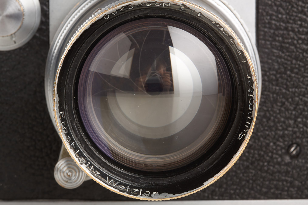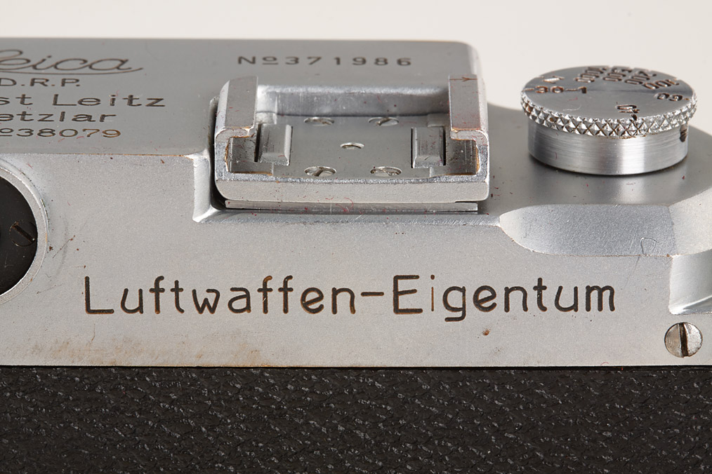 fully original military Leica engraved 'Luftwaffen-Eigentum' and 'Fl.No.38079' on top plate, with original Summitar 2/5cm no.586260 (focusing mount replaced), body delivered on April 1st, 1941 to Luftwaffe BLN Berlin (delivery number 25022), lens delivered on July 24th, 1943 to BLN Berlin (delivery number 9908), brown everready case (inside marked 'Noblitt Capt.')