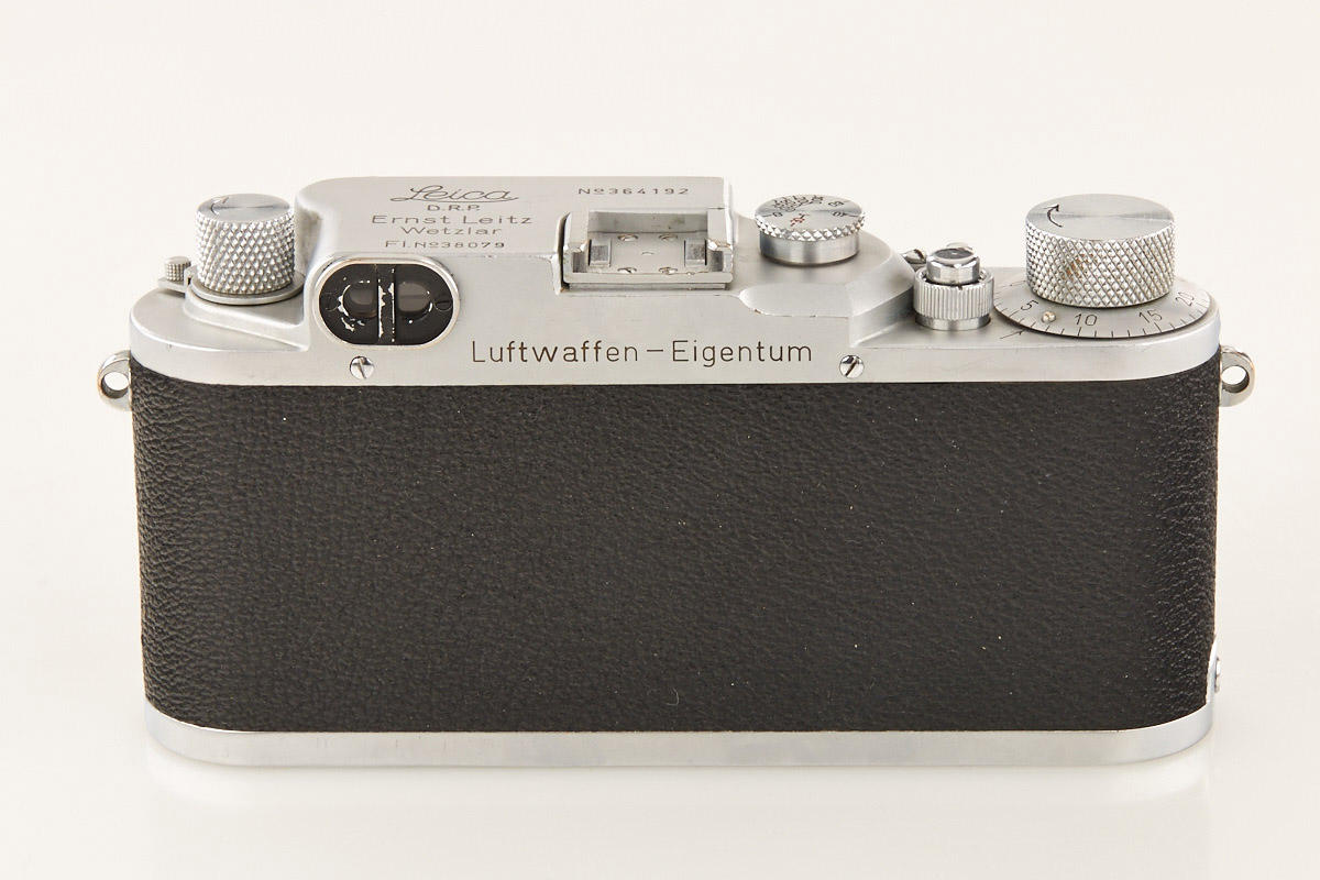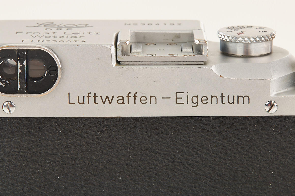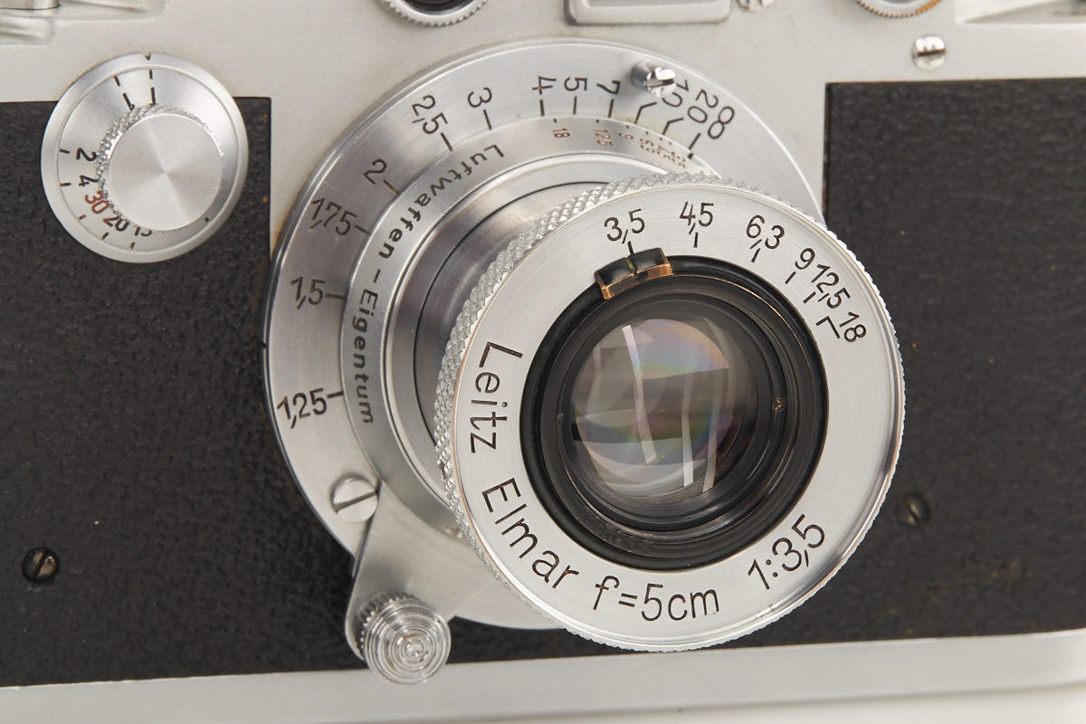 fully original Luftwaffen IIIc, top plate engraved 'FL.No.38079' + 'Luftwaffen-Eigentum', matching Elmar 3.5/5cm no.545888 engraved 'Luftwaffen-Eigentum', the camera was delivered on October 3rd, 1940 to Luftwaffe BLN Berlin (delivery number 19149), the Elmar lens was delivered on January 6th, 1941 to BLN Berlin (delivery number 19784) - ex Bawendi collection