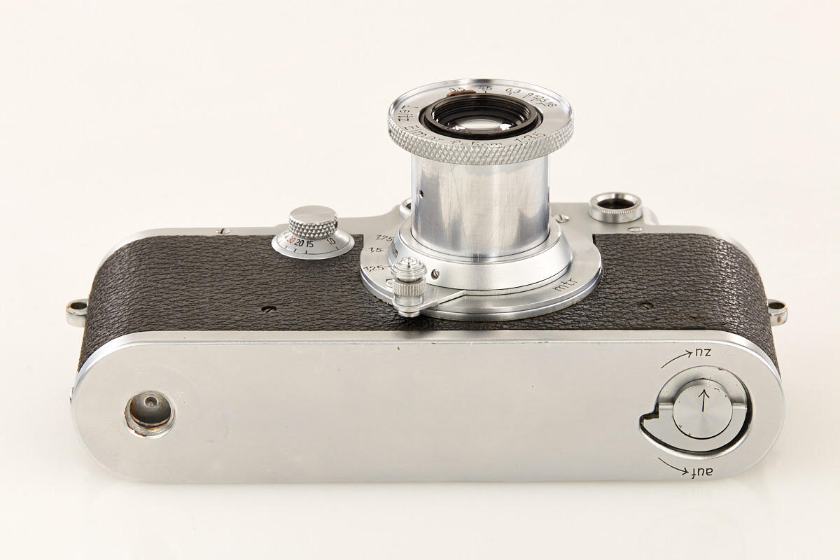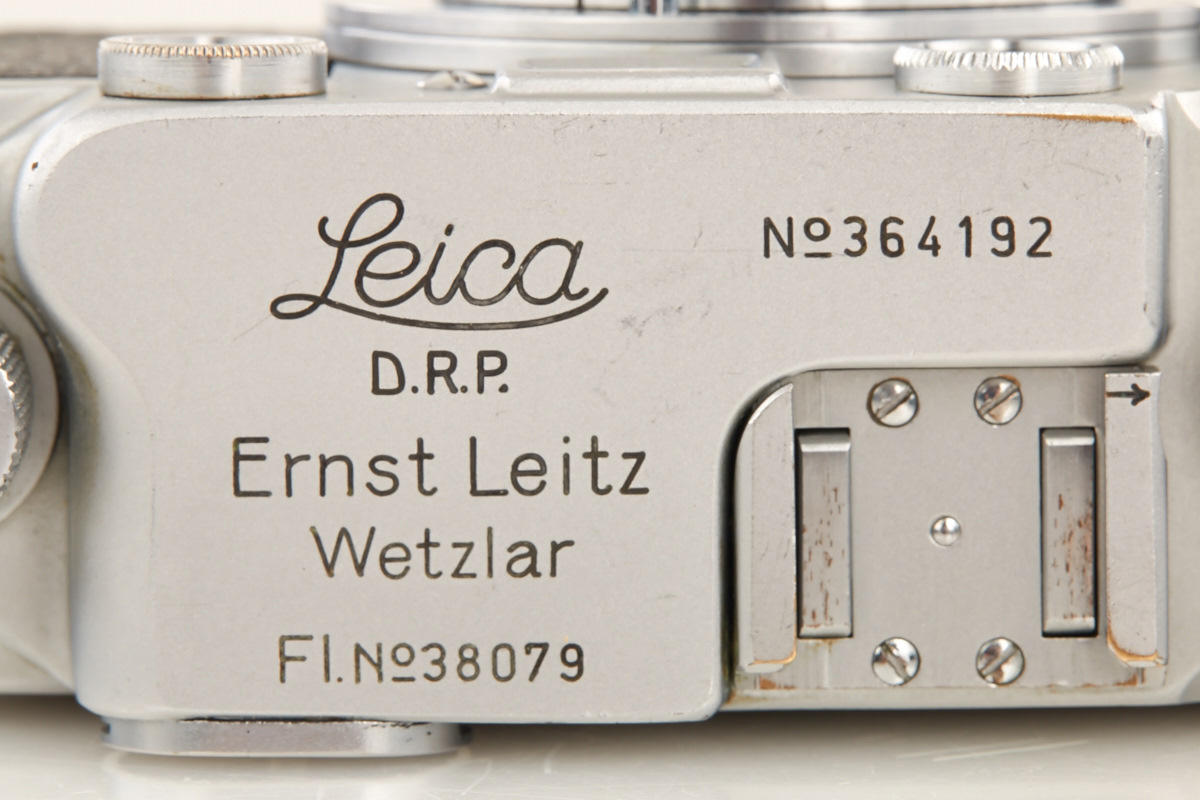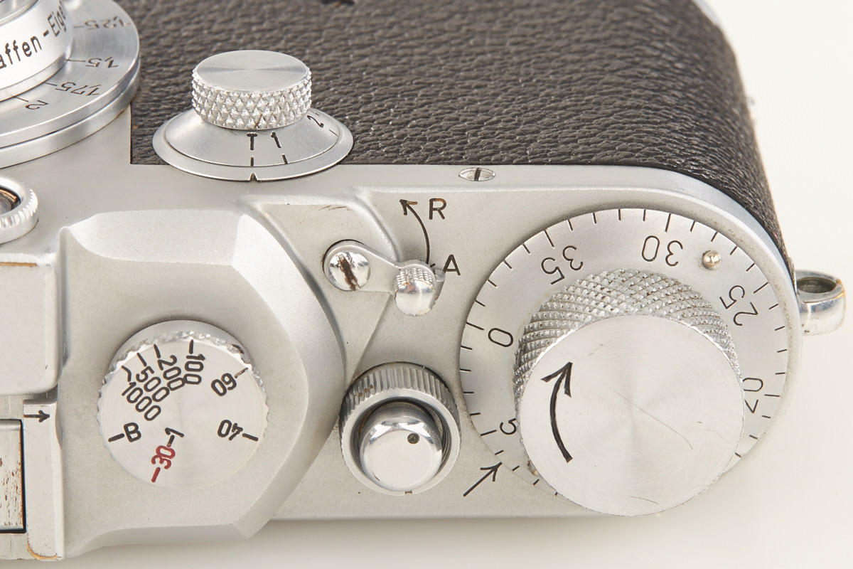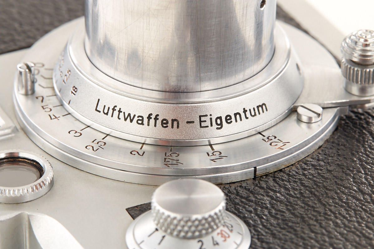 fully original Luftwaffen IIIc, top plate engraved 'FL.No.38079' + 'Luftwaffen-Eigentum', matching Elmar 3.5/5cm no.545888 engraved 'Luftwaffen-Eigentum', the camera was delivered on October 3rd, 1940 to Luftwaffe BLN Berlin (delivery number 19149), the Elmar lens was delivered on January 6th, 1941 to BLN Berlin (delivery number 19784) - ex Bawendi collection