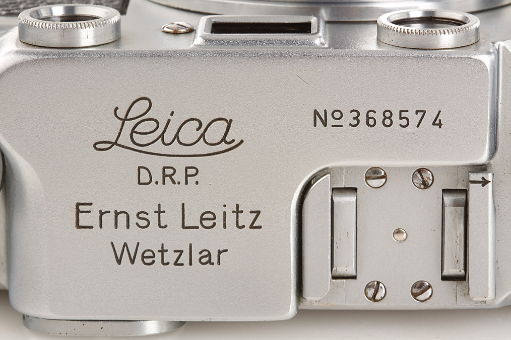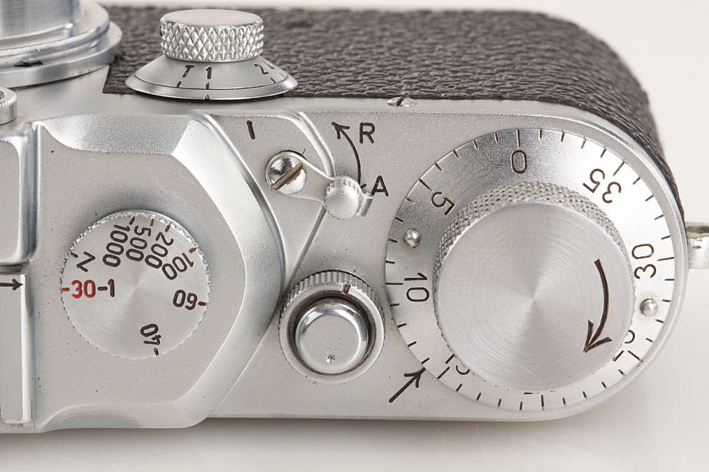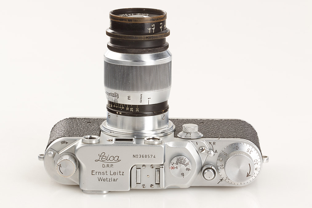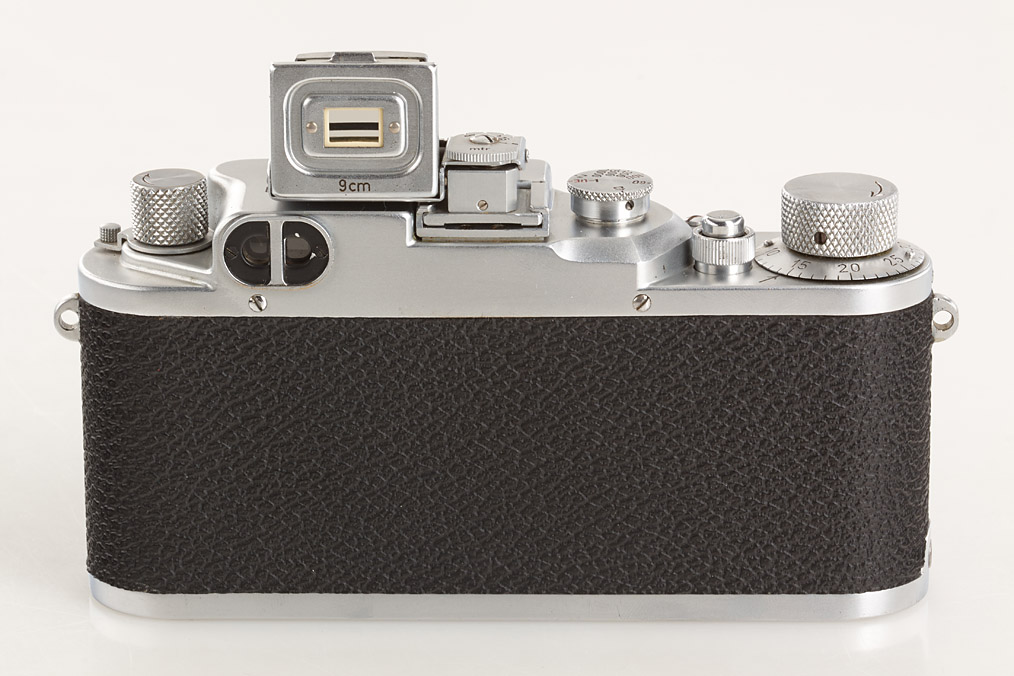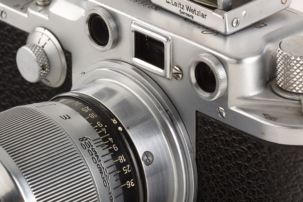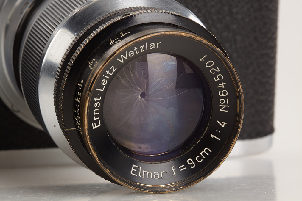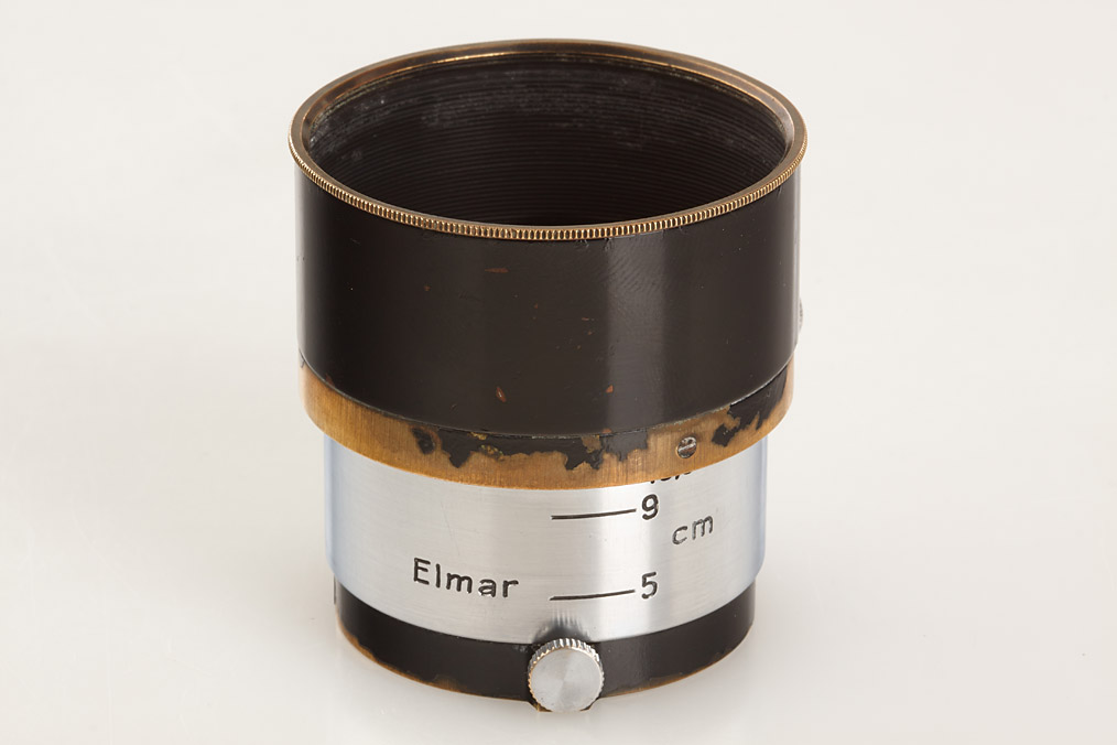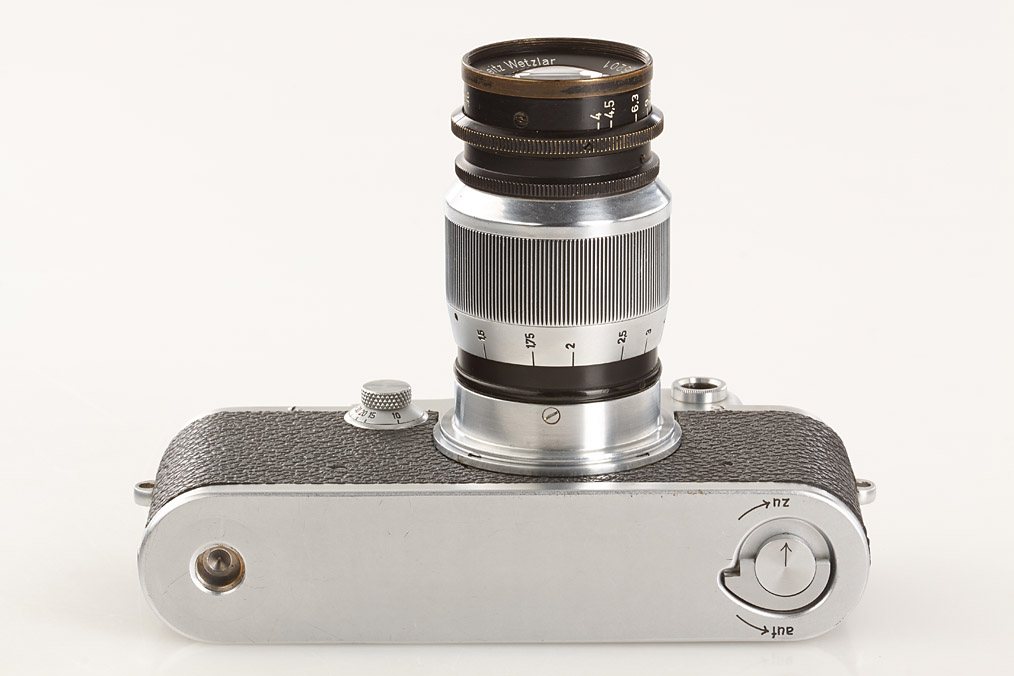 in good working order (leather covering exchanged) with unusual black/chrome finished coated Elmar 4/9cm no.645201, FIKUS hood and SEROO 9cm folding finder (meter scale)