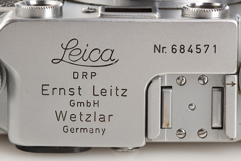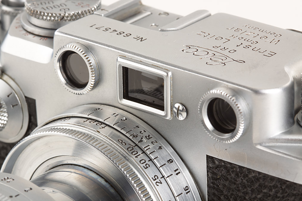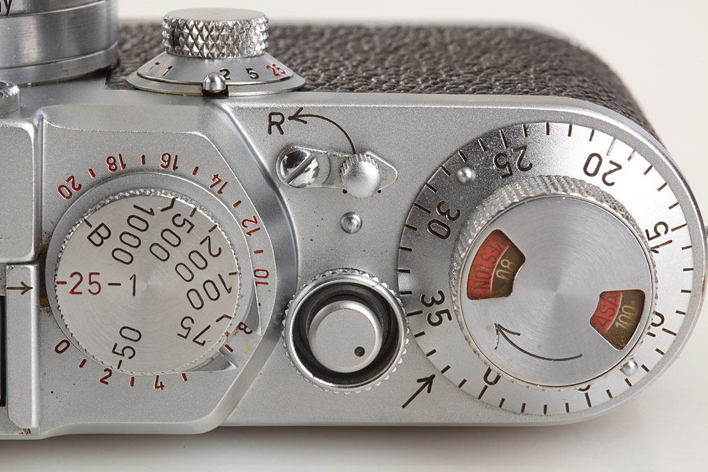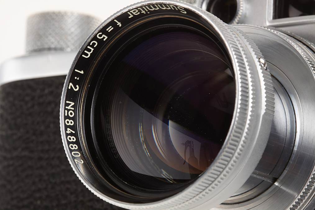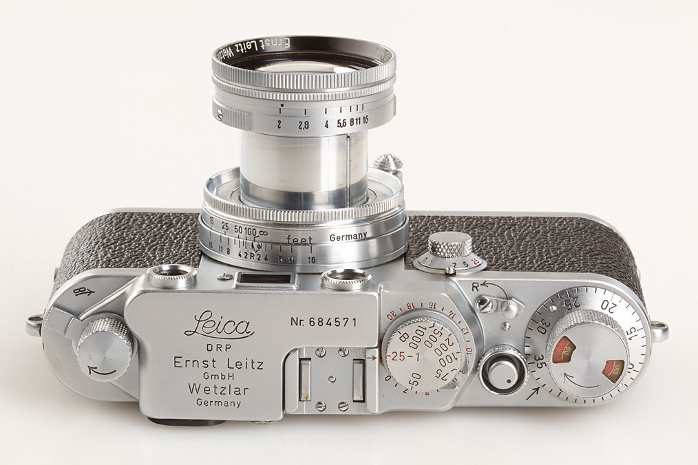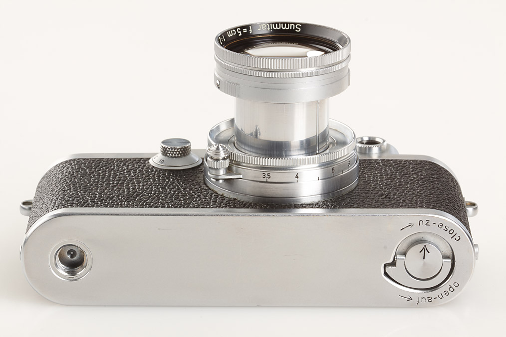 rare Ernst Leitz Canada black dial camera from the second batch (with Wetzlar top plate), WESTON film-speed indicator on winding knob, base plate engraved 'open-auf close-zu', matching Summitar 2/5cm no.848802 (cap)