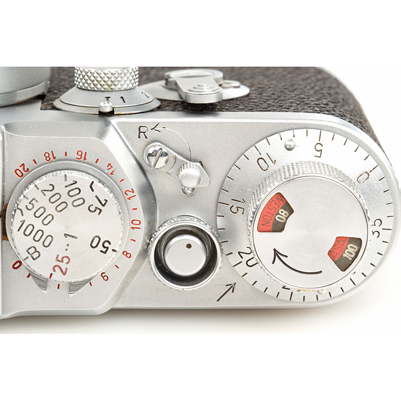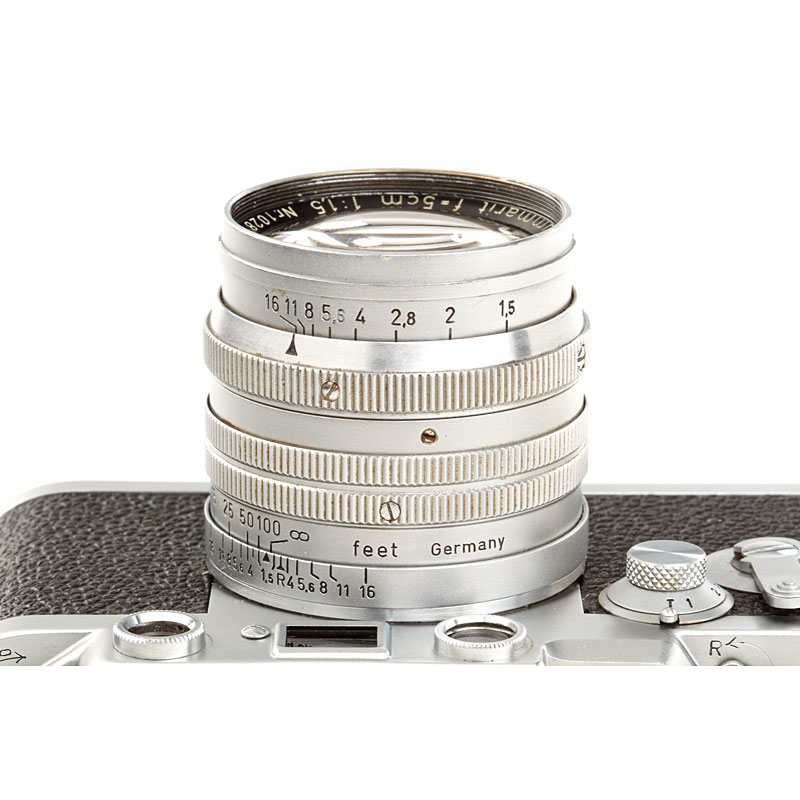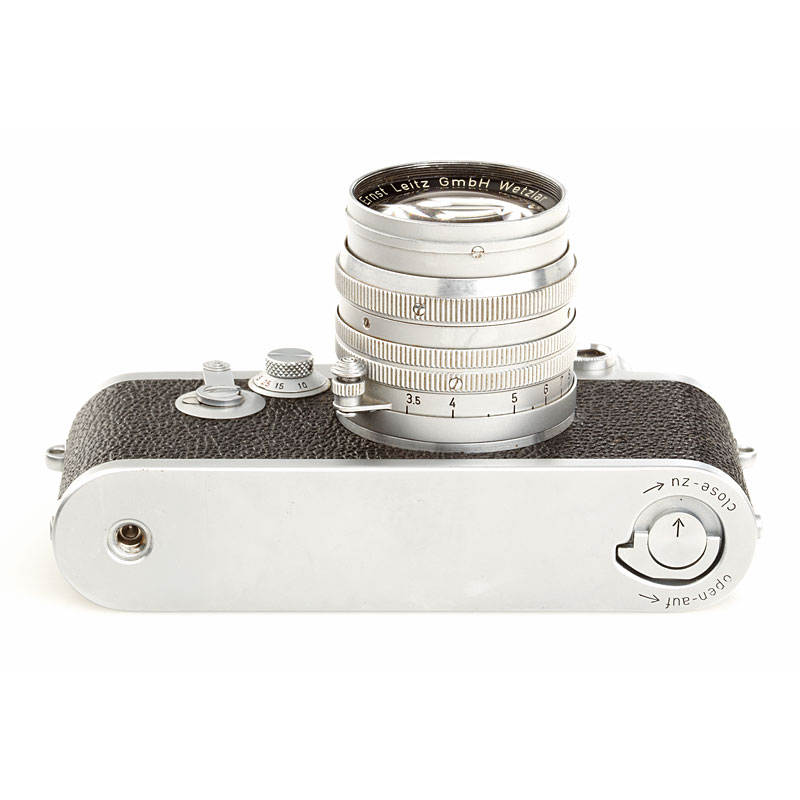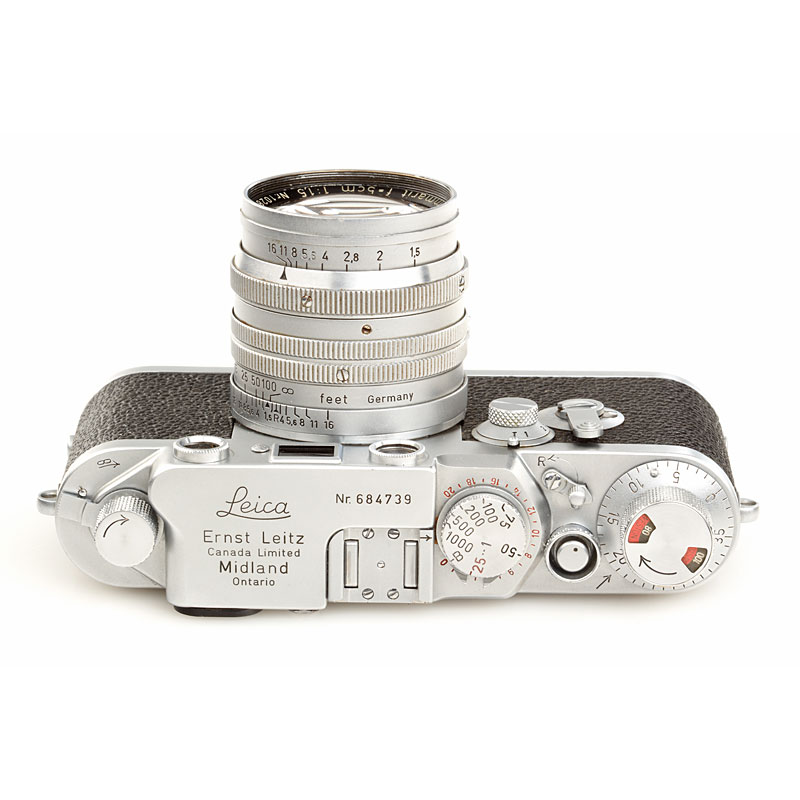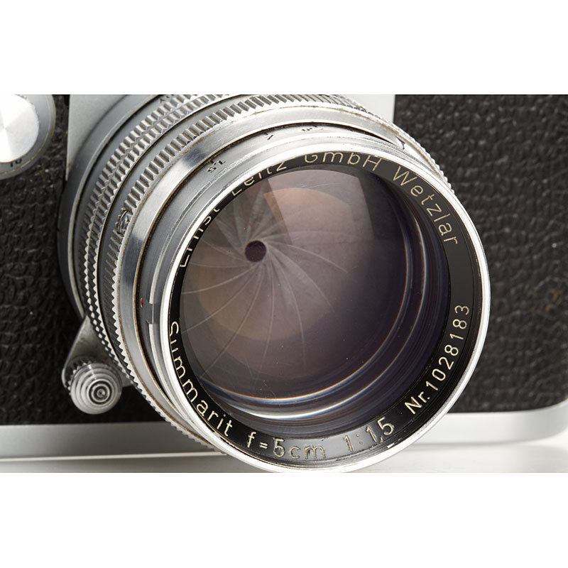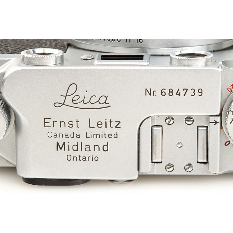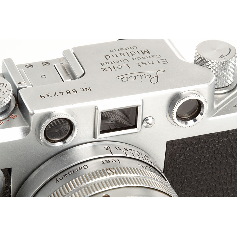 very rare IIIf body with self timer in perfect, original condition, top plate engraved 'Ernst Leitz Canada Limited Midland Ontario', with early Wetzlar Summarit 1.5/5cm no.1028183 (N.Y. Filter), only small batches of the IIIf were prepared by Leitz Canada and engraved with the name of the Canadian manufacturer, camera no.684768 is shown in Lager I p.69