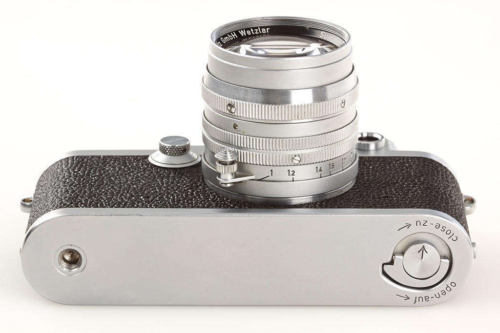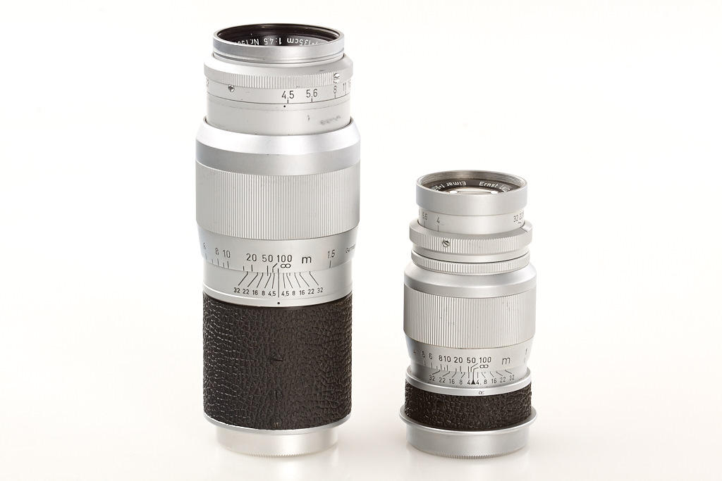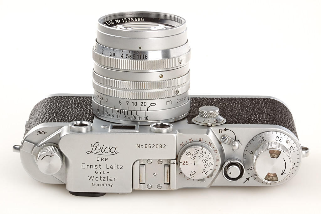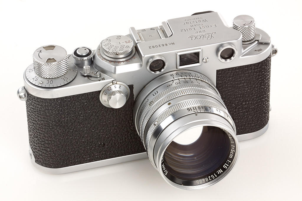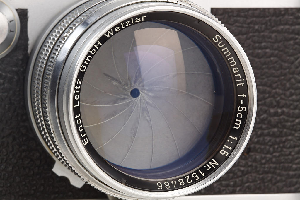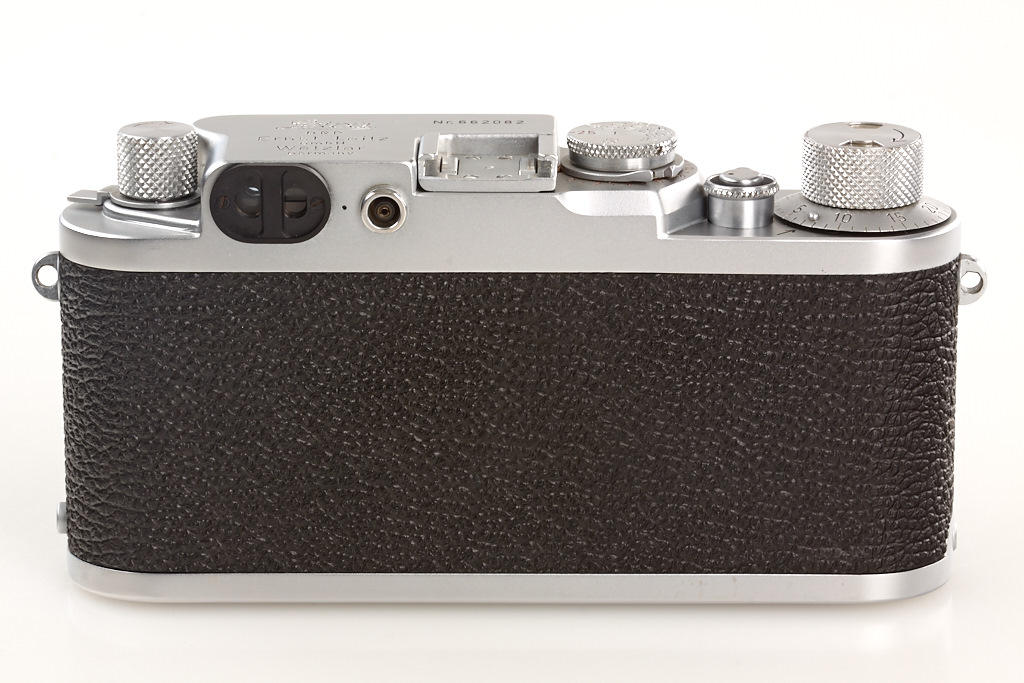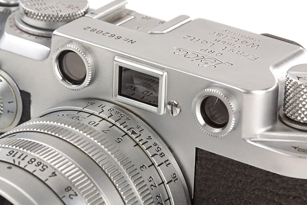 body in near mint condition and good working order with Summarit 1.5/5cm no.1528486, Elmar 4/9cm no.1382072 (hazy, caps), Hektor 4.5/13.5cm no.1506245 (yellow filter, caps), VIOOH universal finder no.78786, Chico flash unit in keeper